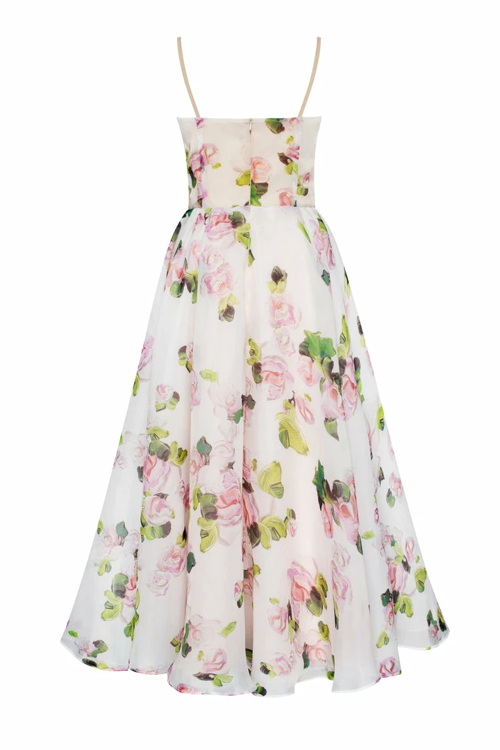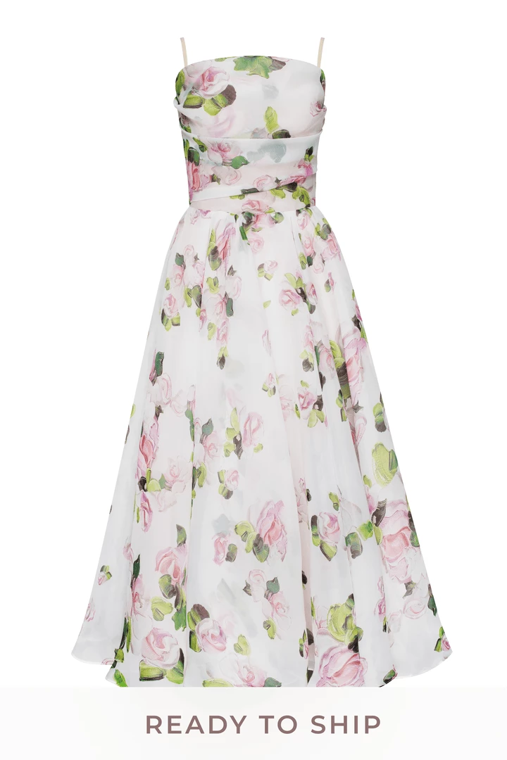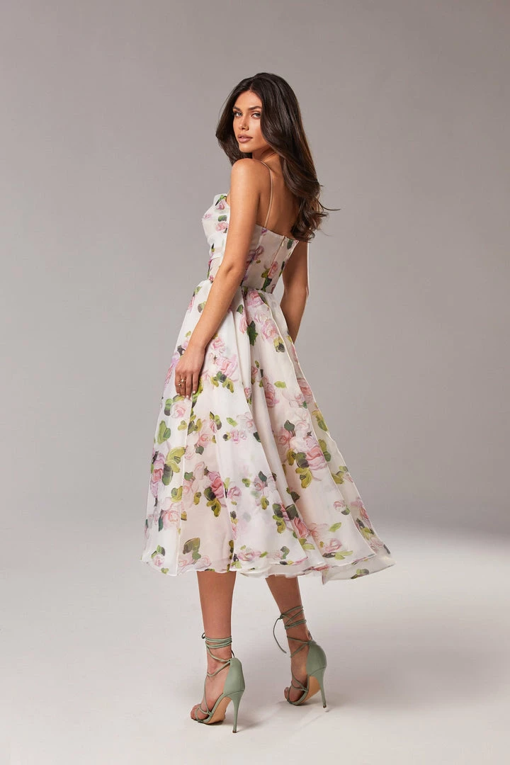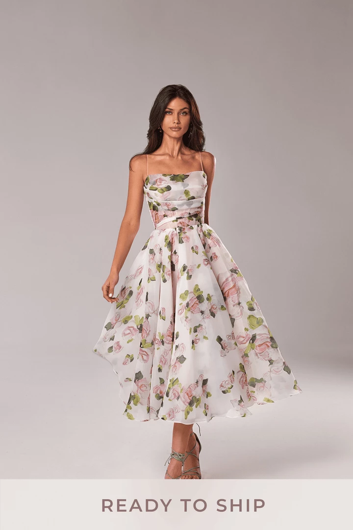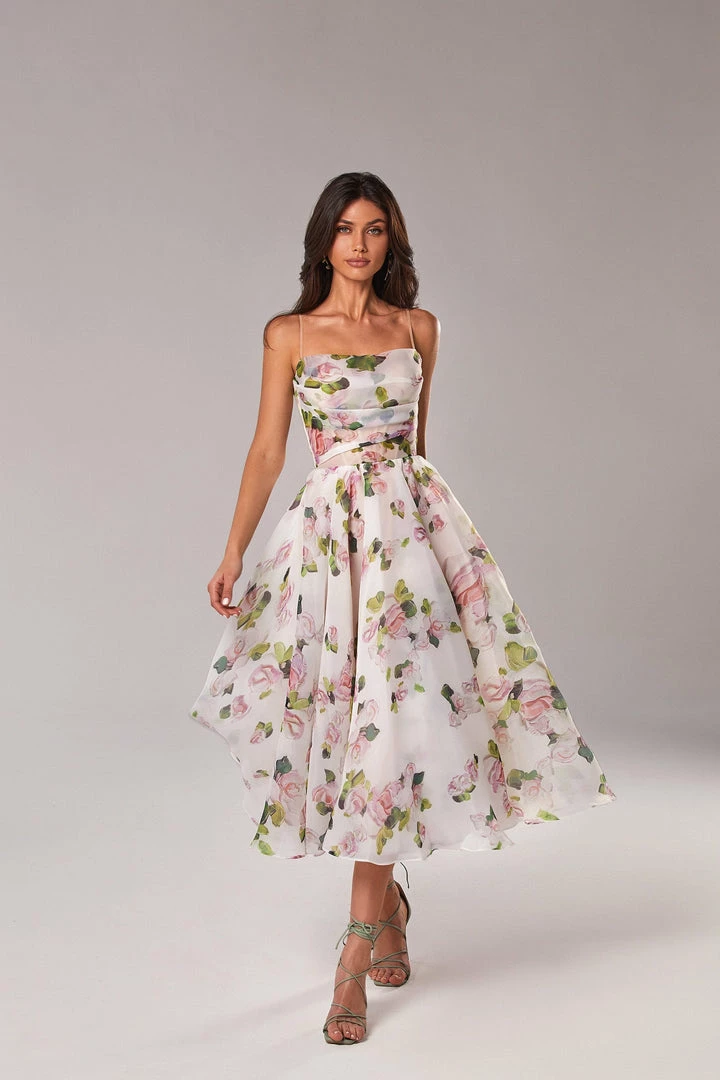 Tender spaghetti strap a-line midi dress with a flared full skirt and a ruched bodice. Features a