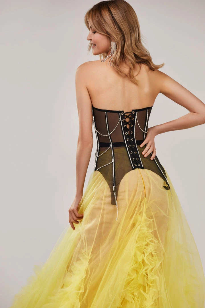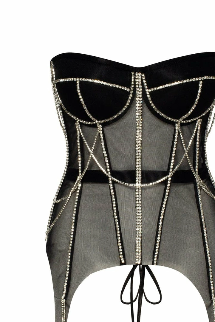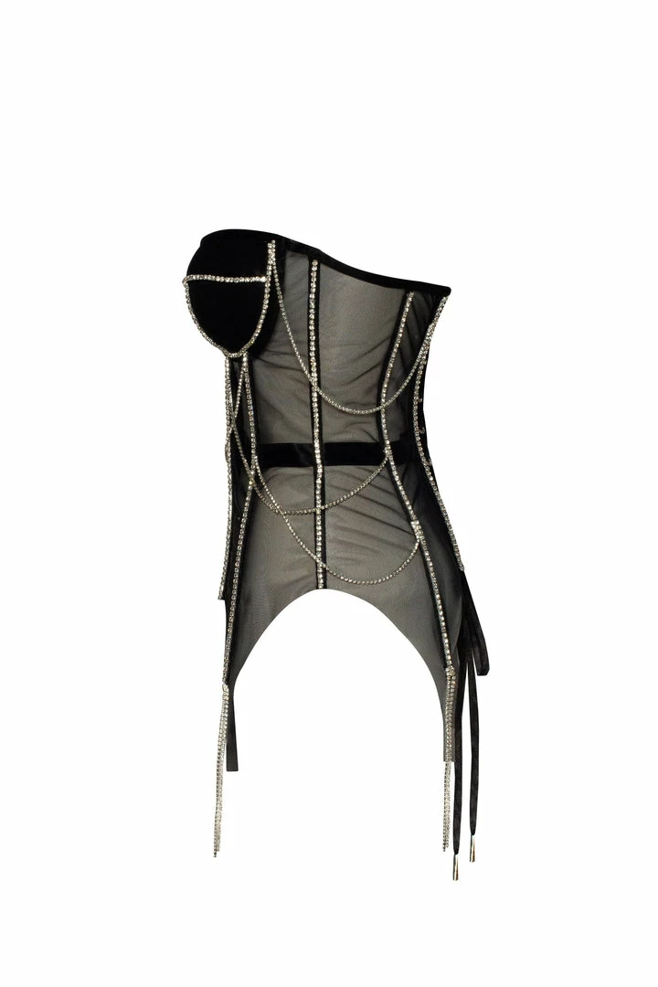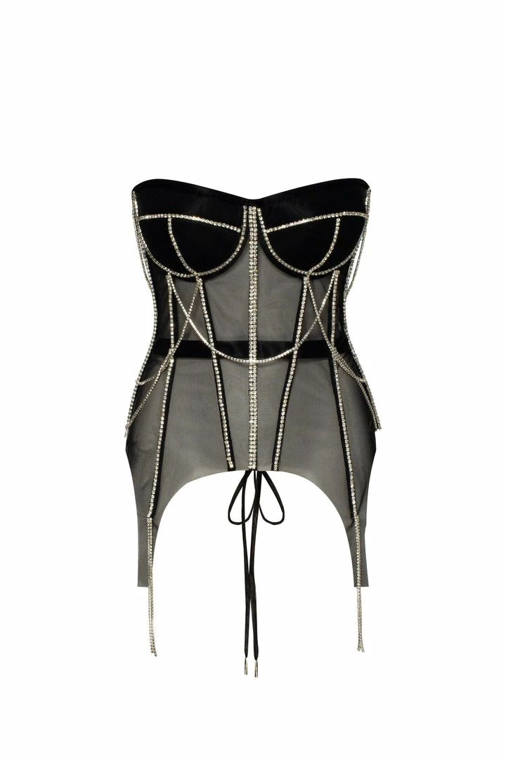 A Black transparent corset with shiny rhinestones is featured with a heart-shaped strapless bodice. The corset itself decorated with dozens of tiny shiny rhinestones has built-in cups and lace-up closure. It is all about details: heart-shaped neckline and open back underline the shoulder and clavicle lines. These nuances create an amazing tight-fit silhouette. Goes in black colour.