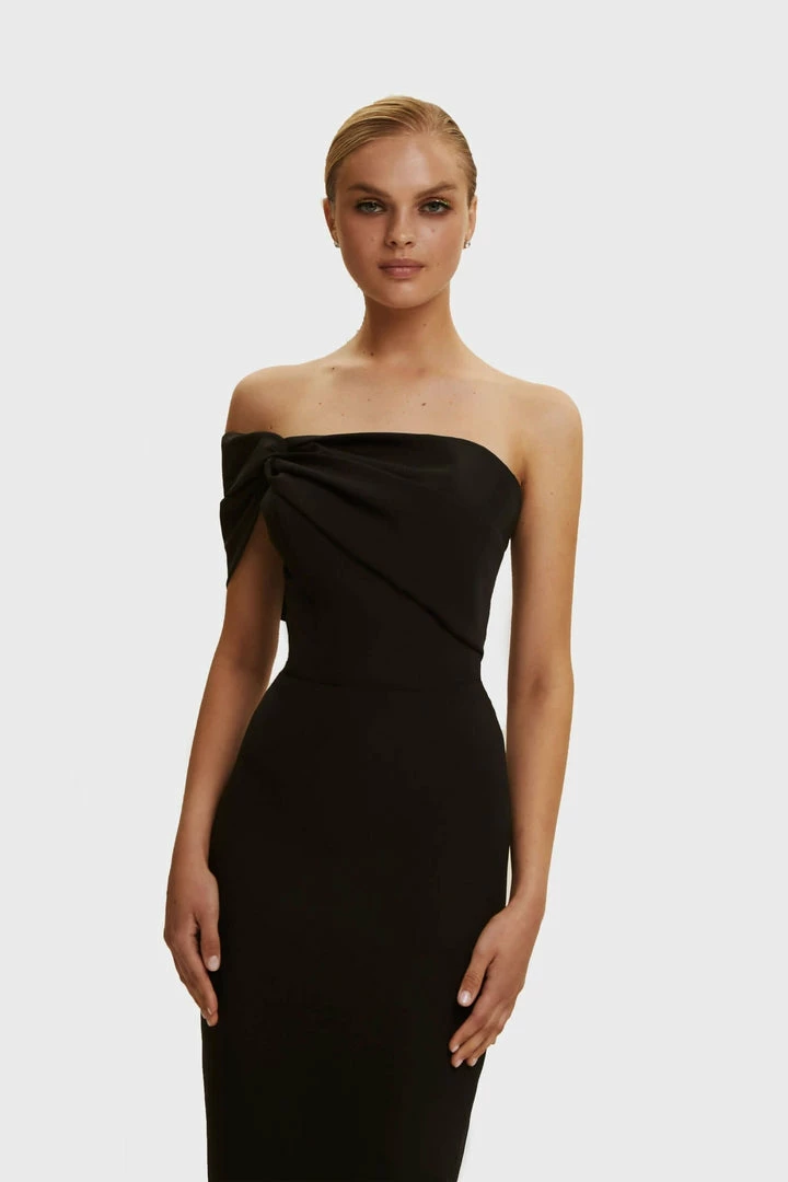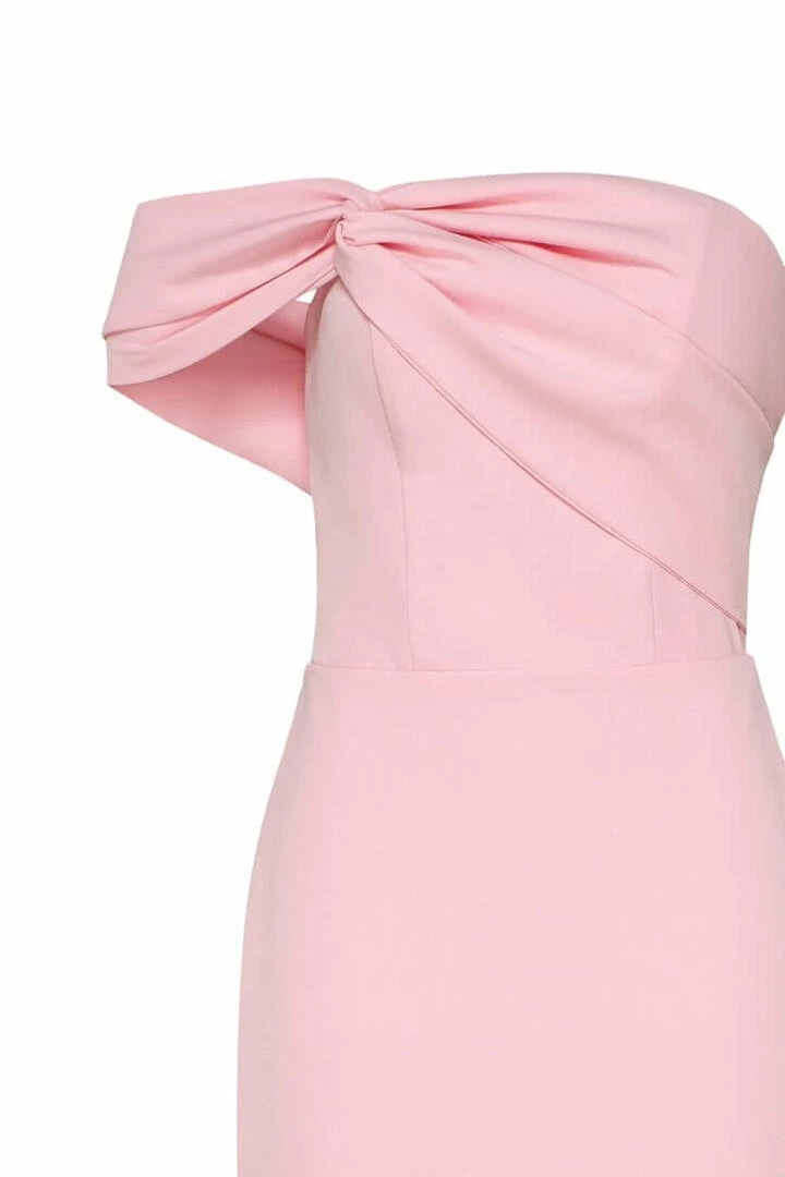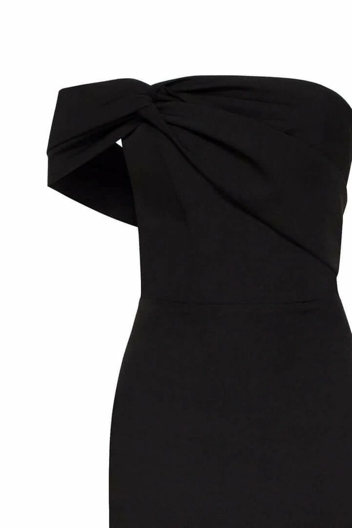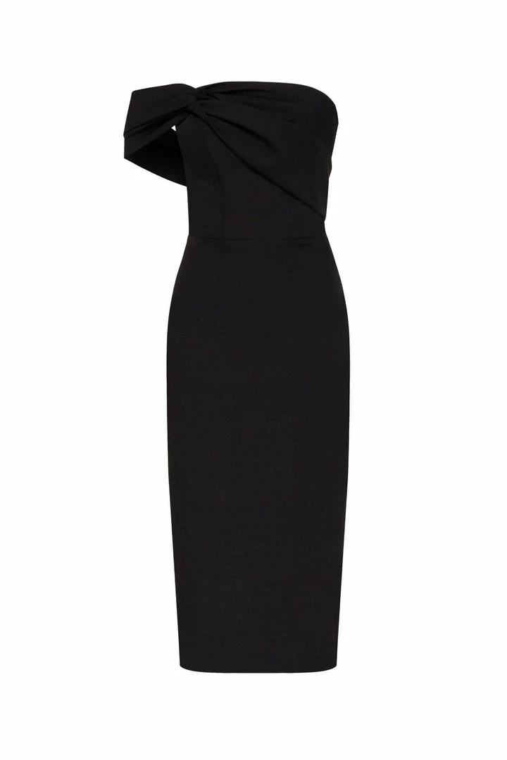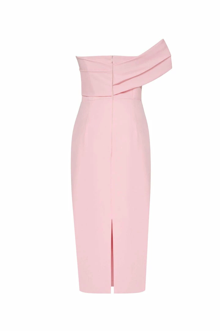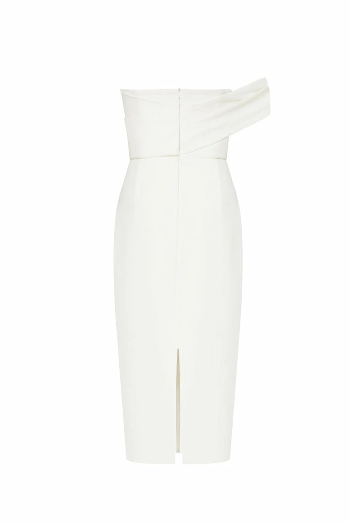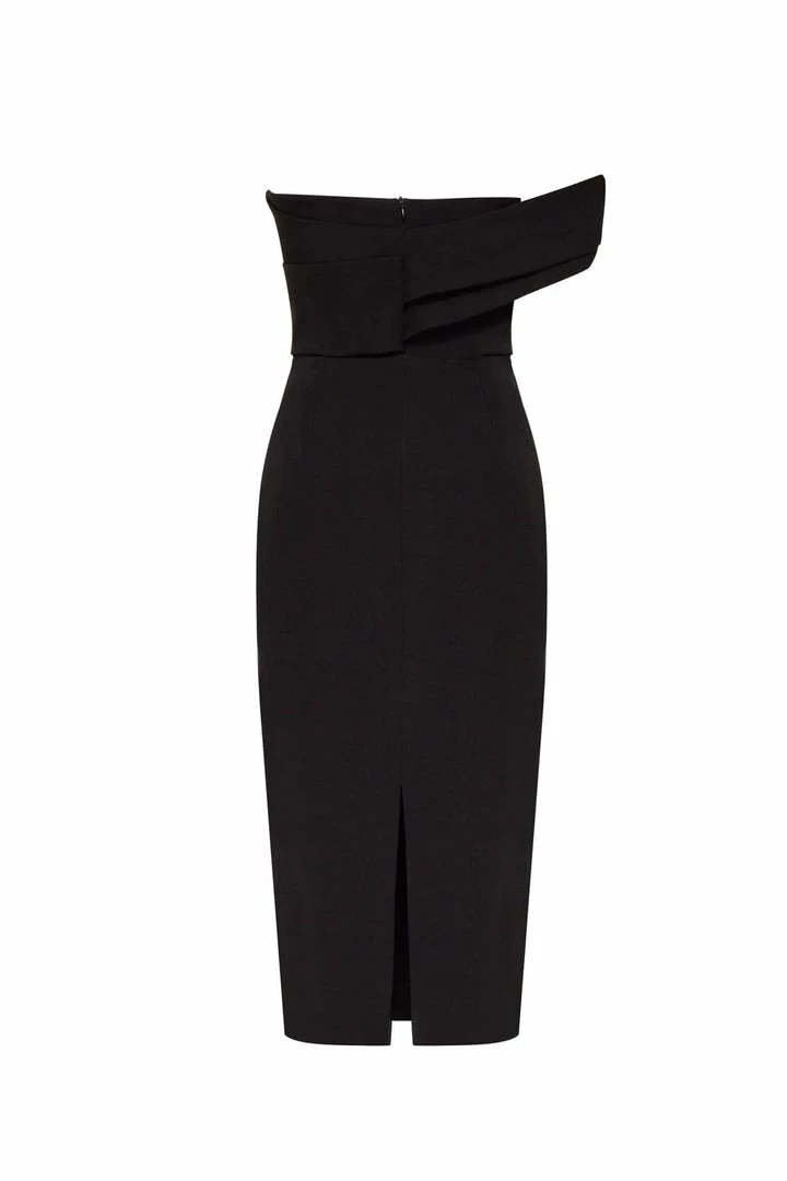This straight midi tight-fitting evening Milla dress features a strapless design from a stunning gabardine fabric. Designed with a zip closure at the back, asymmetrical small ruched bust knot-alike detail flows into an off-the-shoulder one sleeve. Such a classy and simple evening dress!