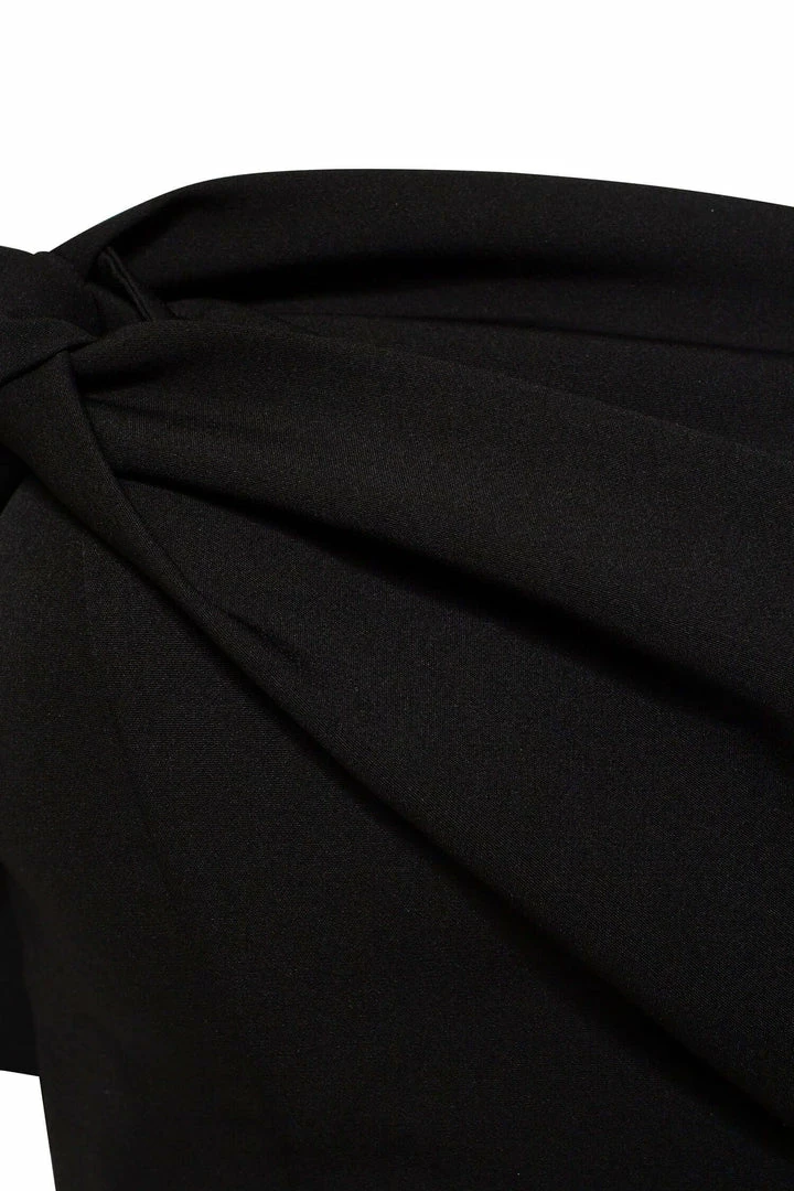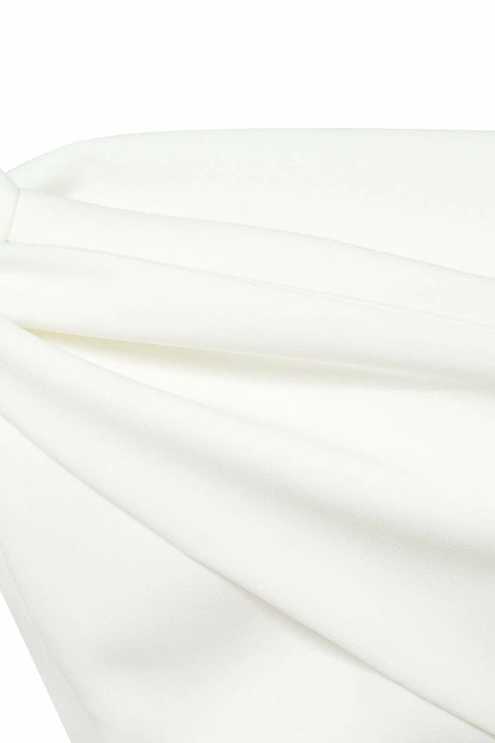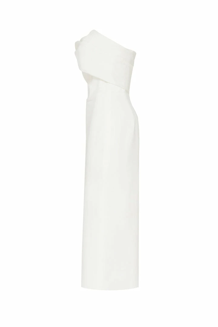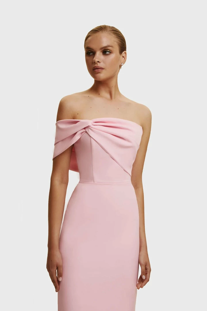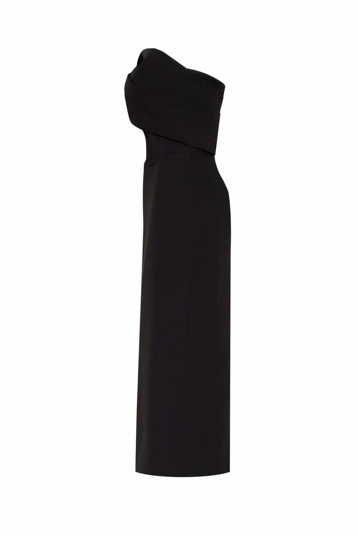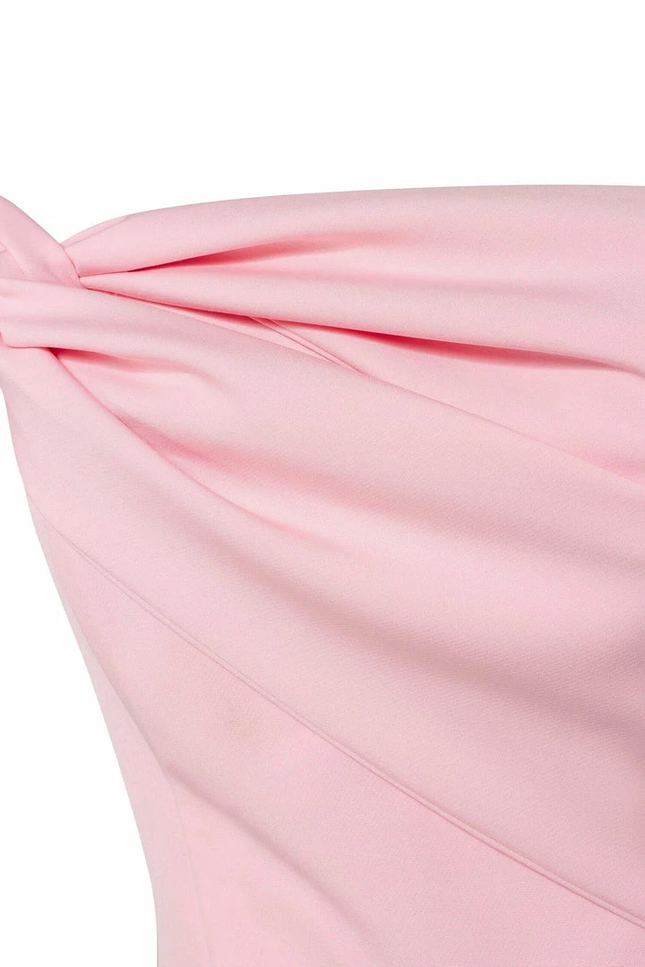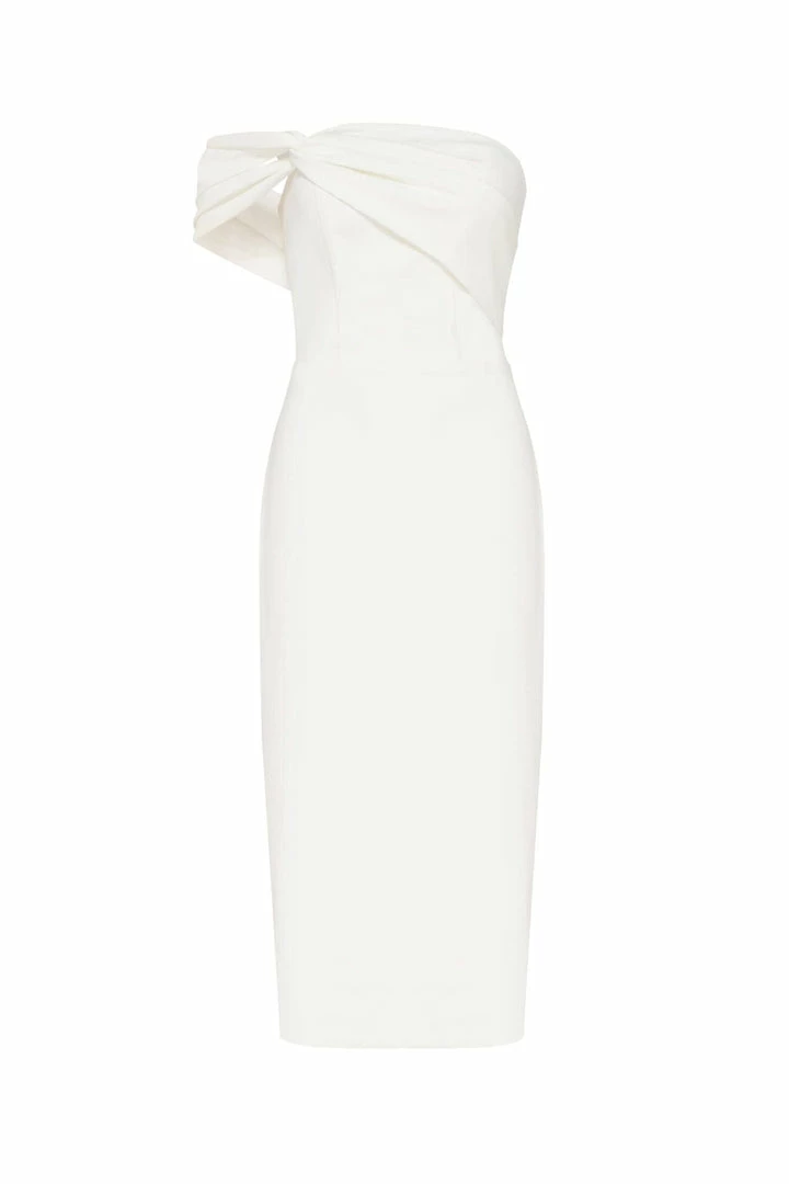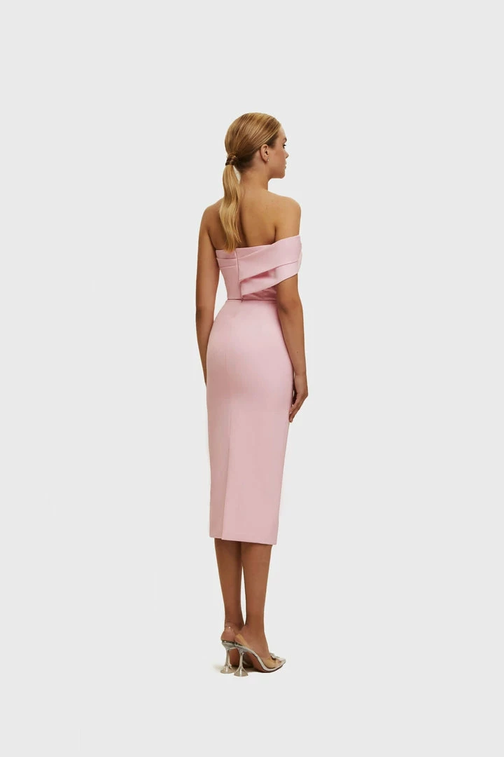 This straight midi tight-fitting evening Milla dress features a strapless design from a stunning gabardine fabric. Designed with a zip closure at the back, asymmetrical small ruched bust knot-alike detail flows into an off-the-shoulder one sleeve. Such a classy and simple evening dress!