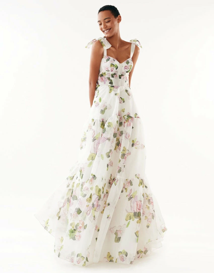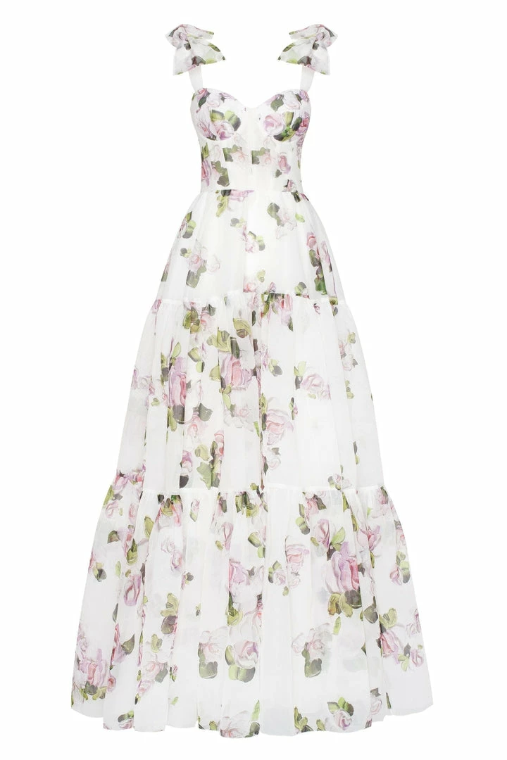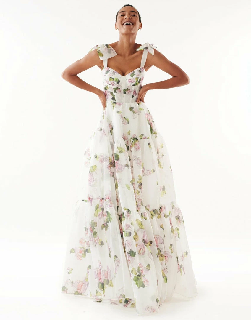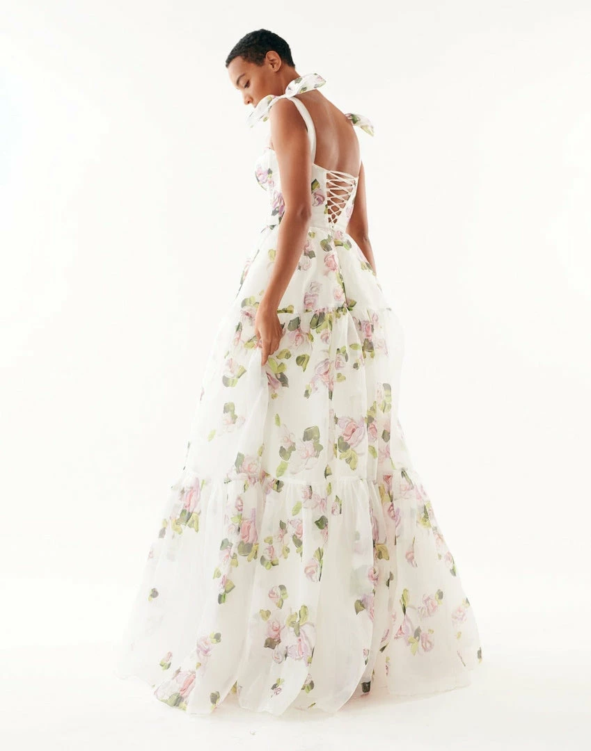 Prom tender tie-strap maxi dress with a tiered full skirt and a lace-up corset bodice. Features delicate pastel floral print.