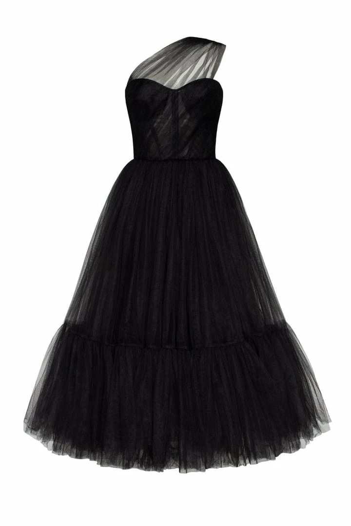 Feminine one-shoulder combination a-line midi dress with a semi-transparent corset bustier and tulle midi skirt.