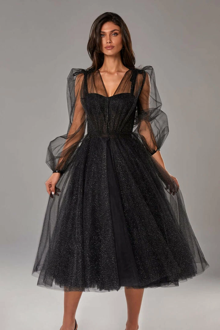 Breathtaking tie shoulder sparkly tulle dress featured with semi-transparent corset bustier, puffy midi skirt, and lace-up closure. The gown is made of sparkly tulle and lace. The dress is decorated with a heart-shaped neckline in the front and lacing back. Complemented with a sparkly black cape, which comes with voluminous sheer puffy long sleeves. It can be ordered in black.
