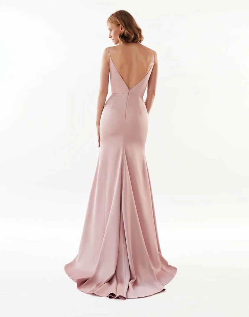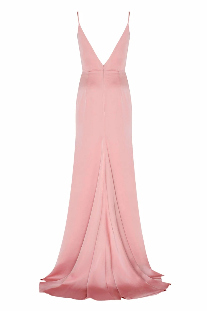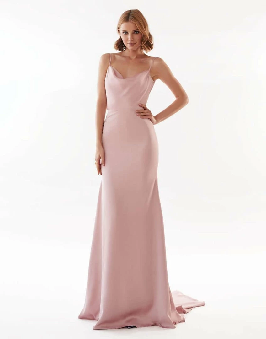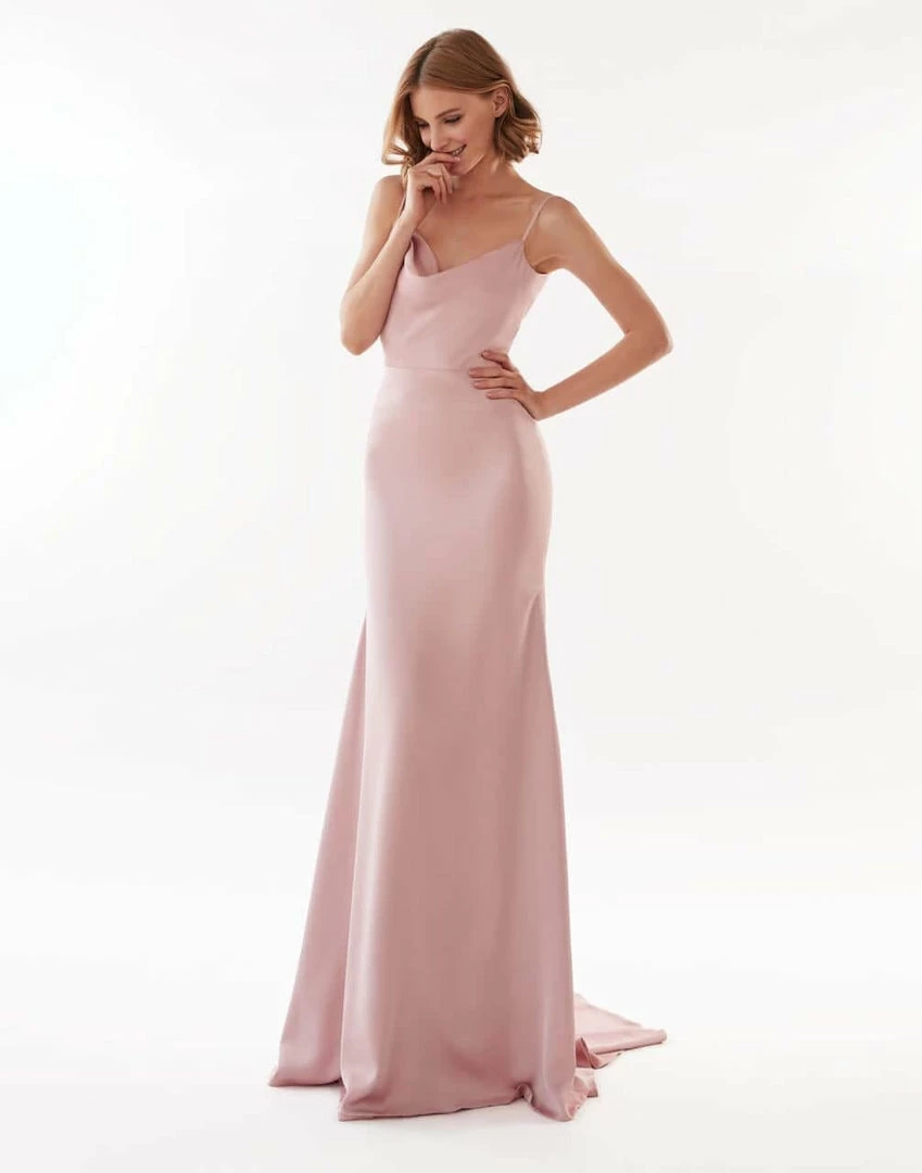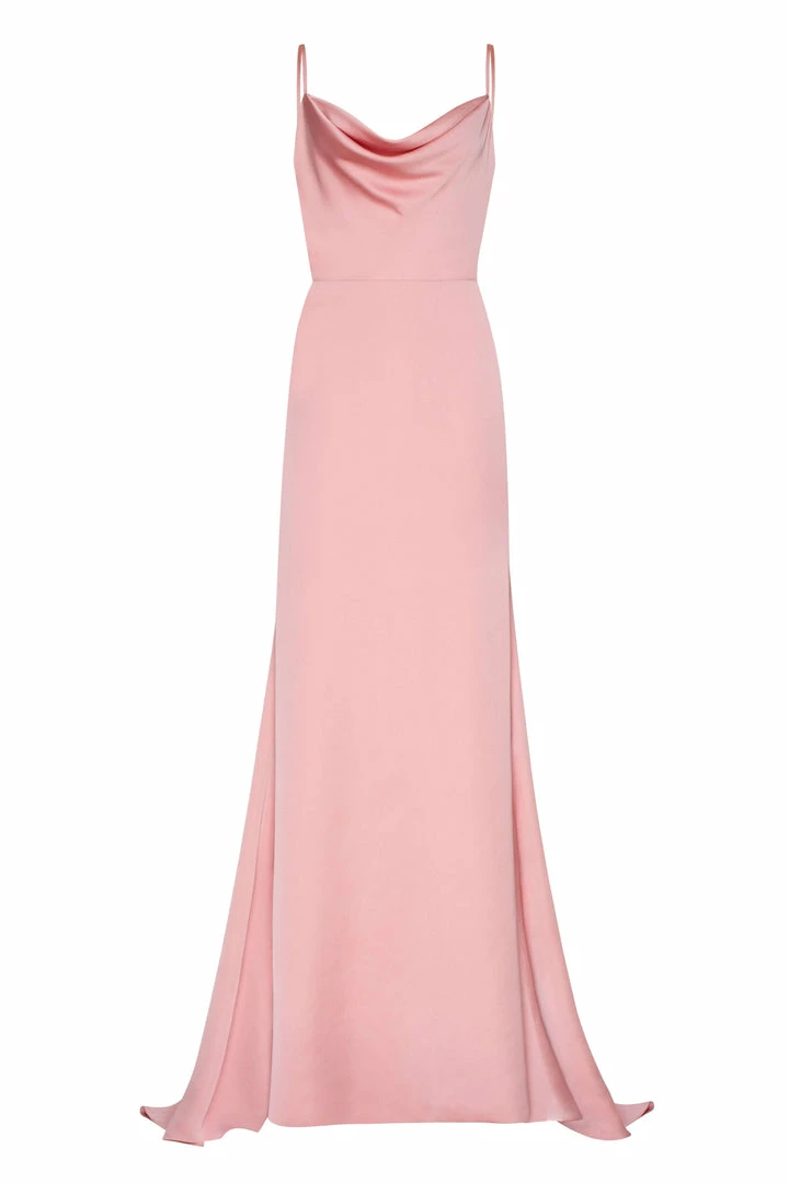 Delicate cowl neck slip dress with an open back, maxi skirt, and flaring mermaid hem.