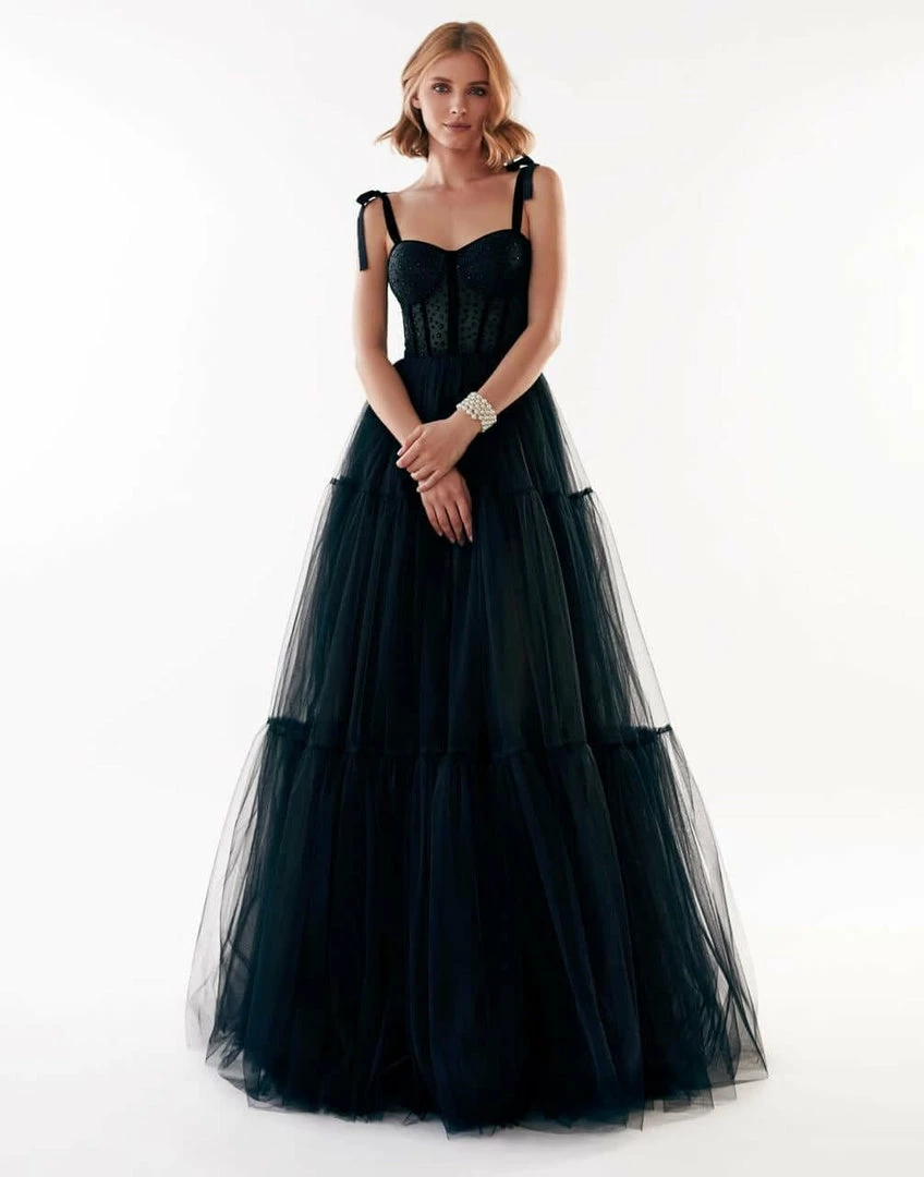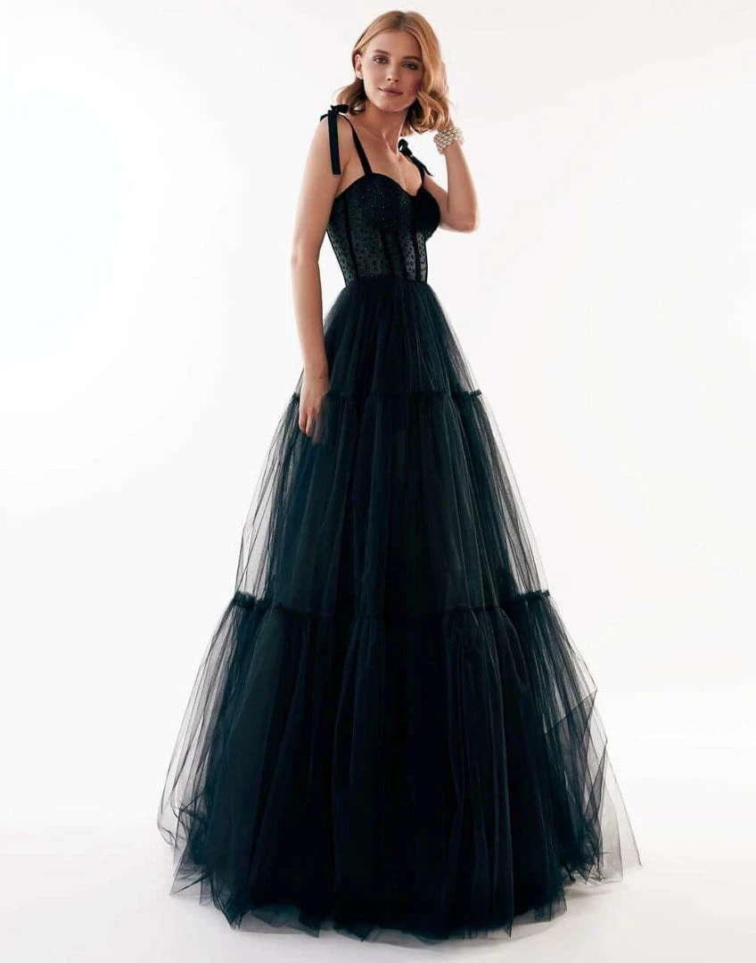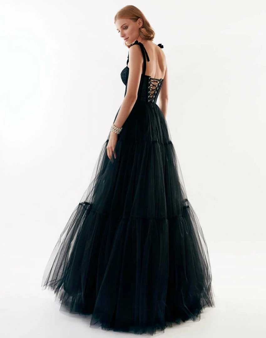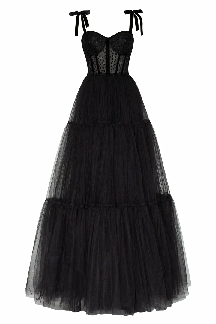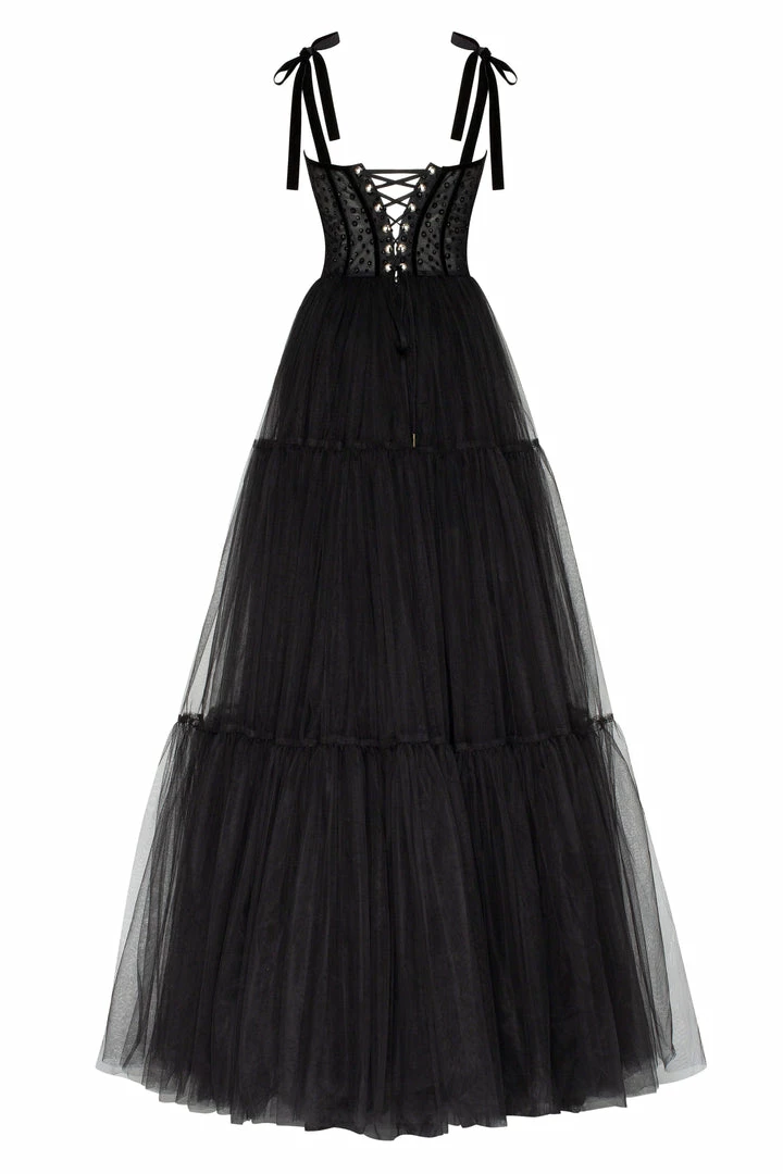 Tender tie-strap maxi tulle tie strap dress with an embellished corset bodice and a partially tiered full skirt.