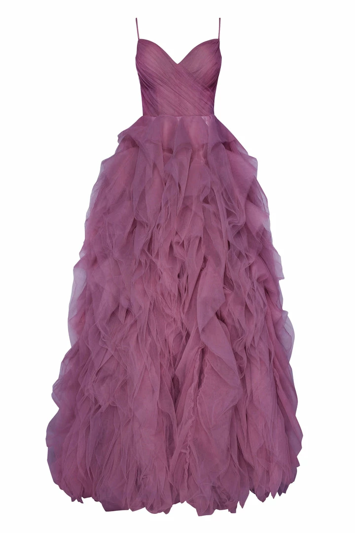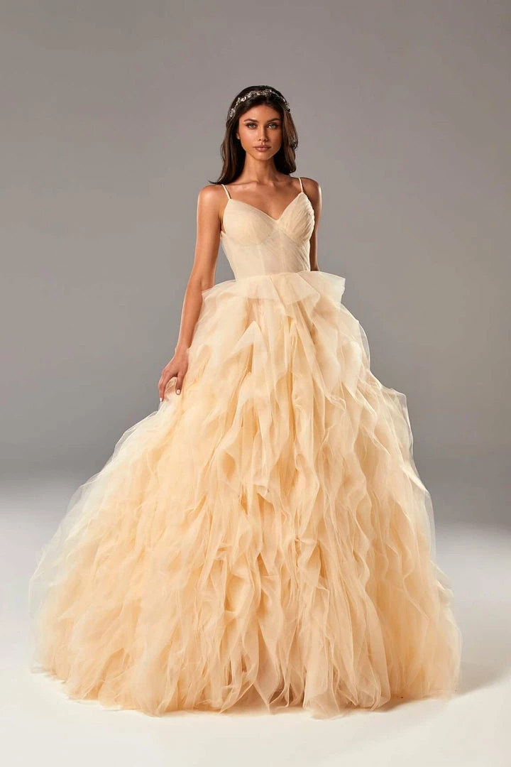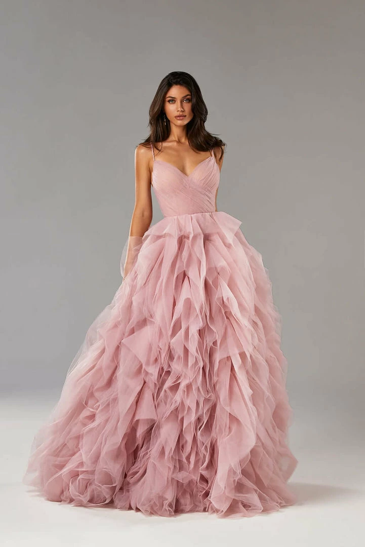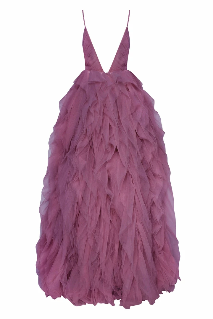 Dreamy evening maxi tulle puffy dress can make you a princess of the evening. The corset has build-in cups and a zipper on the back which makes it really fitted and elegant. The lovely heart-shaped neckline and open back are designed to emphasize the shoulders and arm lines. The ruched tulle bodice has spaghetti straps and is complemented with the frill layered maxi tulle skirt. The dress goes in misty rose, melon, and silver.