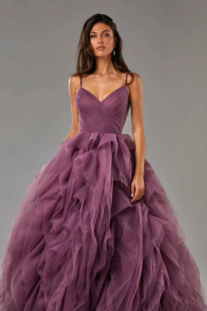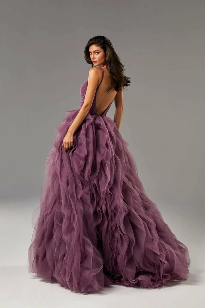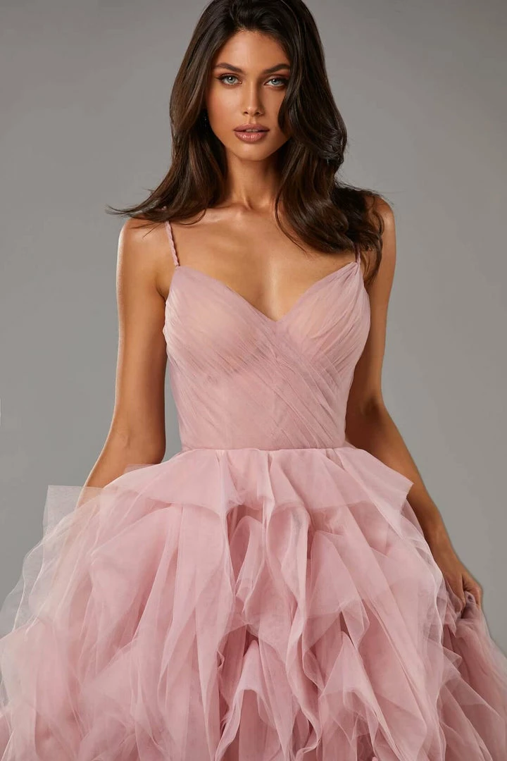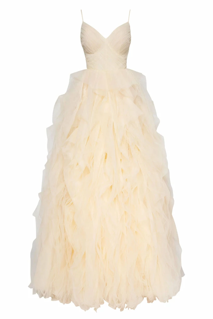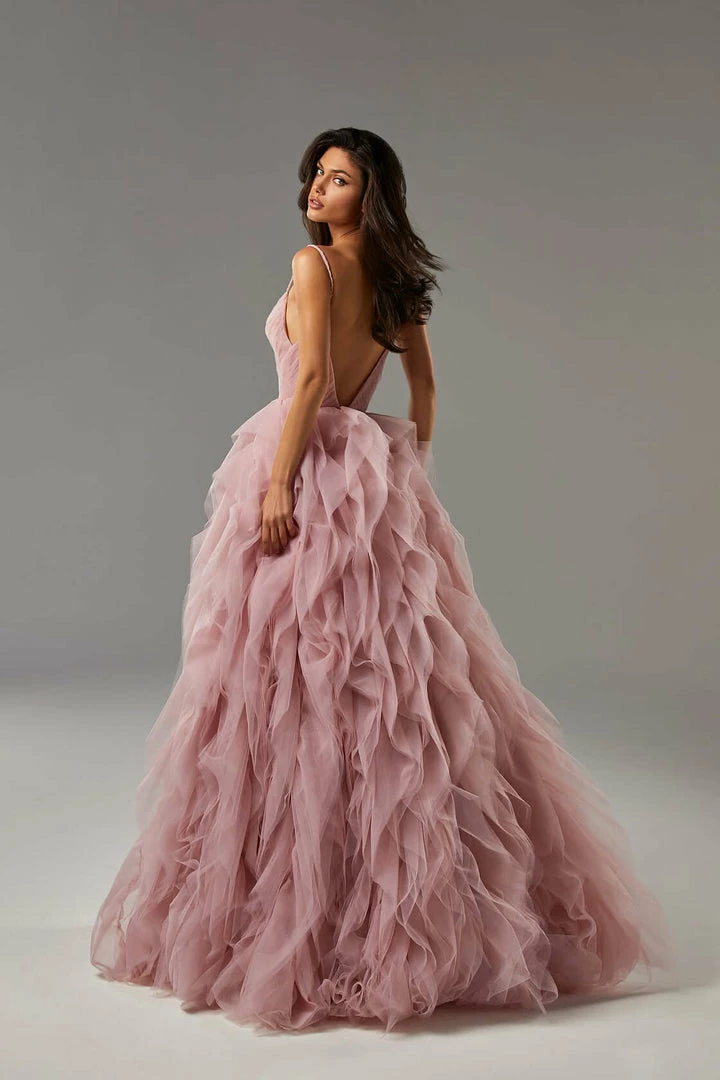 Dreamy evening maxi tulle puffy dress can make you a princess of the evening. The corset has build-in cups and a zipper on the back which makes it really fitted and elegant. The lovely heart-shaped neckline and open back are designed to emphasize the shoulders and arm lines. The ruched tulle bodice has spaghetti straps and is complemented with the frill layered maxi tulle skirt. The dress goes in misty rose, melon, and silver.