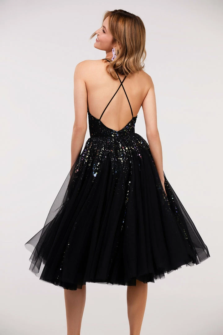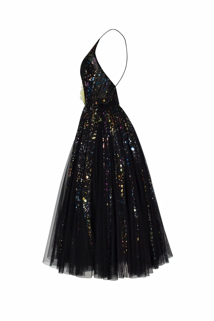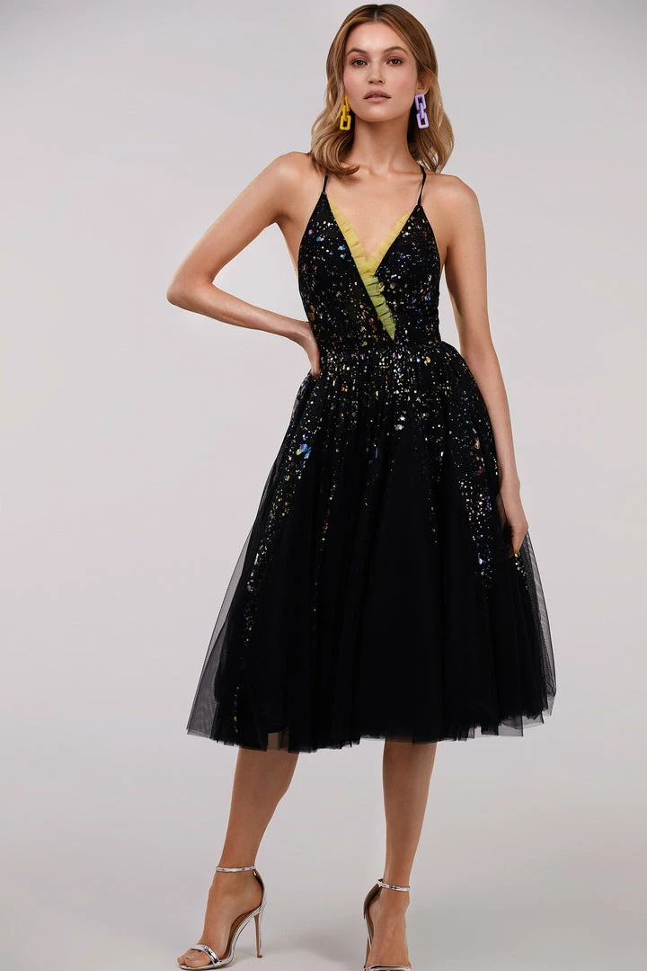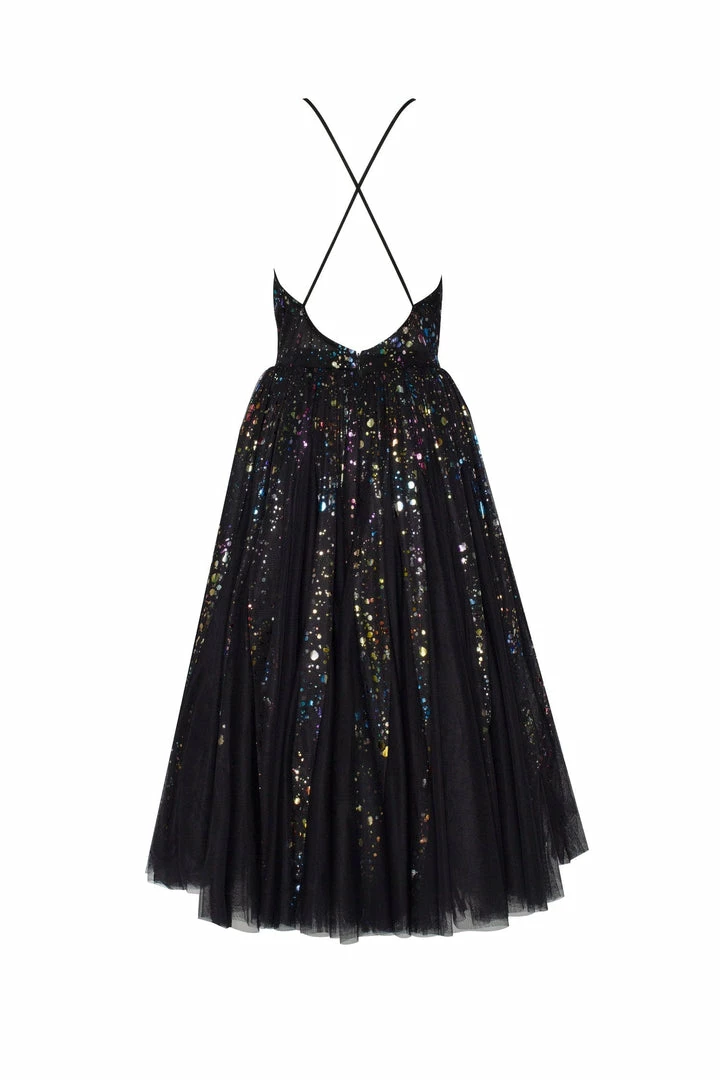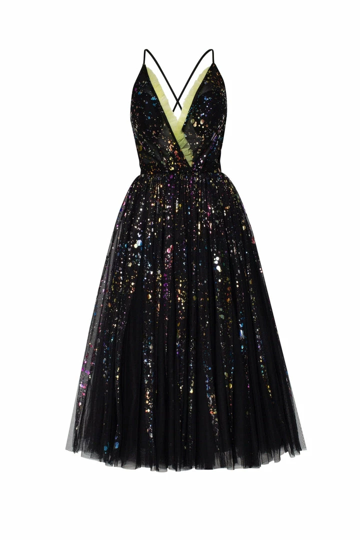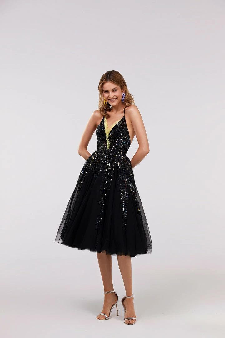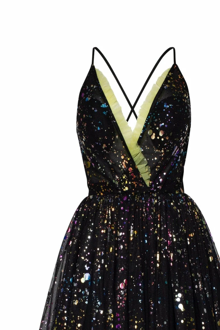 This exotic cocktail dress is made of black tulle fabric sprinkled with shiny rainbow pieces. The gown has an elegant A-silhouette midi skirt and spaghetti strap corset. The corset is designed with a V-neckline and decorated with lime-colored ruffles and a criss-cross open back. Goes in black.