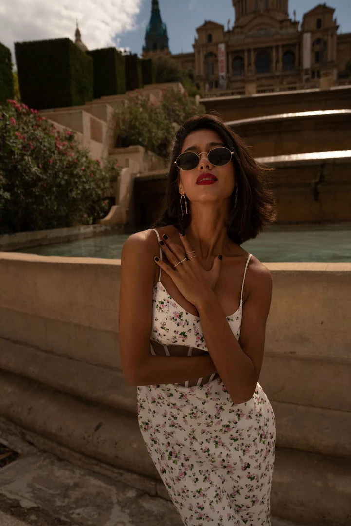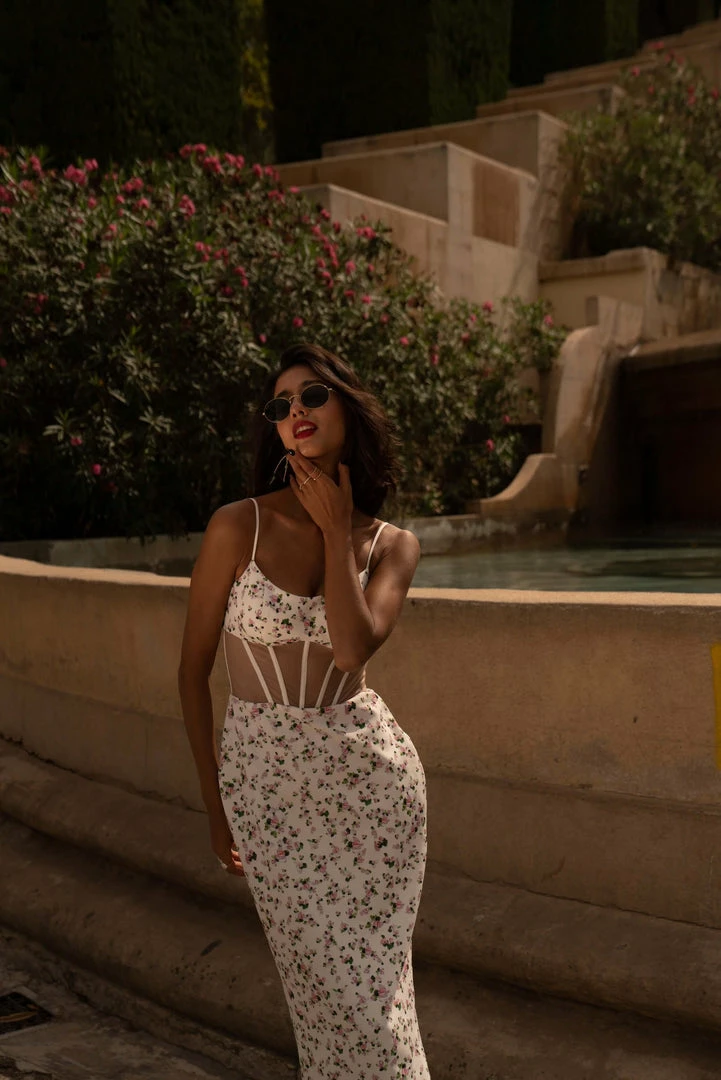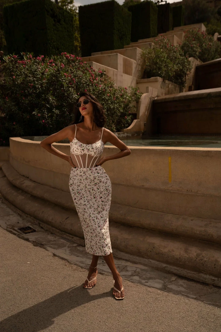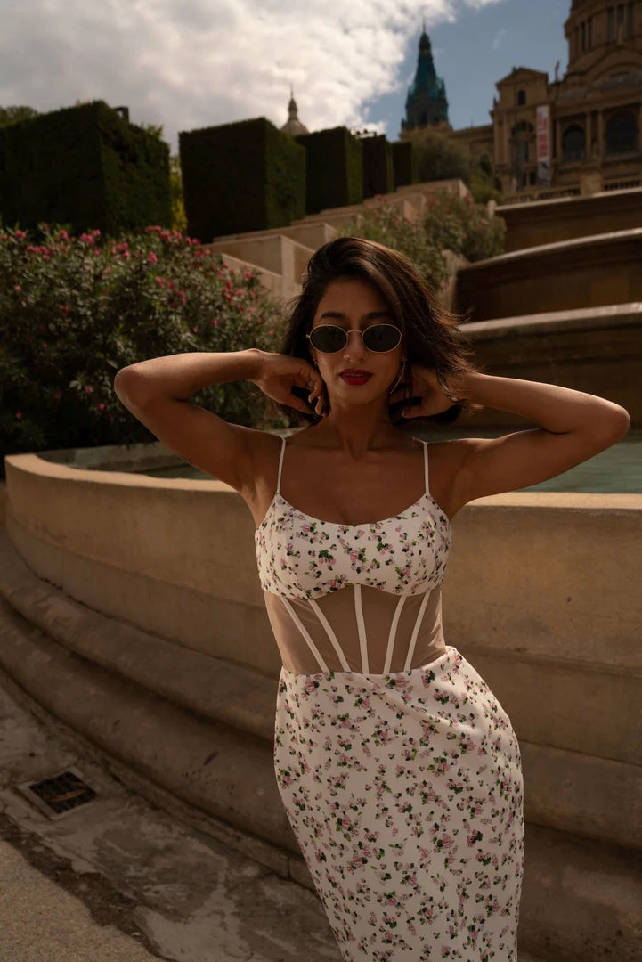 Feminine spaghetti-strap midi dress with a semi-transparent built-in corset and an open back. This is a perfect outfit for a picnic, voyage, resort, and summer vacation.