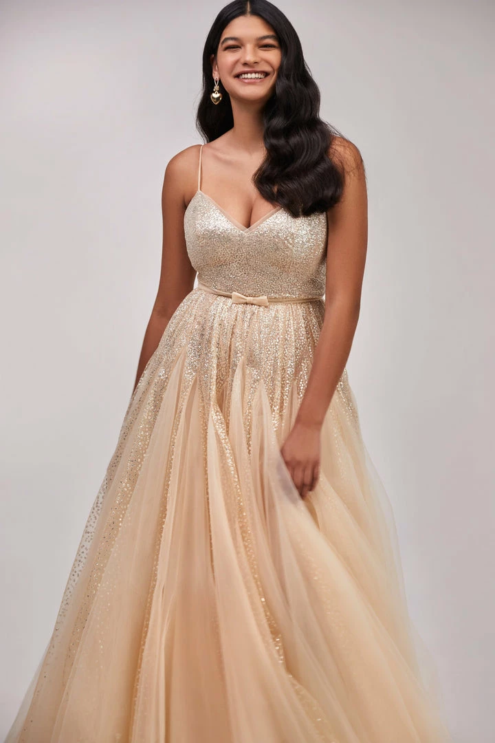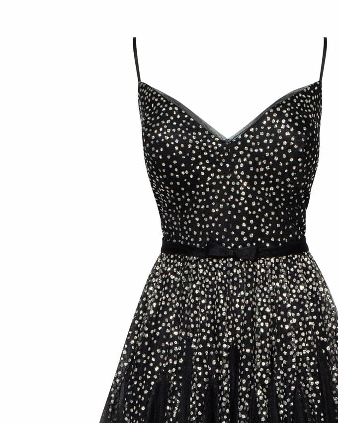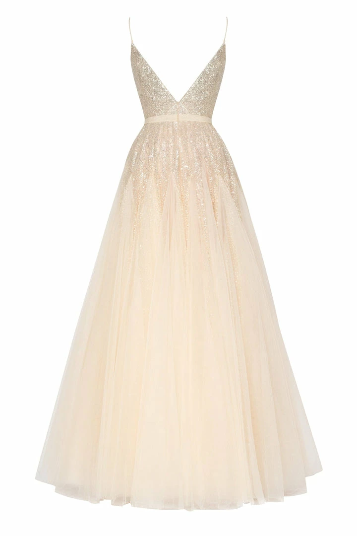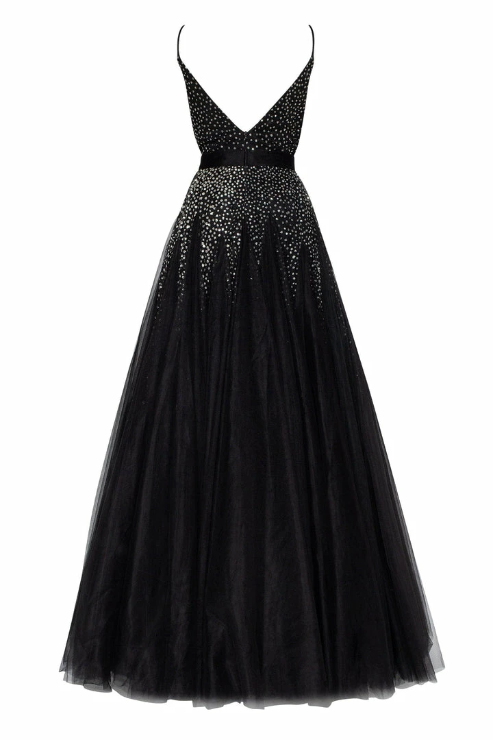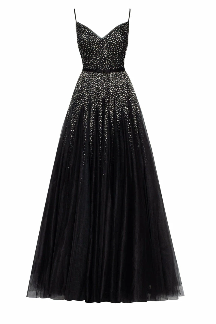 This Milla evening maxi gown is overly romantic, designed both for teens and adult girls and women. Designed with a puffy tulle skirt, which creates a perfect princess silhouette. Features bodice with an elegant open back, delicate spaghetti straps, and beautiful V-neck neckline. The gown is made from gorgeous high-quality tulle fabric with sparkly print on it. Designed in two colors black and melon.