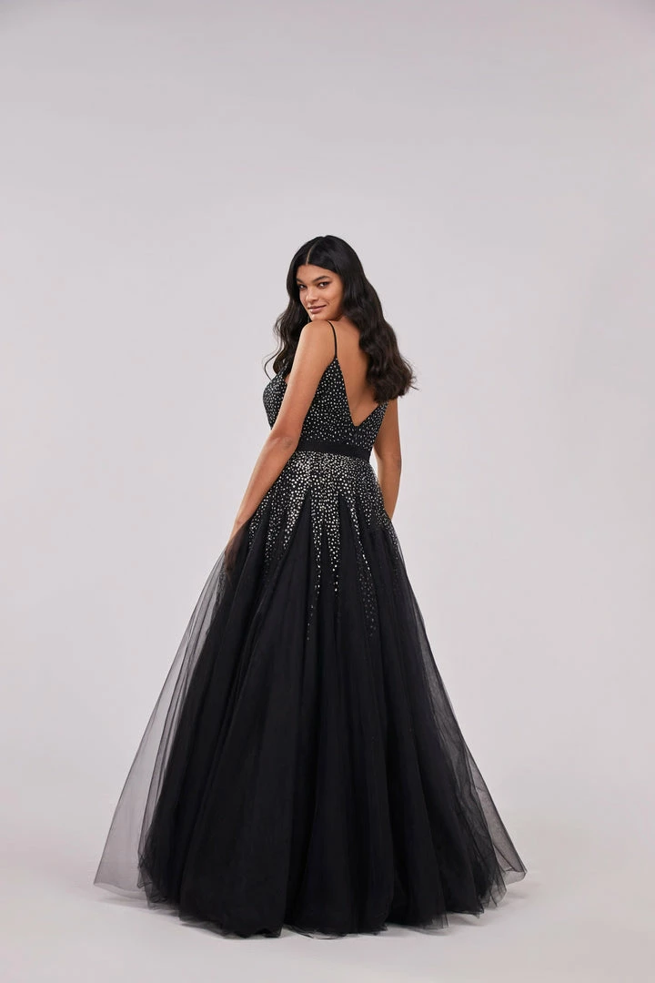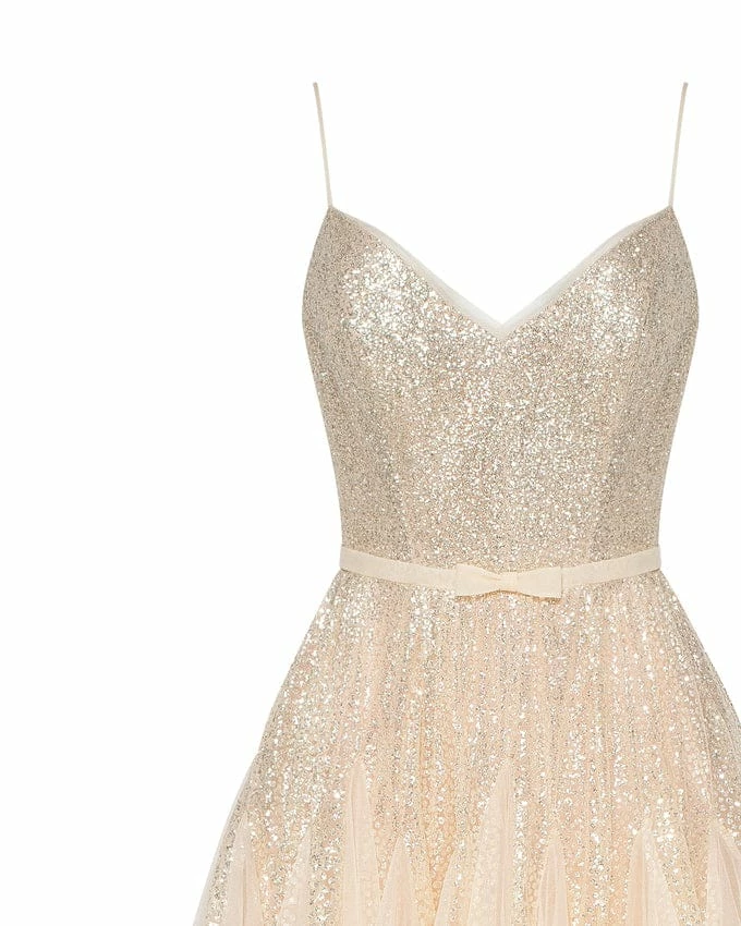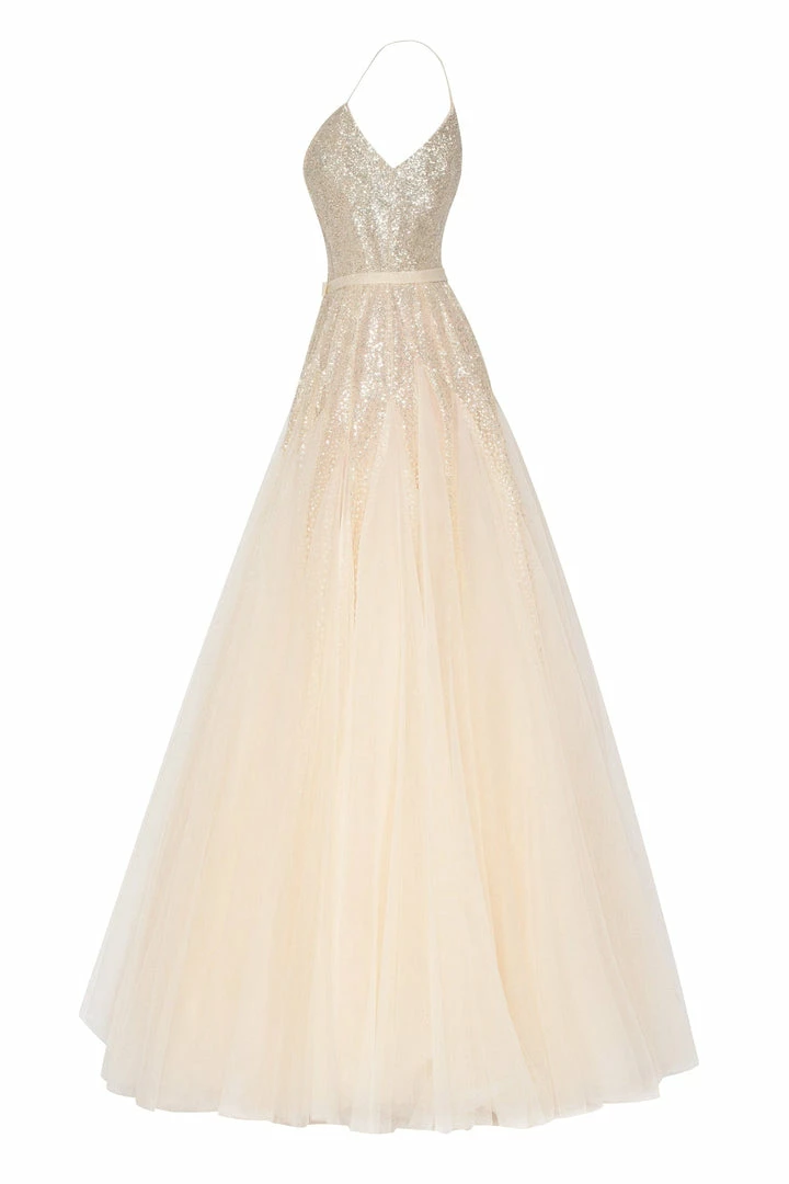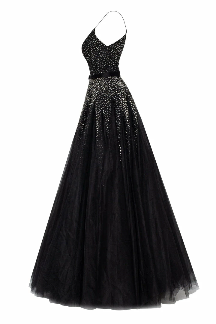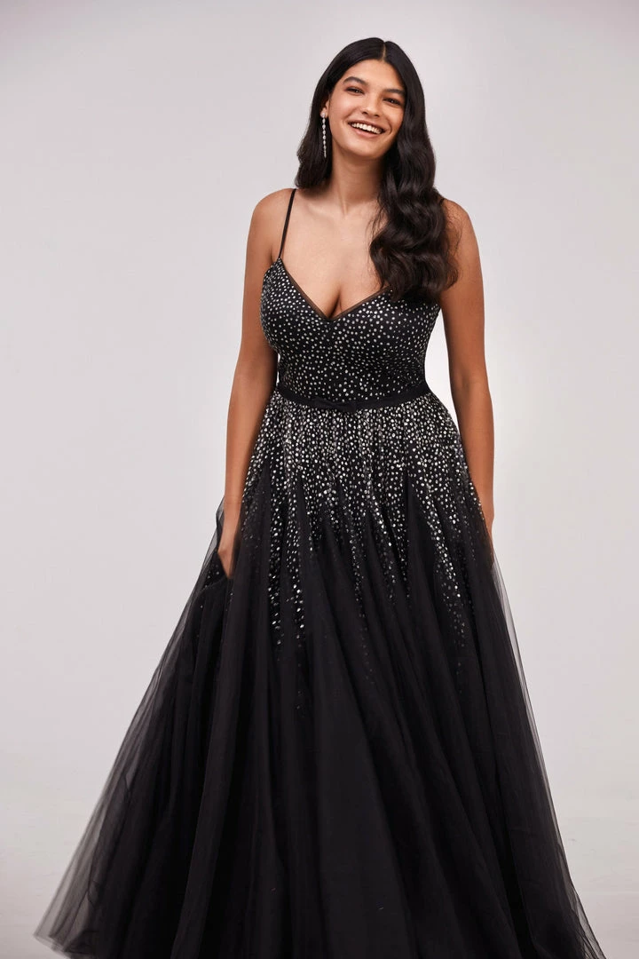This Milla evening maxi gown is overly romantic, designed both for teens and adult girls and women. Designed with a puffy tulle skirt, which creates a perfect princess silhouette. Features bodice with an elegant open back, delicate spaghetti straps, and beautiful V-neck neckline. The gown is made from gorgeous high-quality tulle fabric with sparkly print on it. Designed in two colors black and melon.