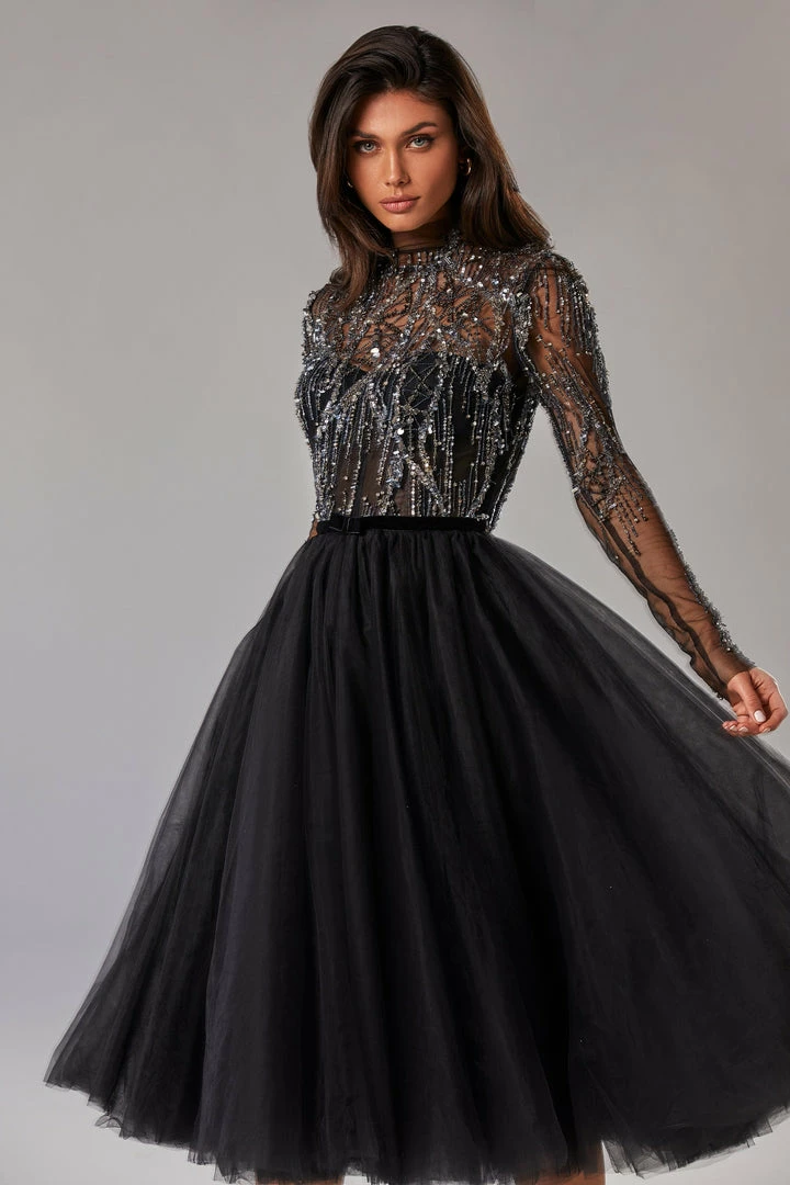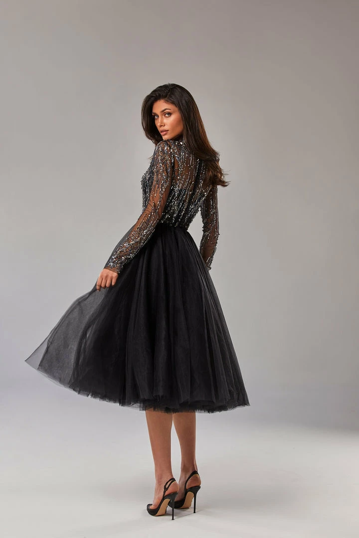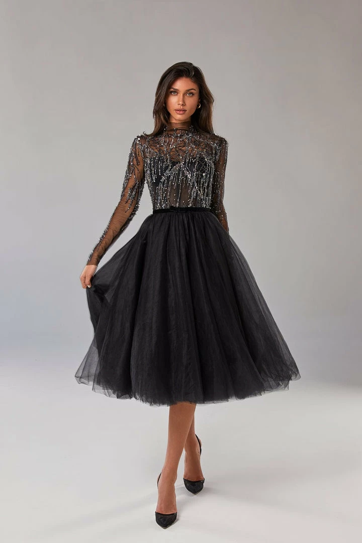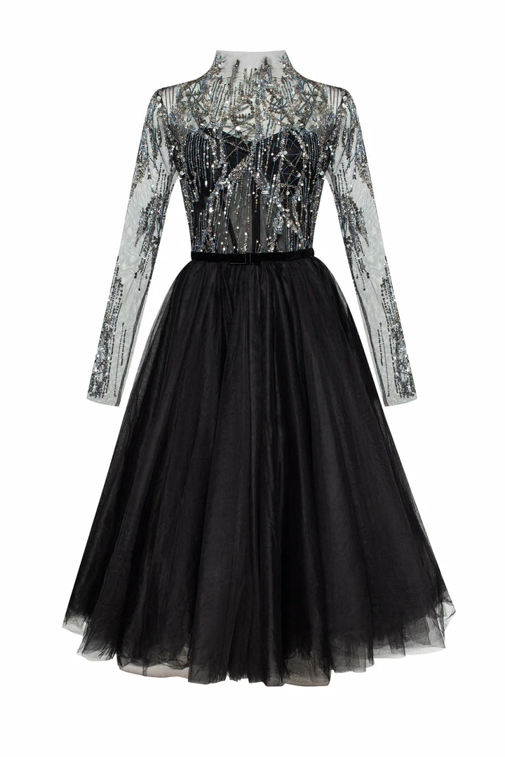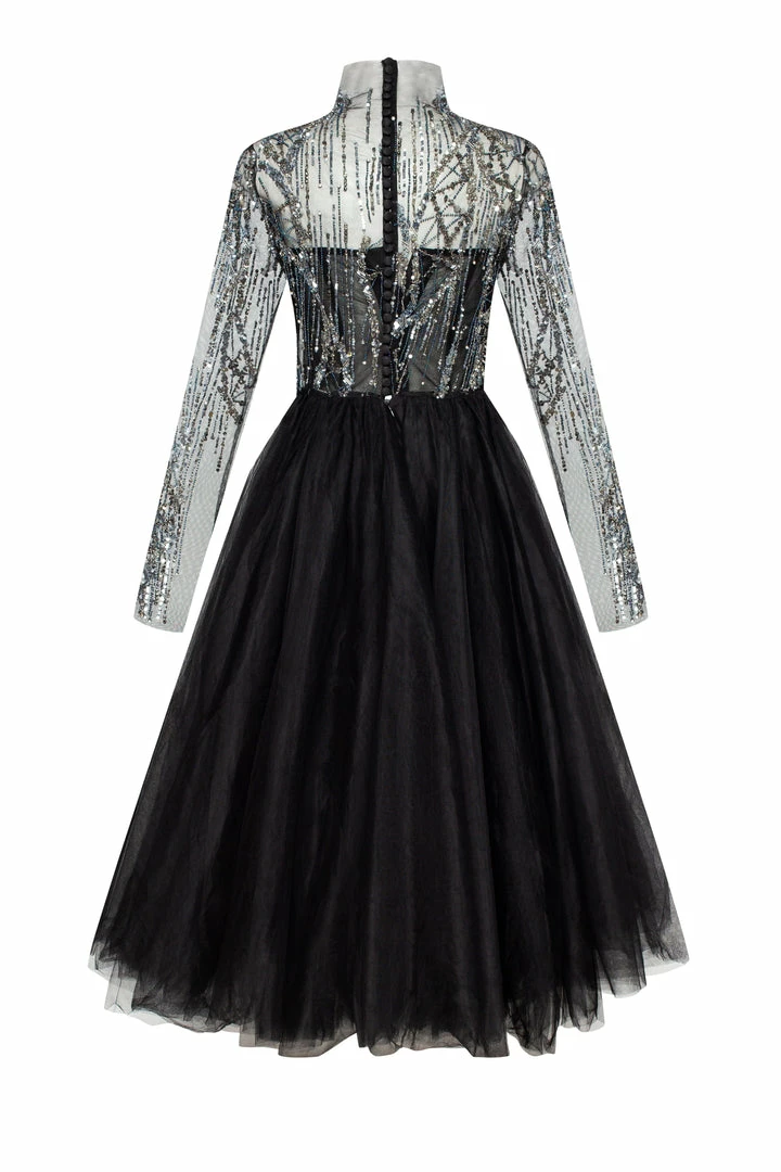 Gorgeous combination party midi dress with a semi-transparent corset bustier and puffy tulle skirt in black. Complemented with a long-sleeved sheer overlay blouse, embellished with silver beads.