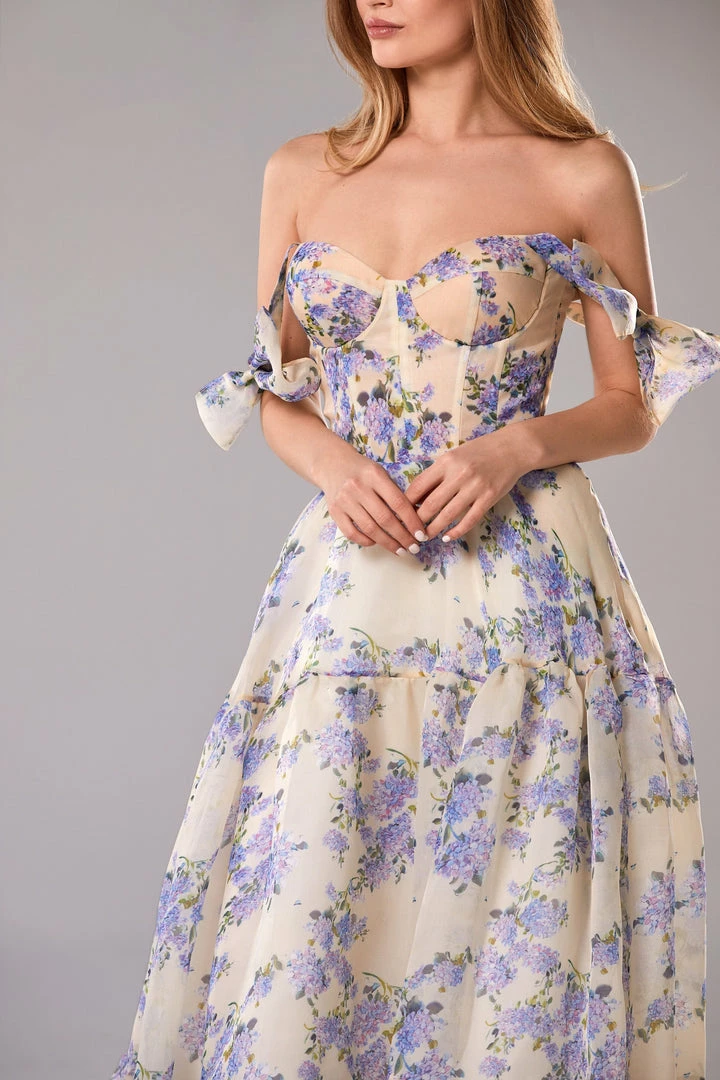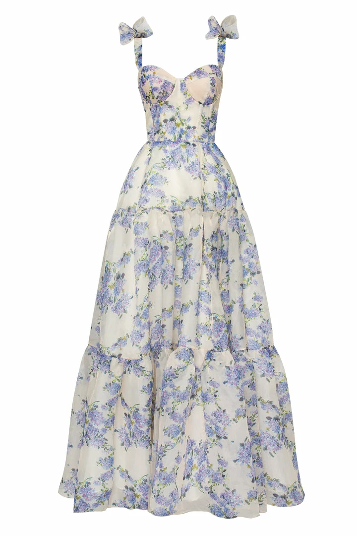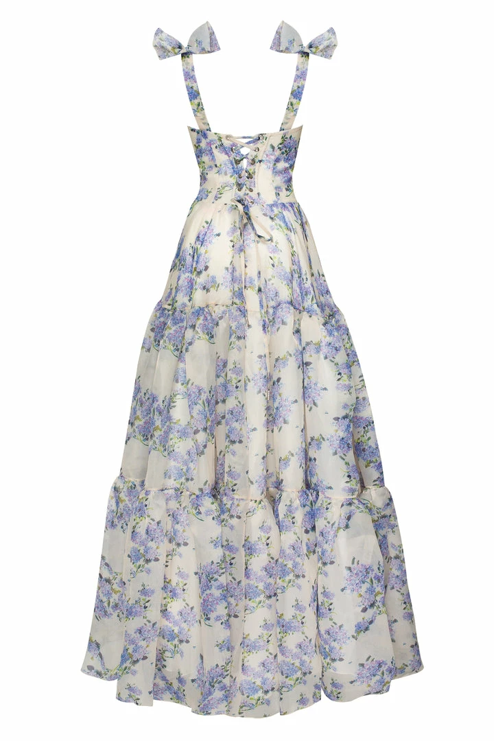 Prom tender tie-strap maxi dress with a tiered full skirt and a lace-up corset bodice. Features delicate pastel floral print.