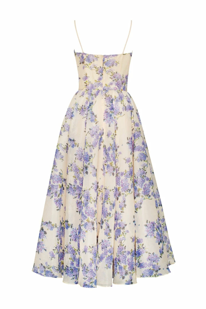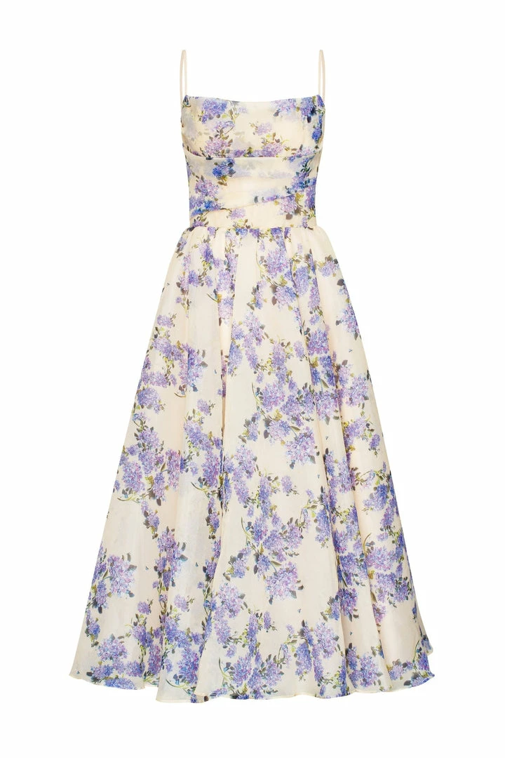 Tender spaghetti strap a-line midi dress with a flared full skirt and a ruched bodice. Features a