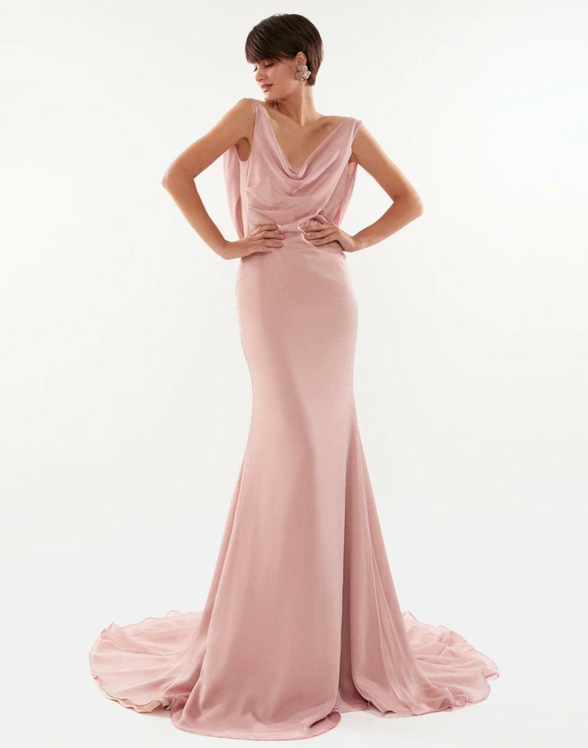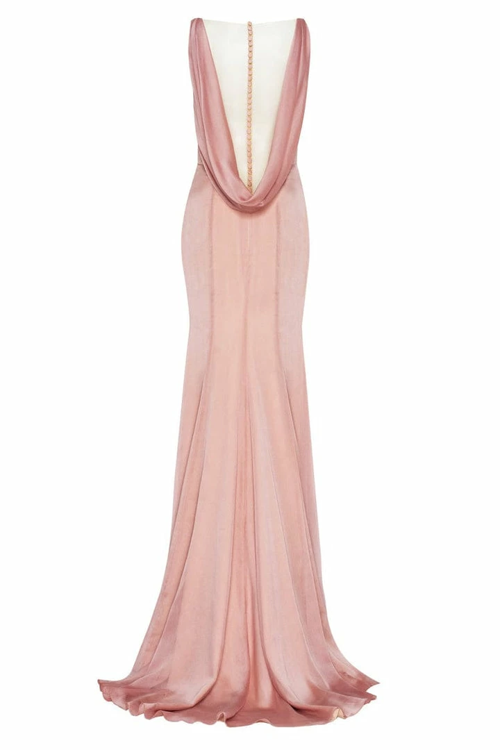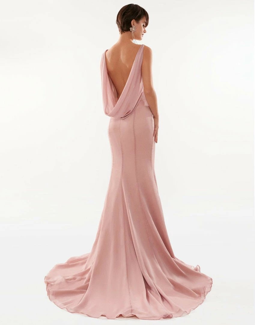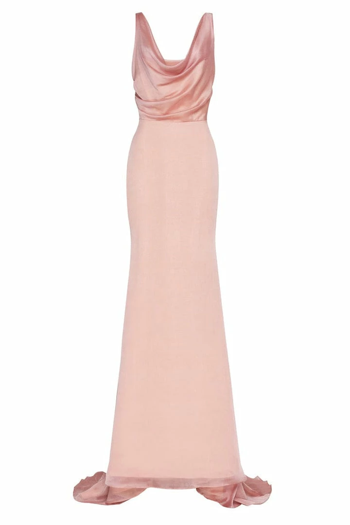 Delicate sleeveless maxi evening dress with a draped cowl neck, bodycon silhouette, short train, and a draped-cowl open back.