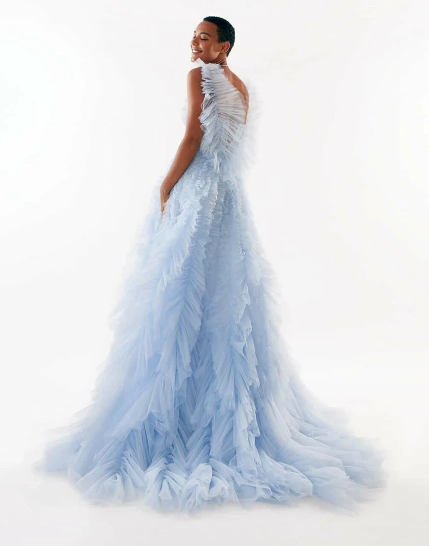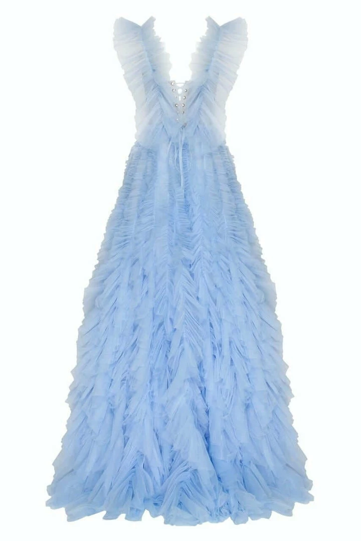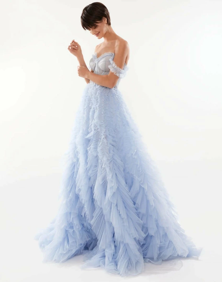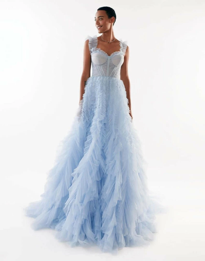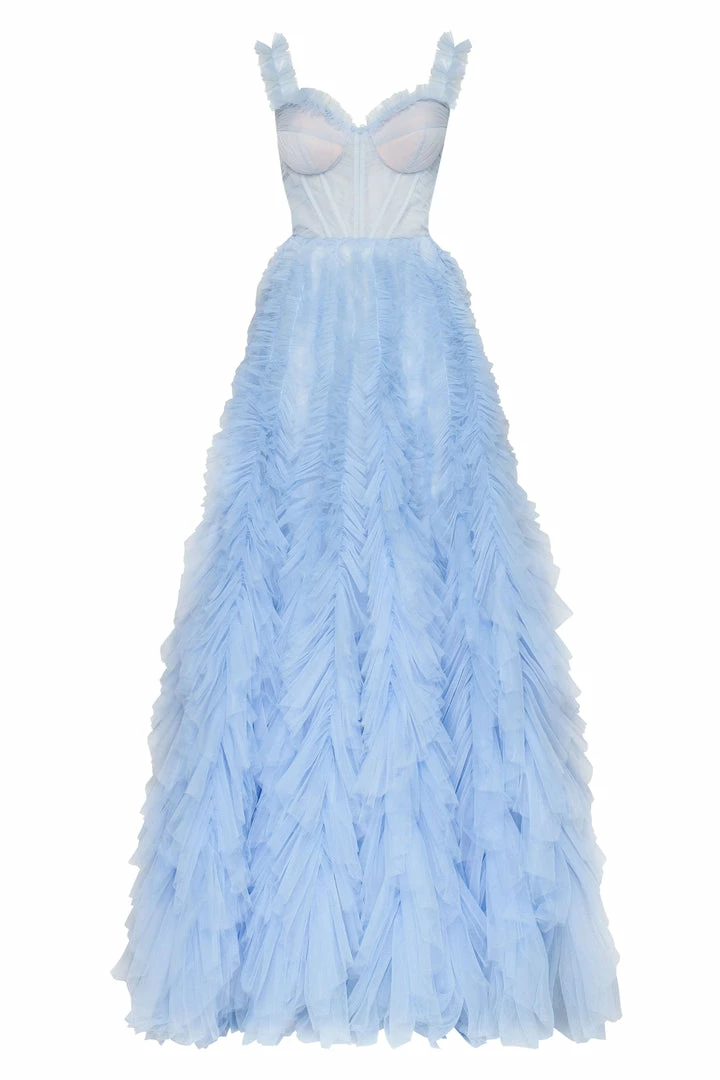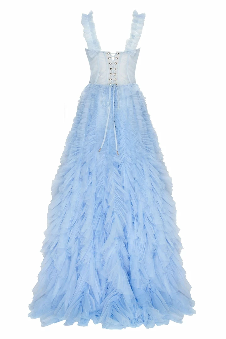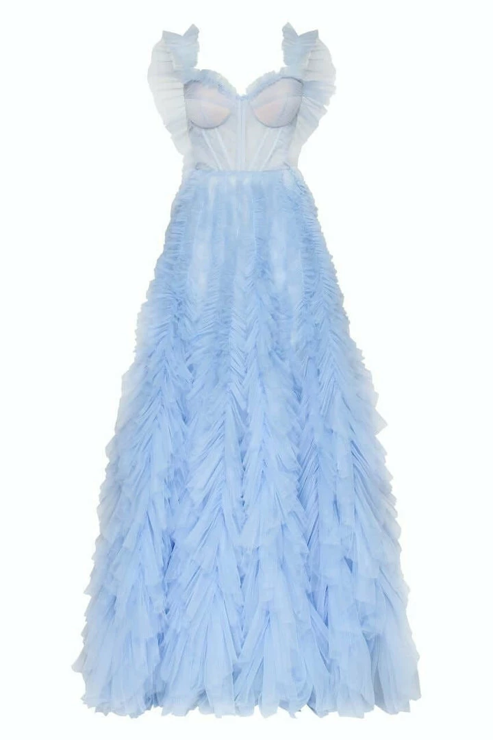 Girlish all ruffled up evening tulle prom dress with a semi-transparent corset bodice and a full tulle maxi skirt.