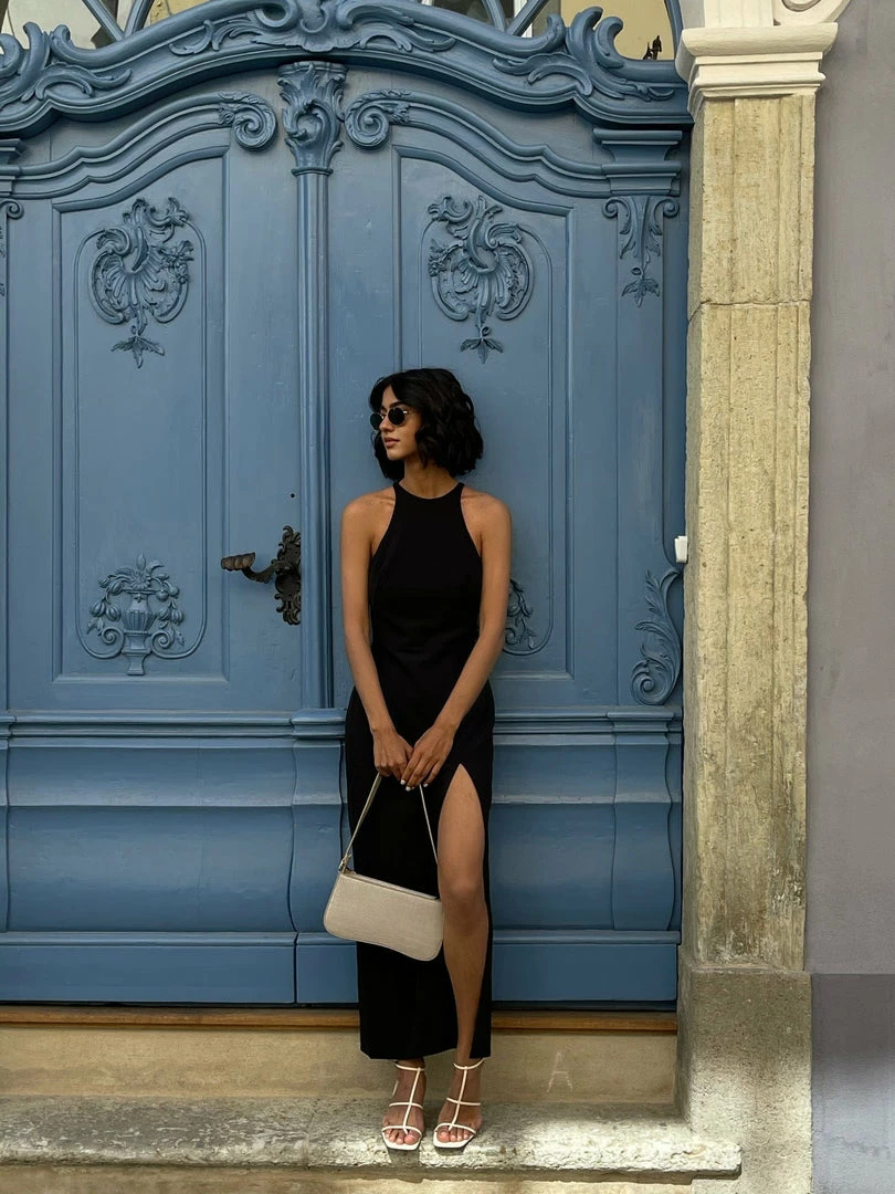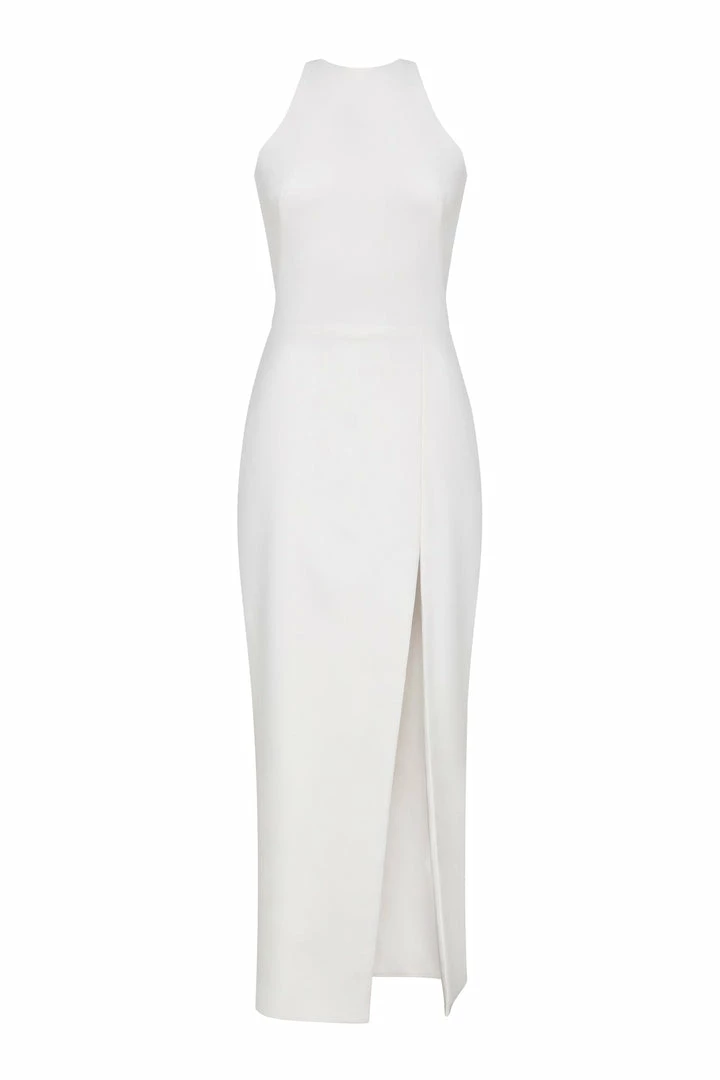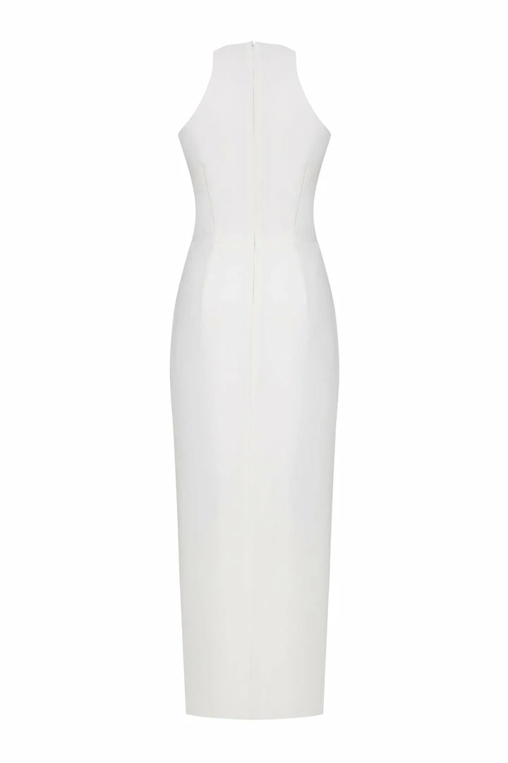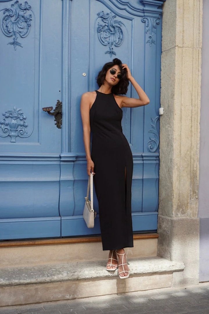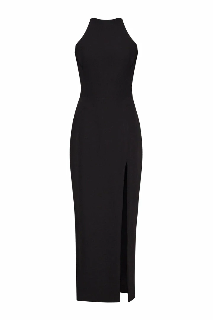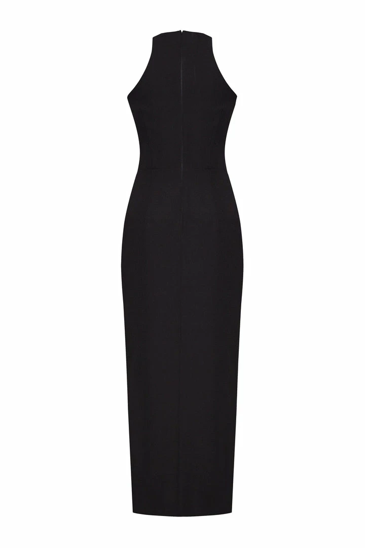 Elegant mock neck sleeveless bodycon dress with a thigh slit. Midi length.