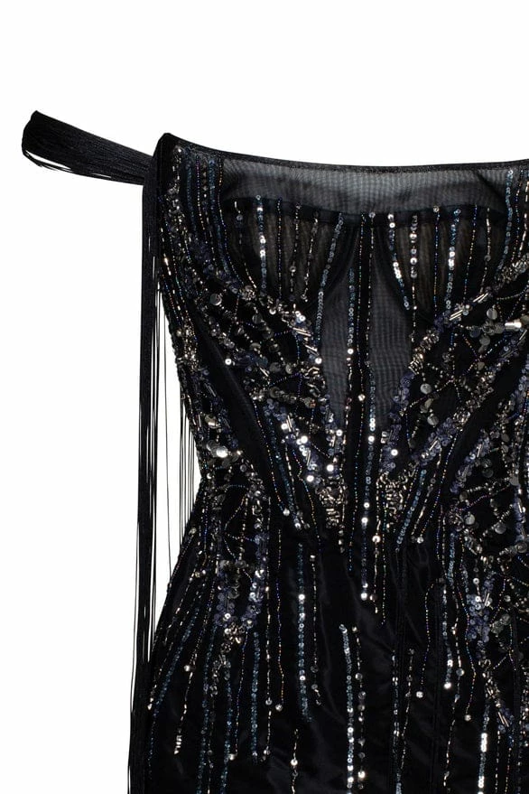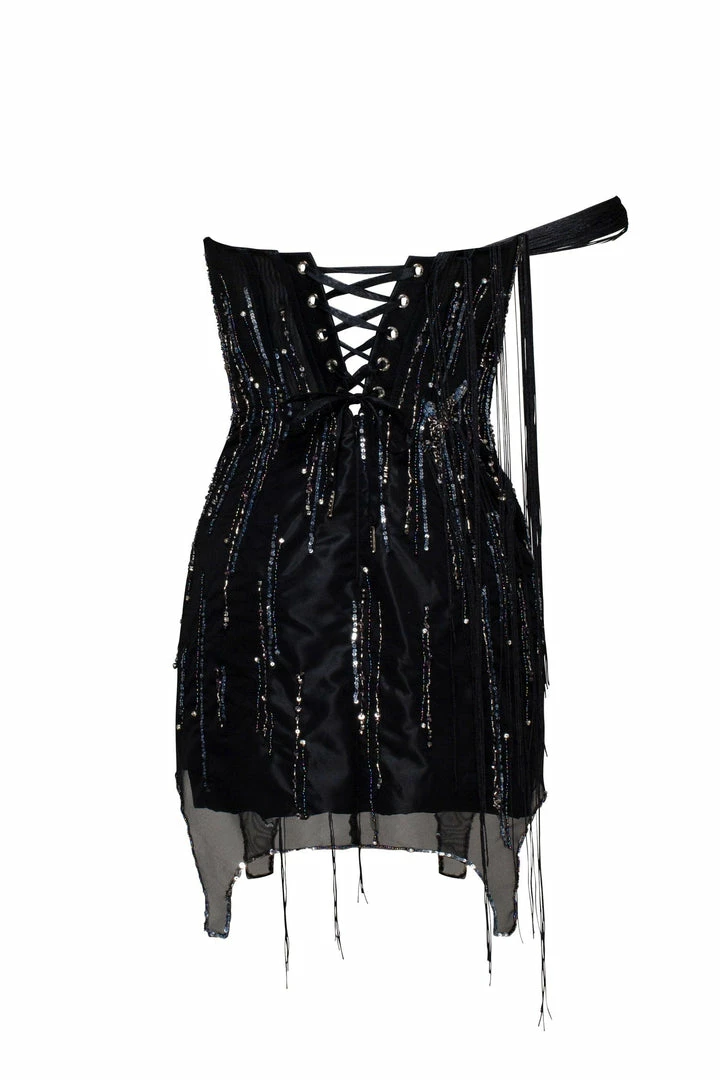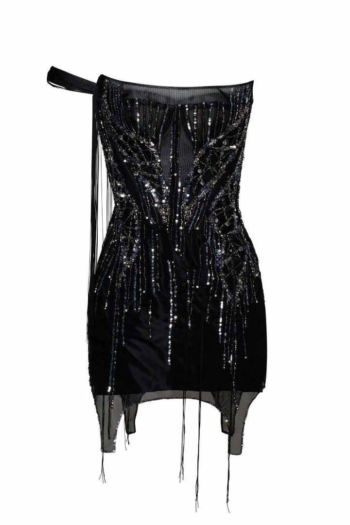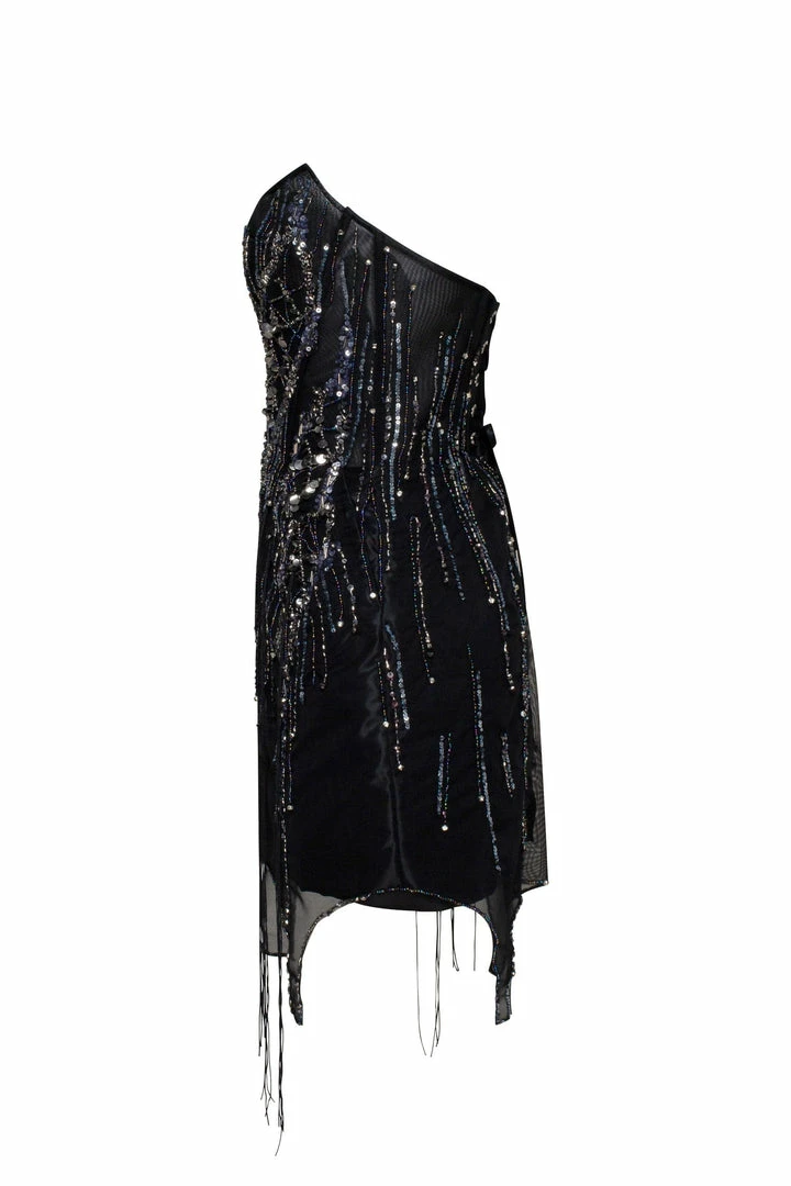 Daring short party evening tulle dress with sequin appliques all over it. Features asymmetric one-shoulder drop-down tiny sleeve with flowing straps from it. This one-shoulder mini dress has a tiny strap flowing from the bottom of the dress.