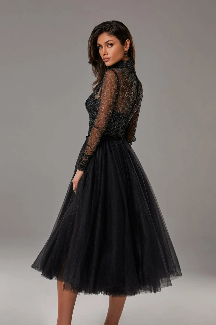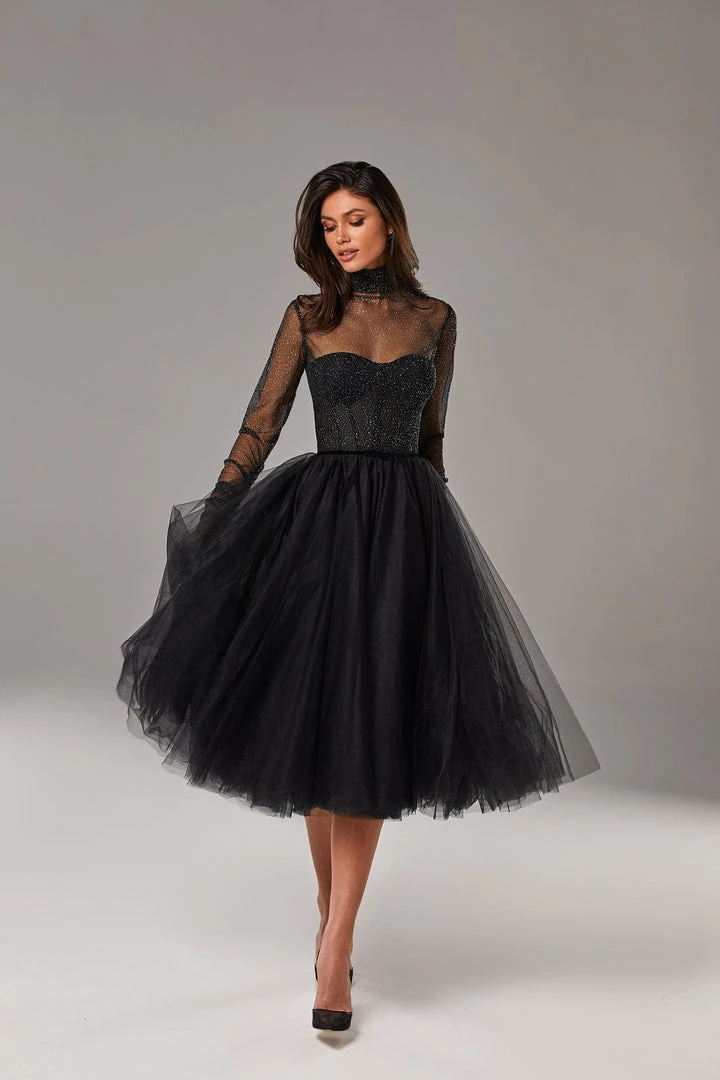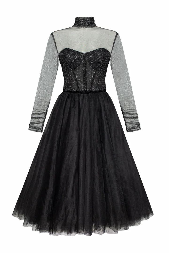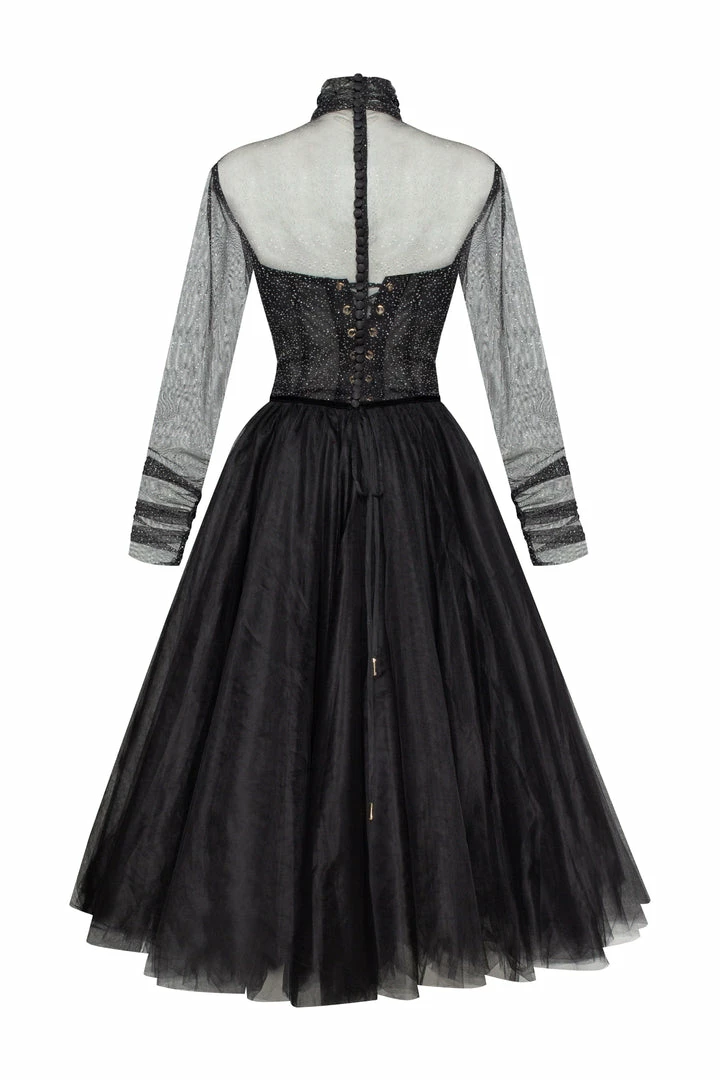 Gorgeous combination midi tulle black dress features a semi-transparent corset bustier and puffy midi skirt. Complemented with a semi-transparent glitter overlay turtleneck blouse, which gives your look additional sparkle. The semi-transparent corset has built-in cups and a zipper closure. Knee-length skirt made of layers of tender tulle fabric which makes it really puffy. The dress is available in black.