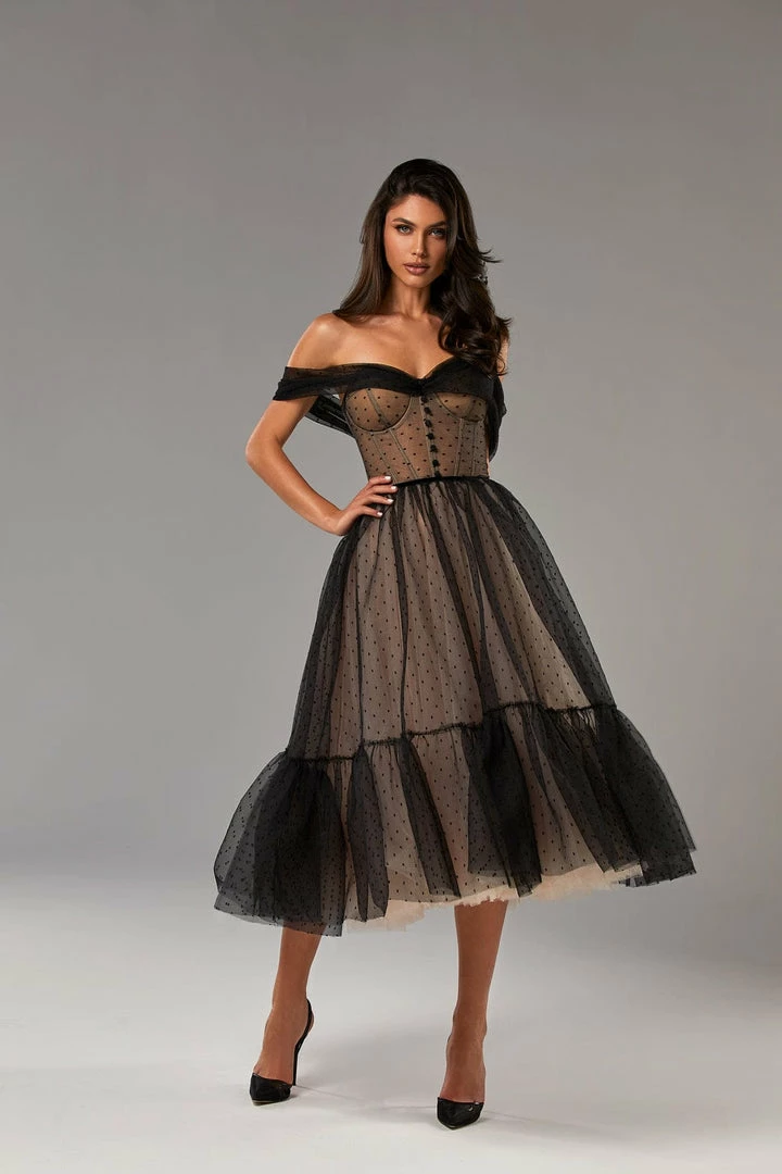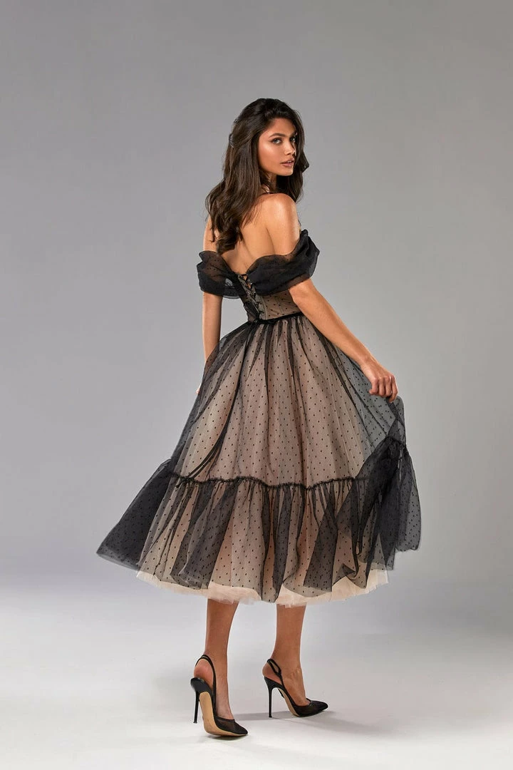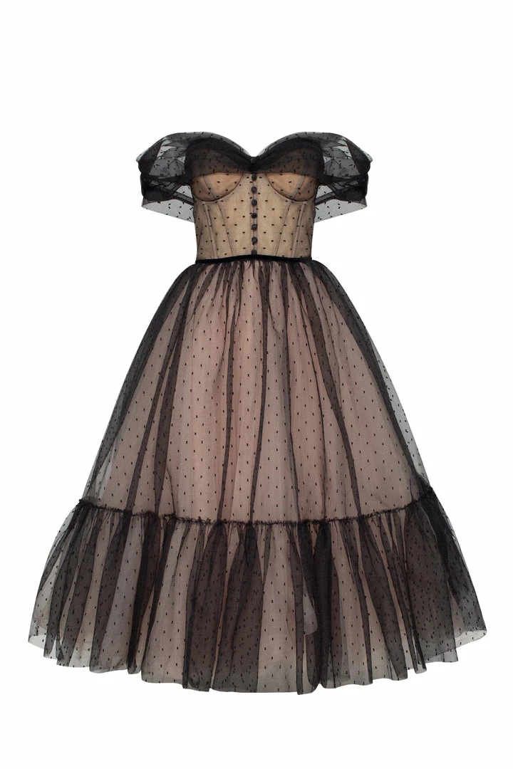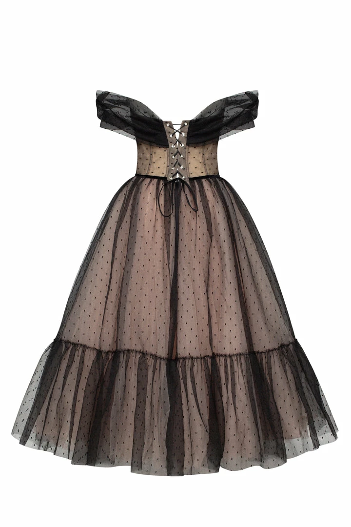 Feminine off-the-shoulder combination tulle black dress. Features a beige corset bustier and beige midi tulle underskirt. The dress is covered with the semi-transparent tulle polka dot overlay dress. The corset is designed with the off-the-shoulders sheer sleeves and lace-up closure, and decorated with the front buttons. The A-line midi skirt is partially lined and emphasizes the waist area and makes you look elegant. The dress goes in black.