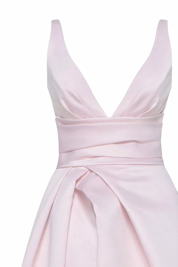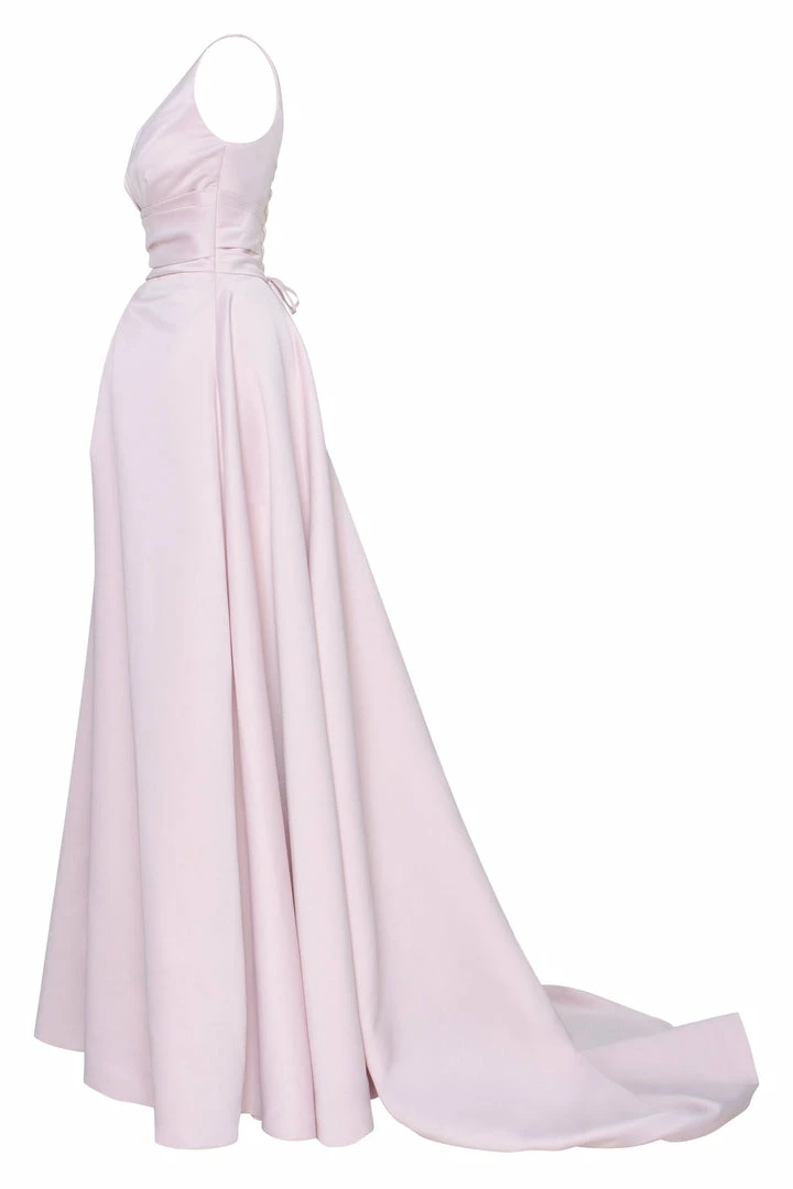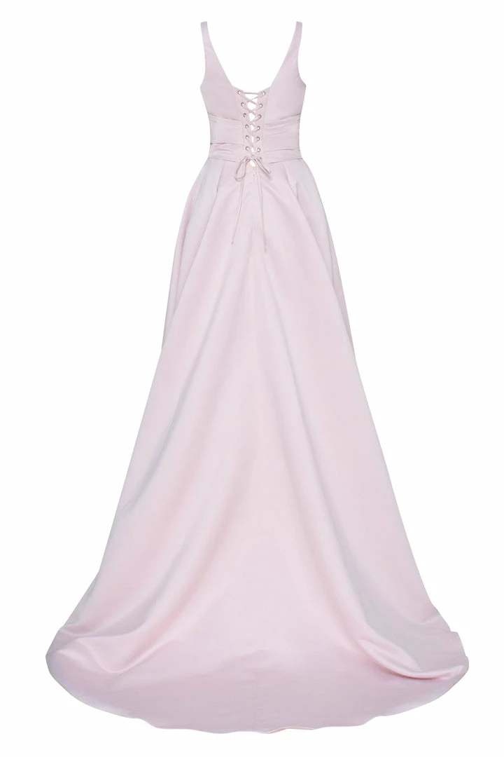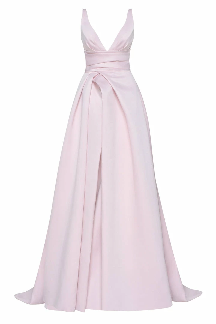 This gown is truly a showstopper! Starting from the daring floor-length front slit, a ball gown volumetric maxi skirt, and ending with a plunging V-neckline, strapped bodice, and a long train. If you want to get all of the attention — this dress should be your choice.