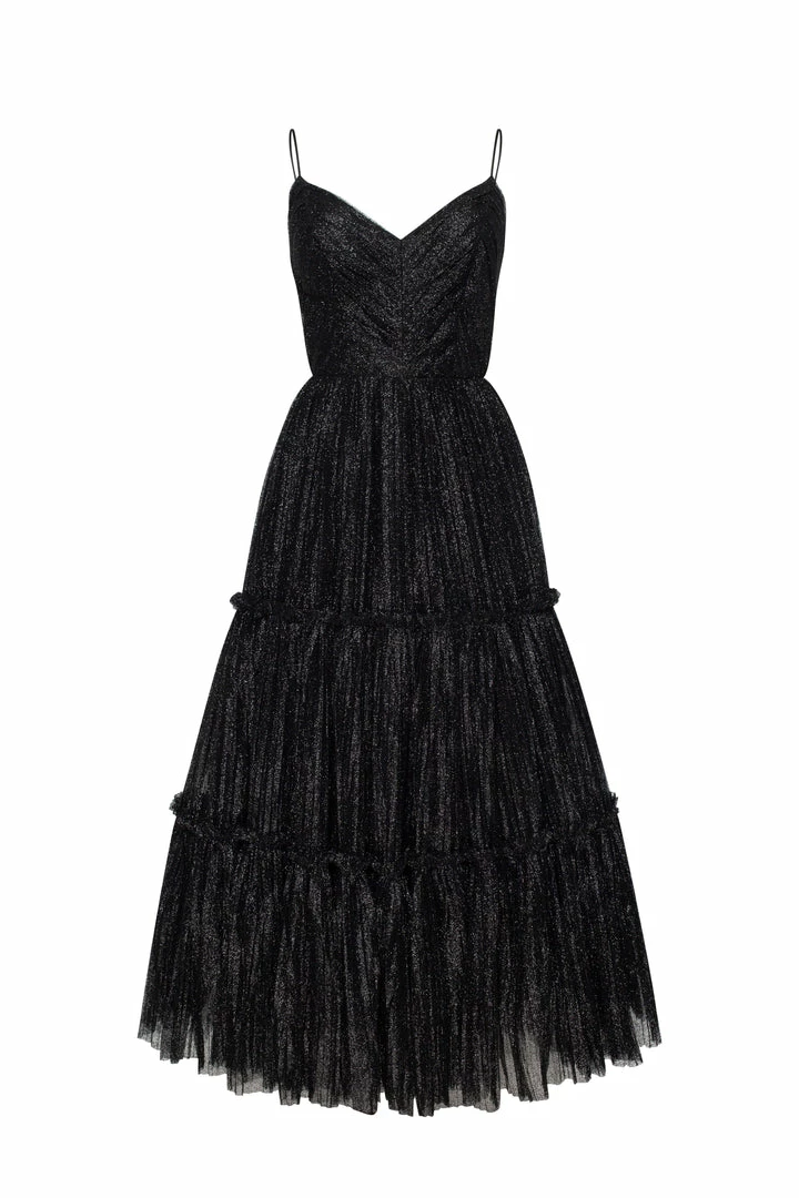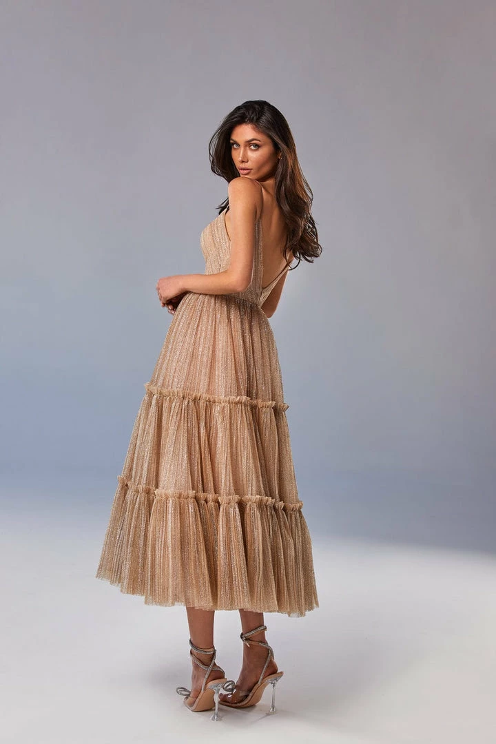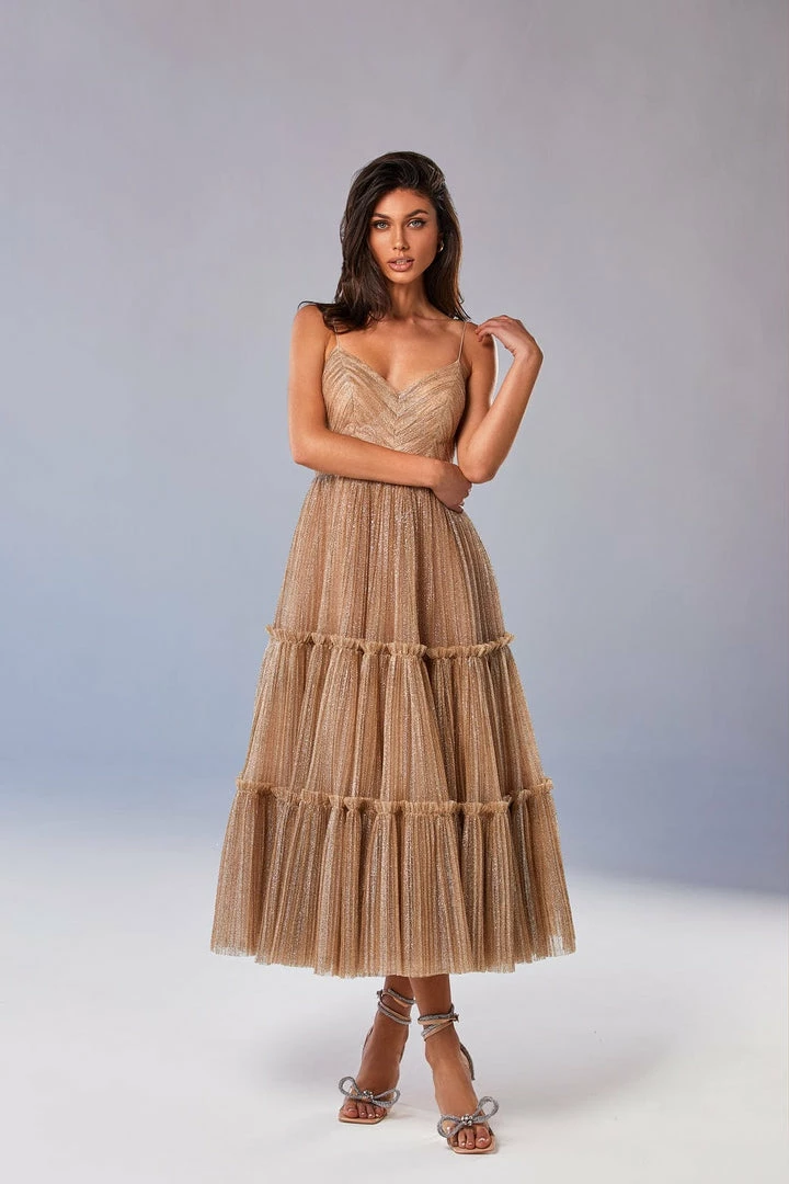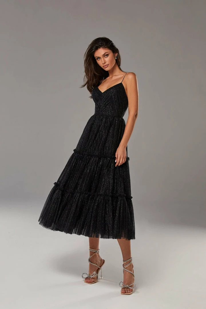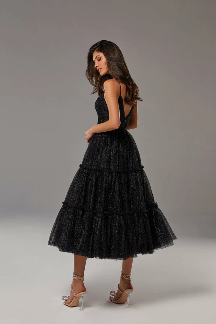 Sparkly cocktail midi dress. Features spaghetti-straps bodice, partially lined full skirt, and an open back.