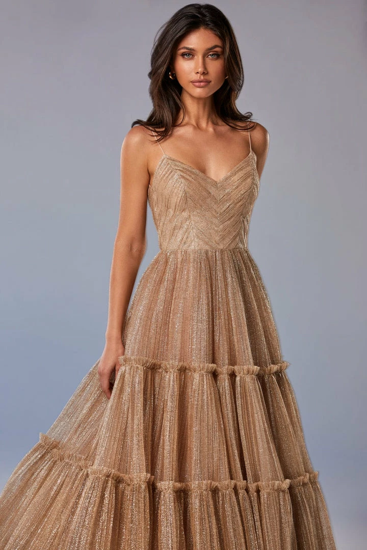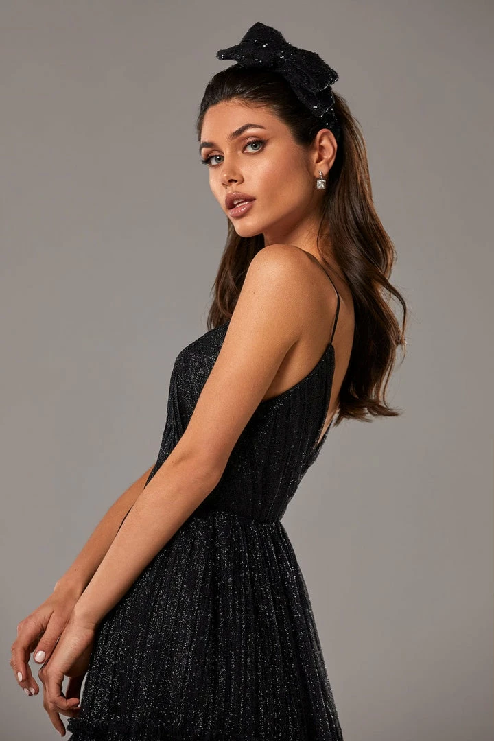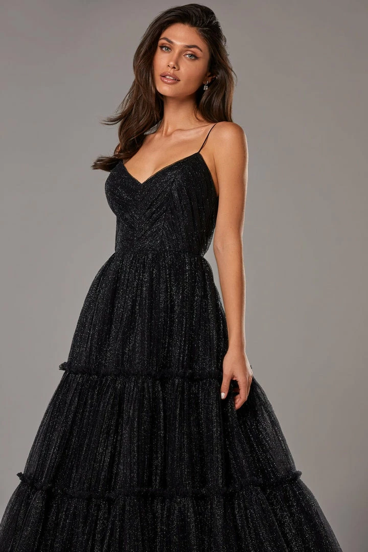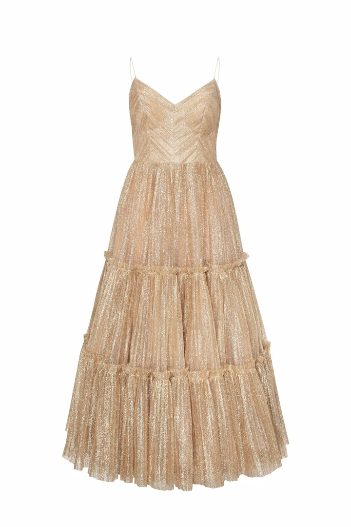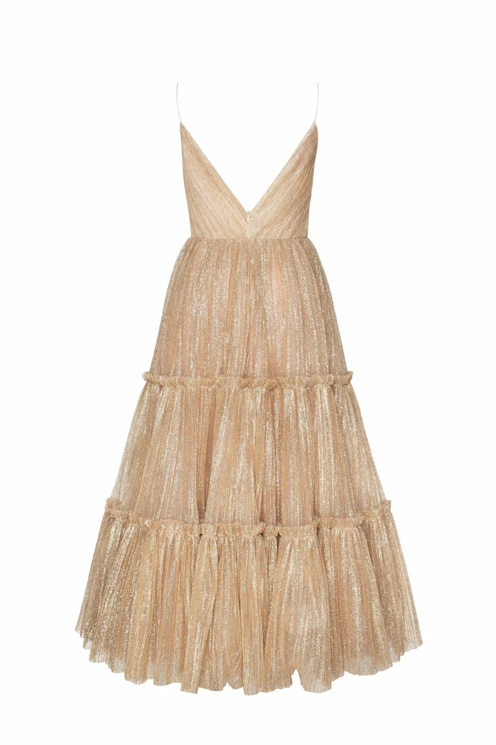 Sparkly cocktail midi dress. Features spaghetti-straps bodice, partially lined full skirt, and an open back.
