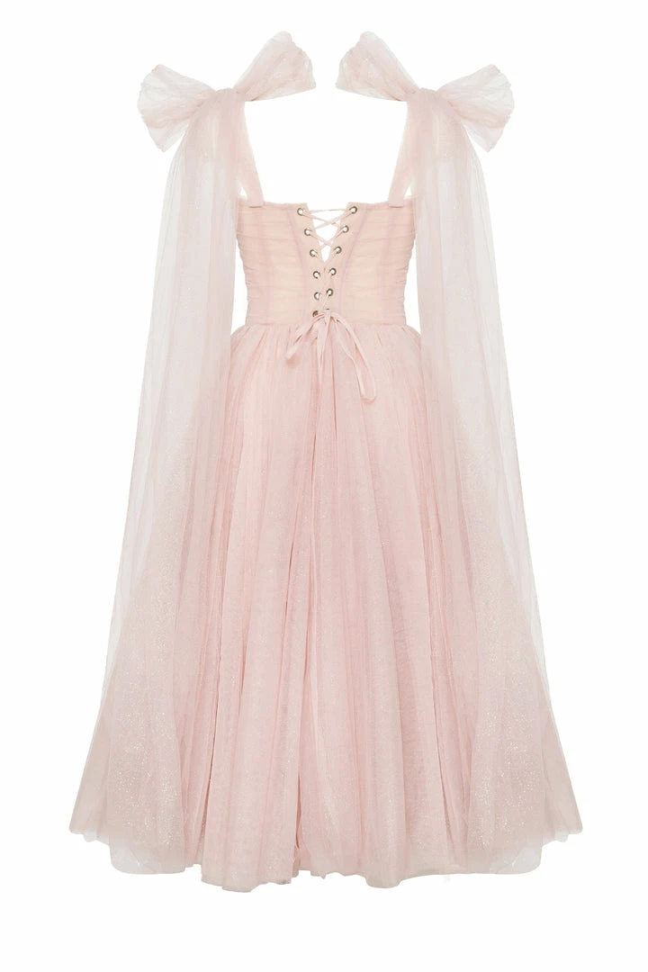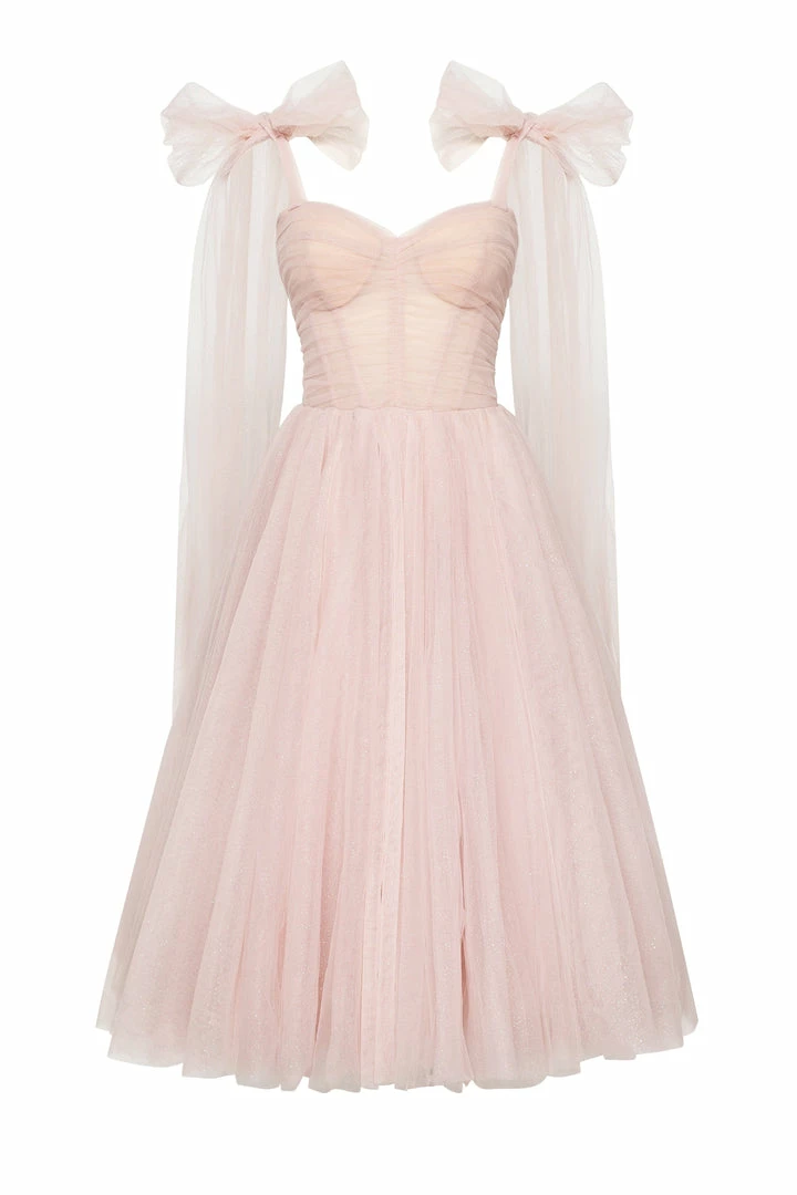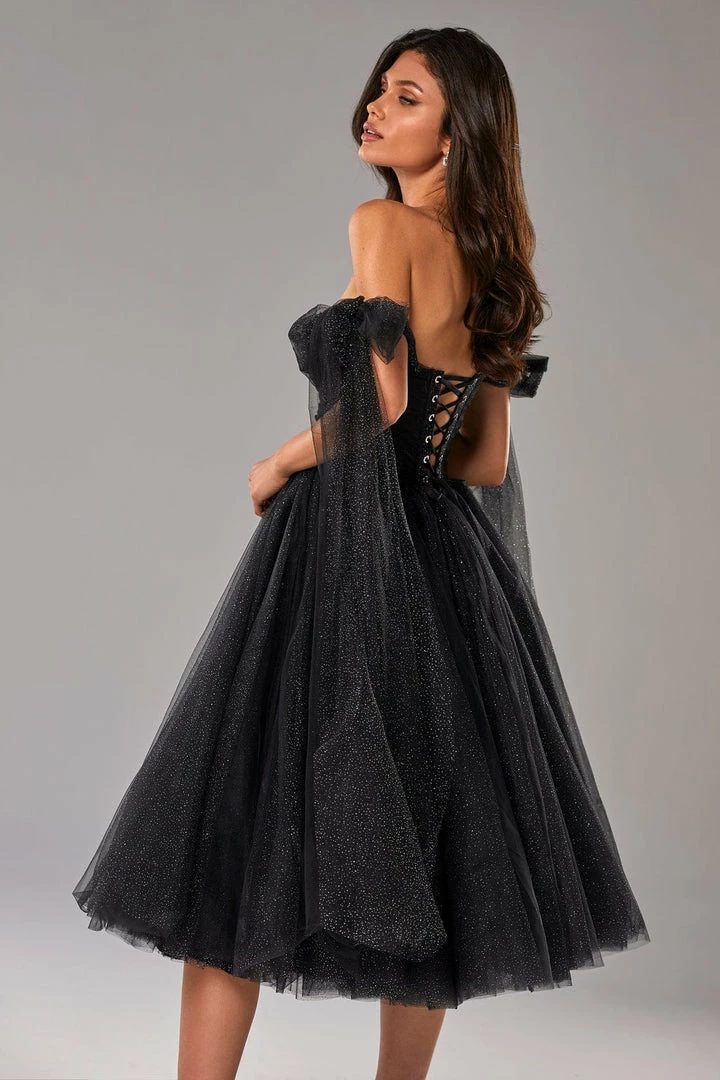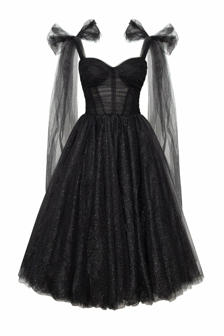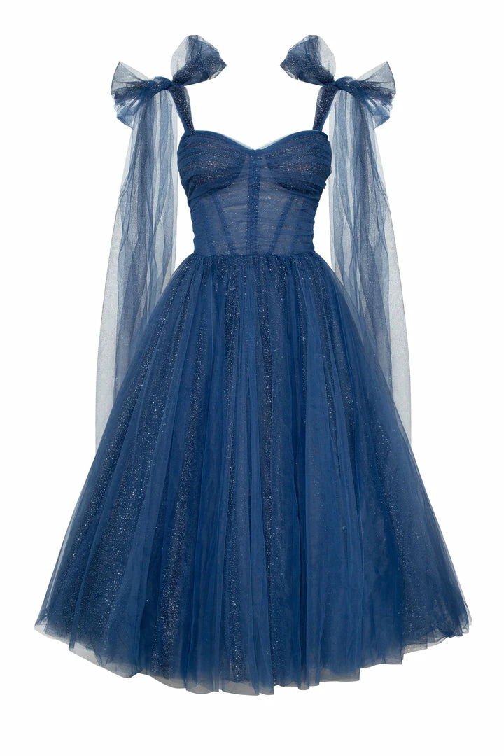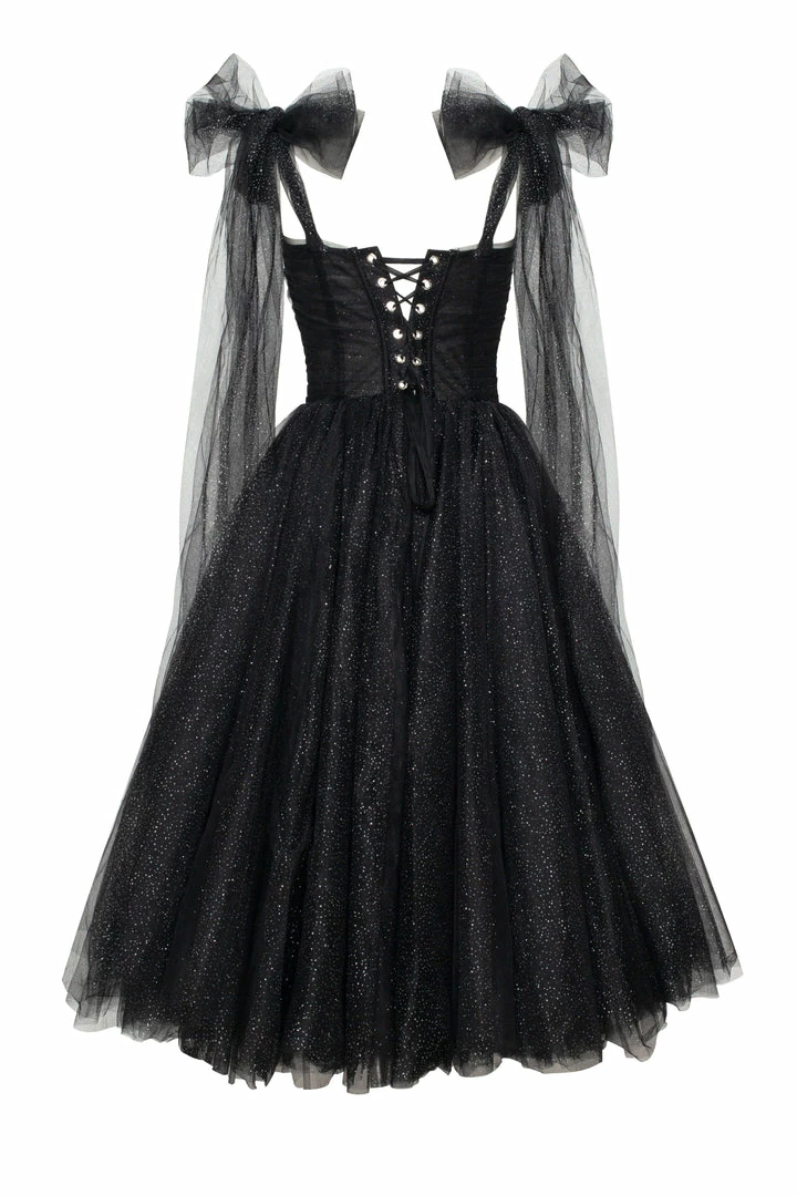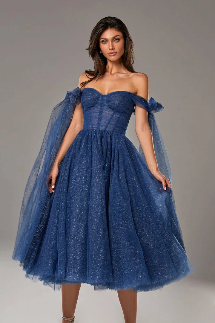 This elegant off-the-shoulder cocktail gown is made of delicate tulle fabric and covered by dozens of silver sparks—the dress traps decorated with elegant bows, which highlight the effortless, feminine vibe of the dress. The build-in corset accentuates the hourglass silhouette, and the lacing makes this dress suitable for each body type. A sparkly off-the-shoulder tulle dress is the perfect choice for