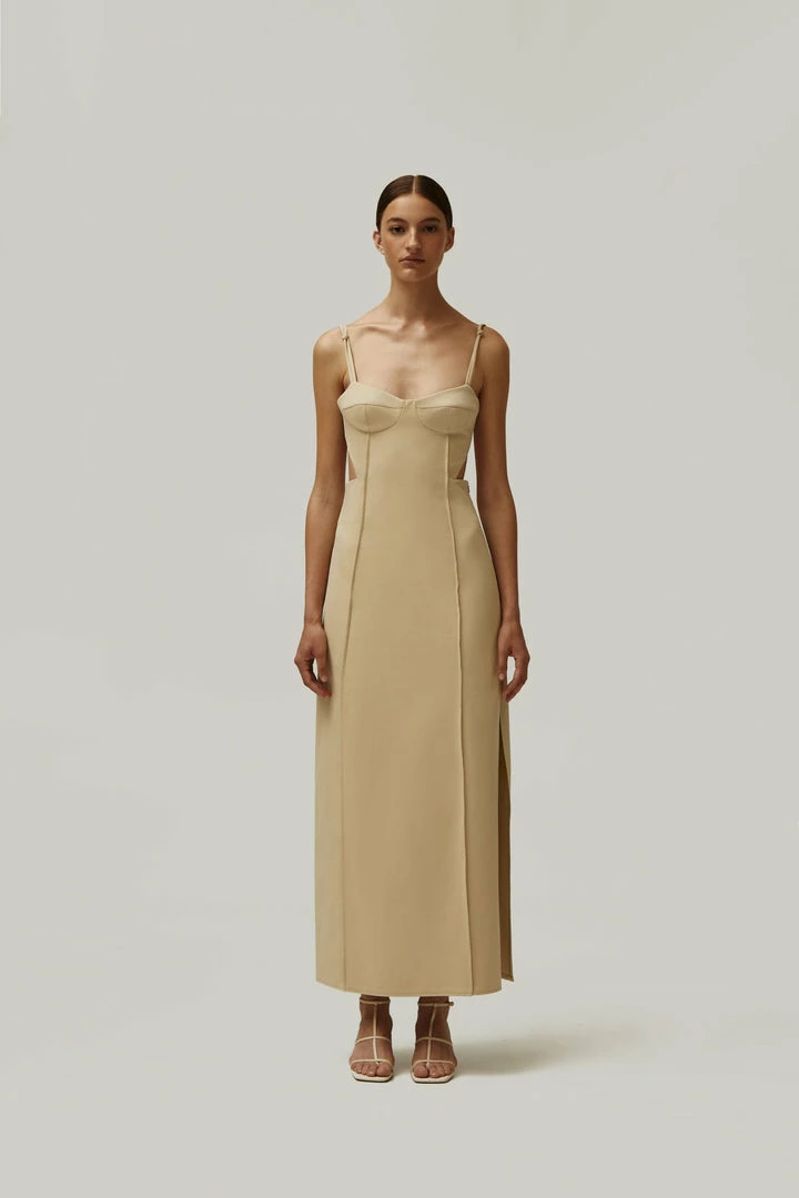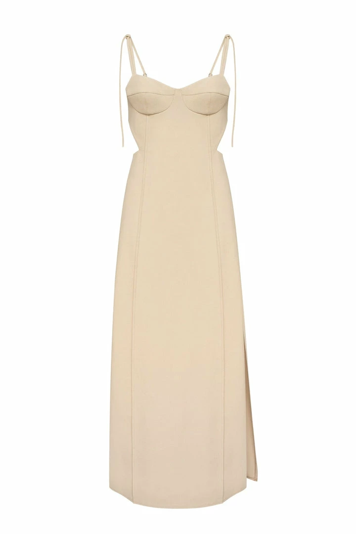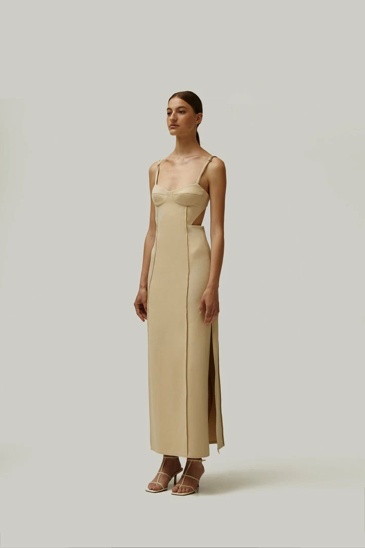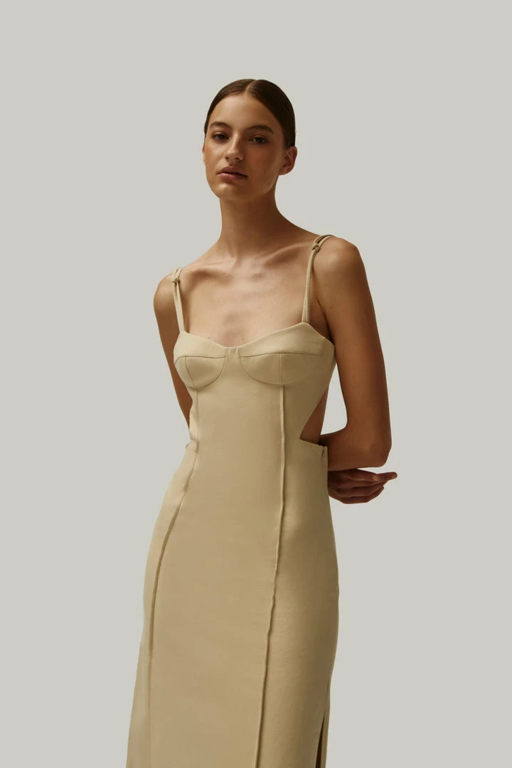 Elegant midi side cut out dress with adjustable straps and lateral cutouts that turn into a semi-open back. Features decorative seams.