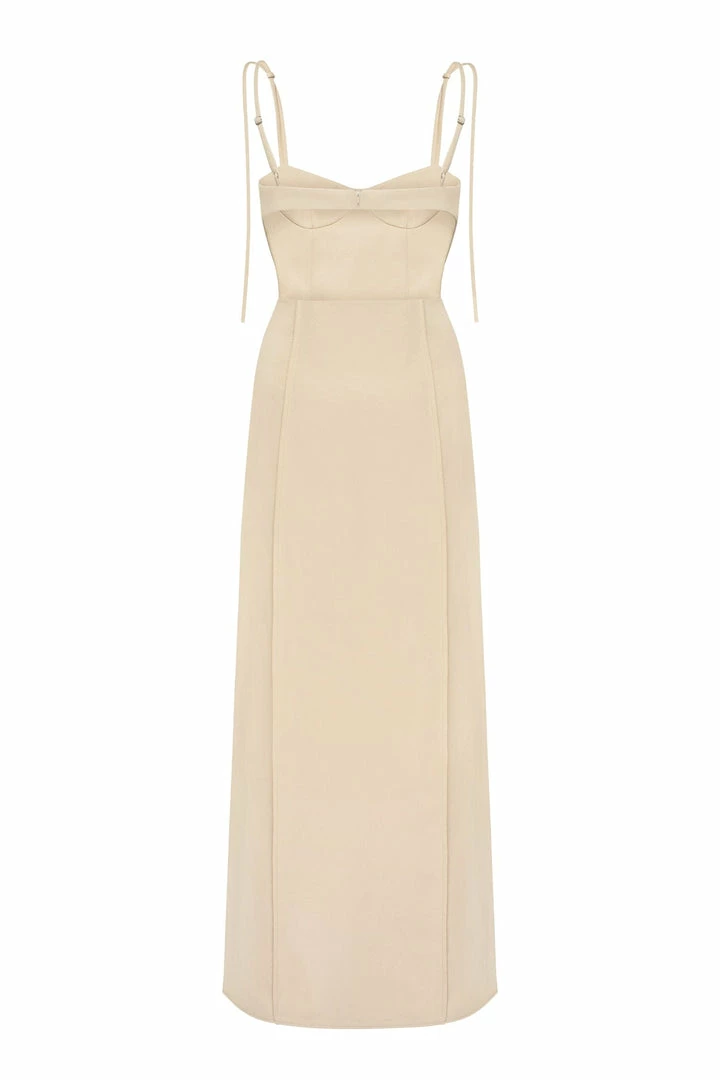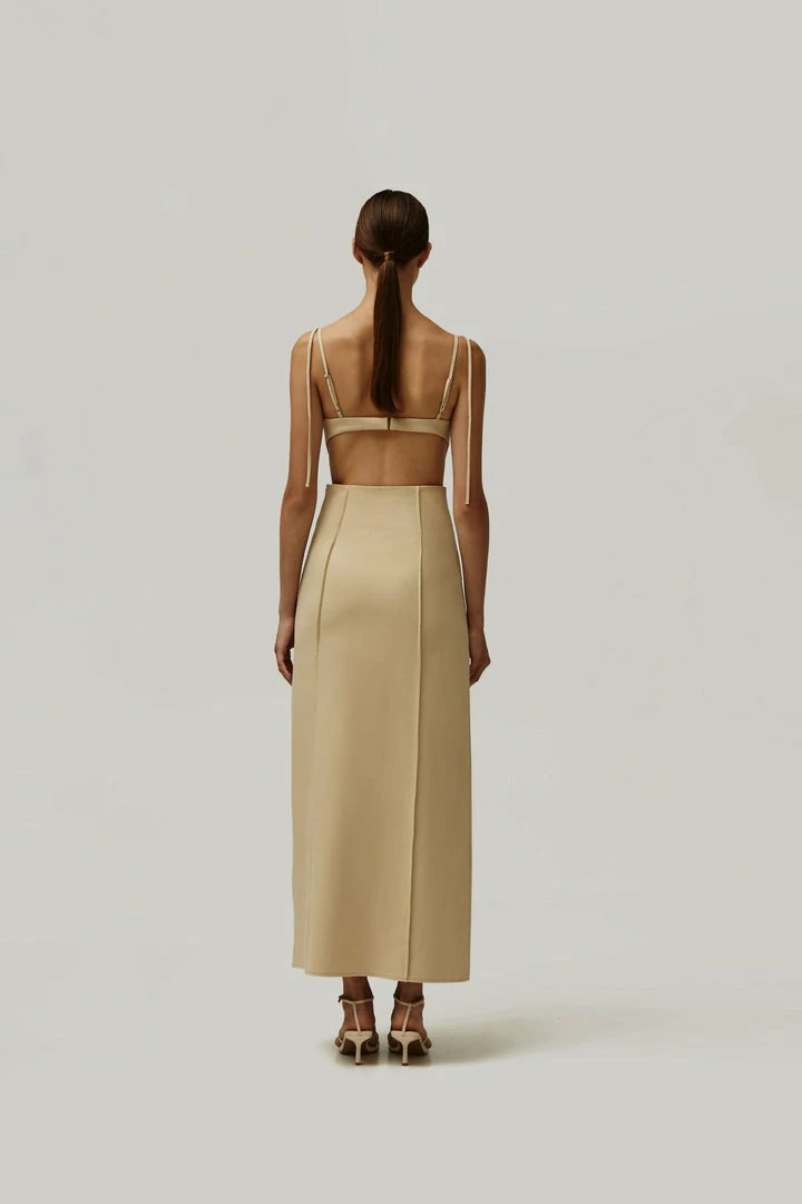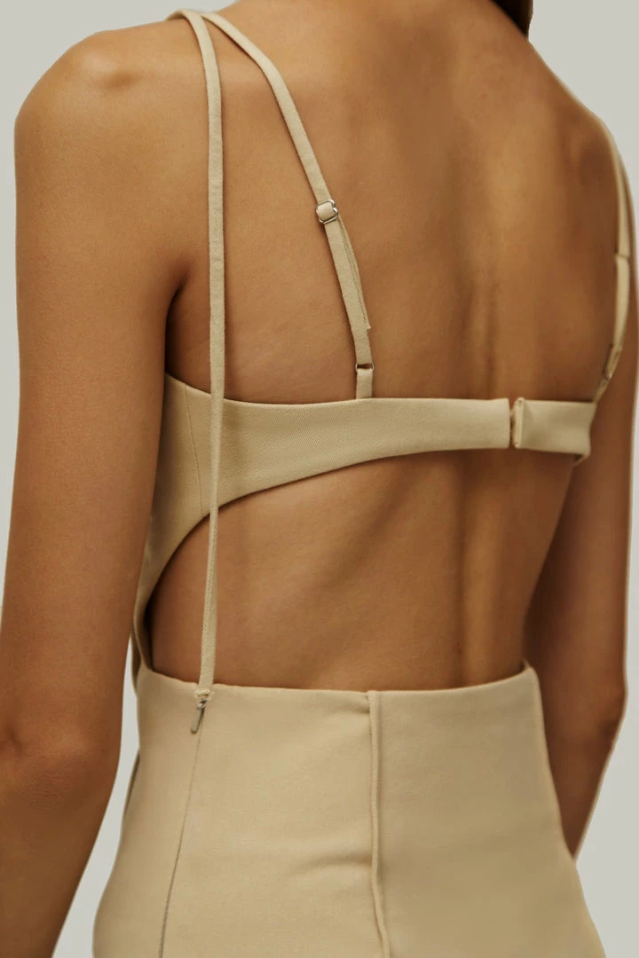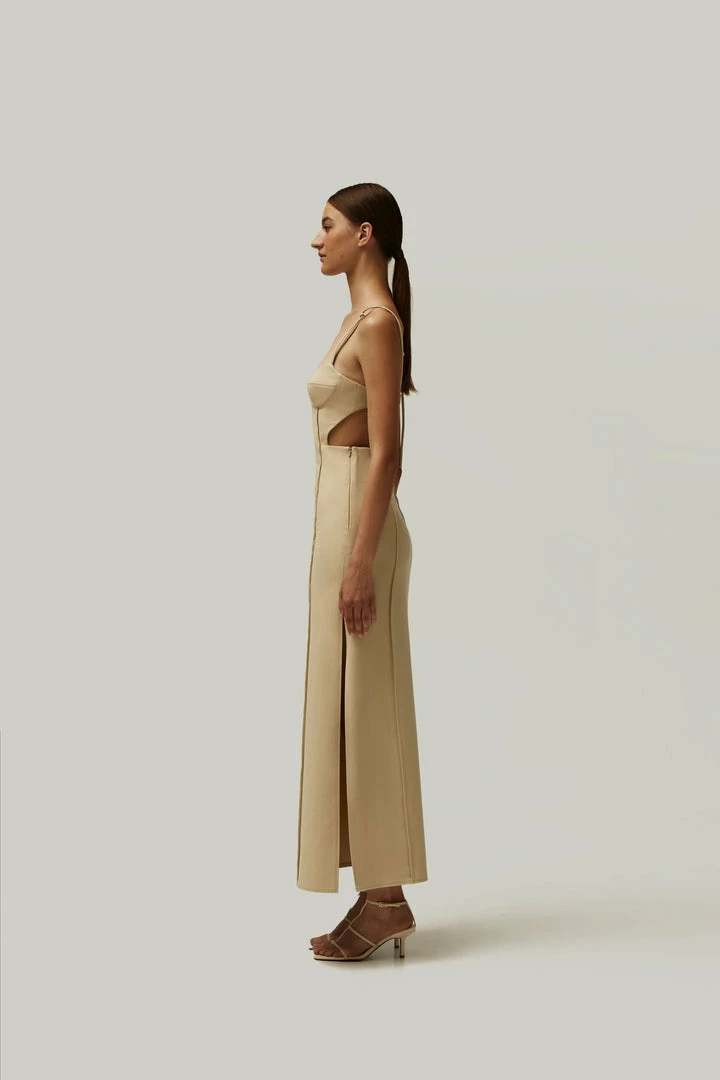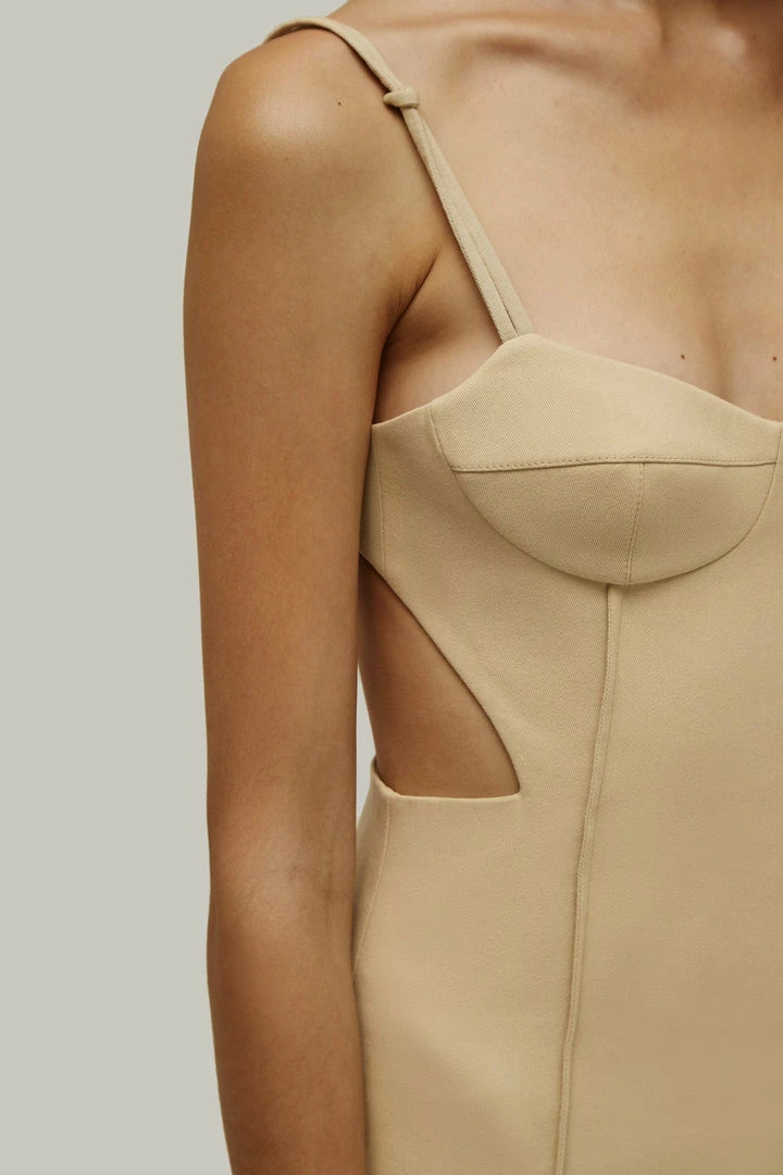 Elegant midi side cut out dress with adjustable straps and lateral cutouts that turn into a semi-open back. Features decorative seams.