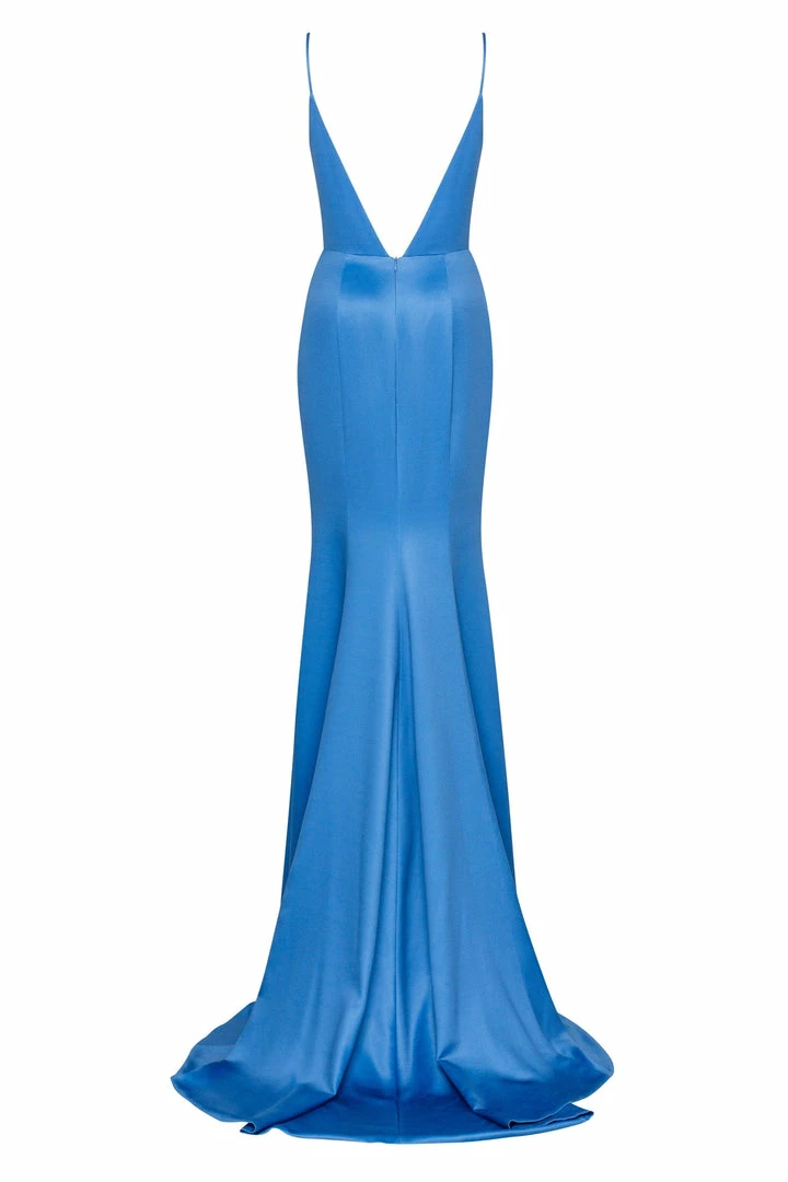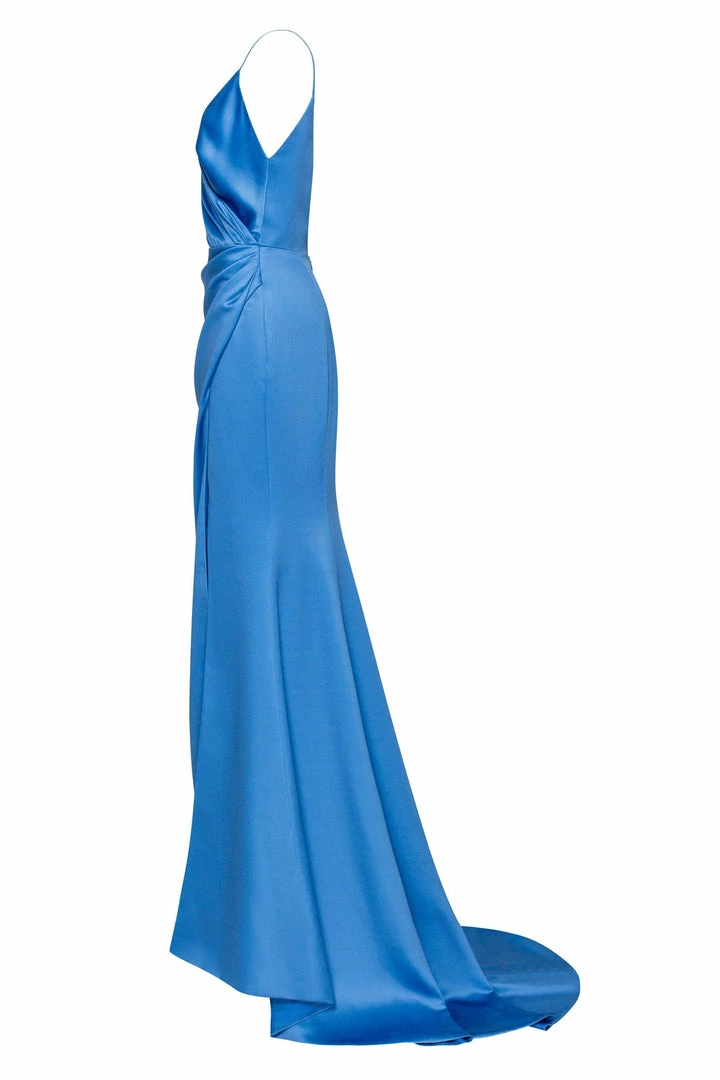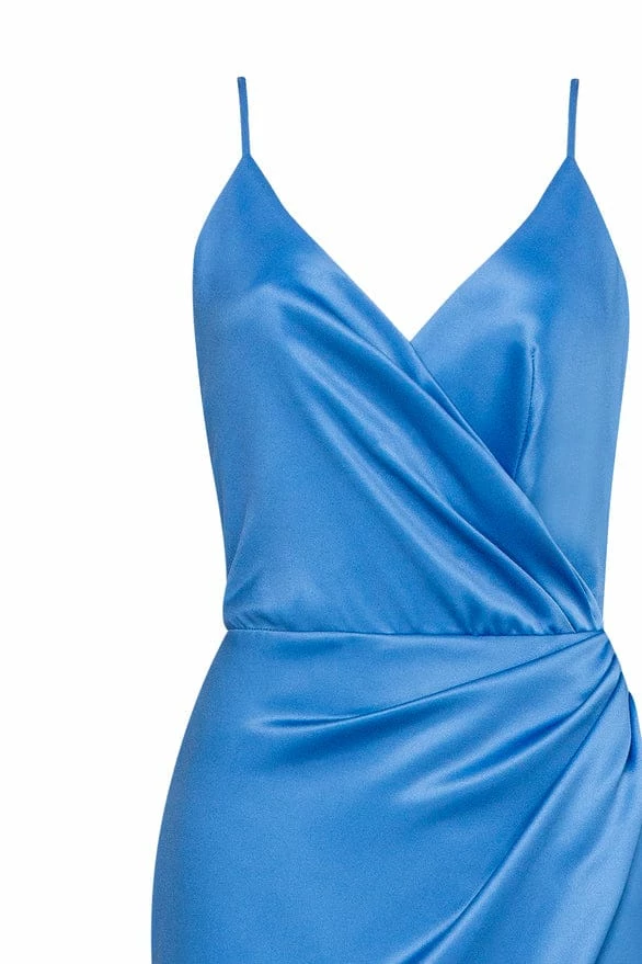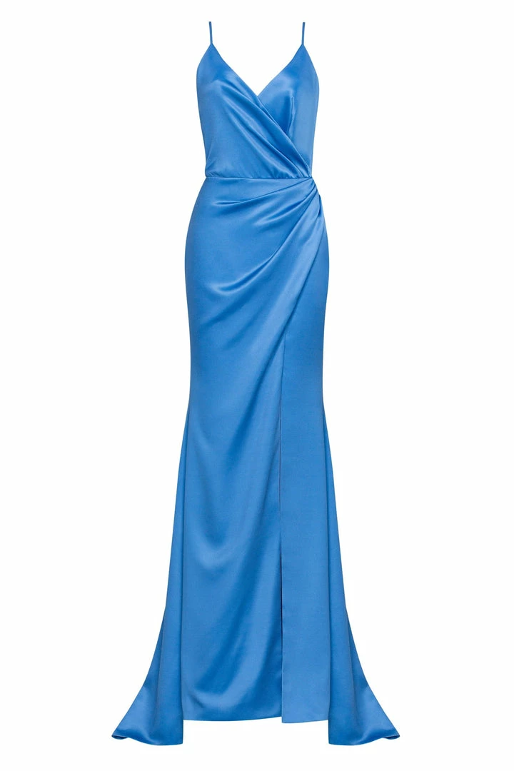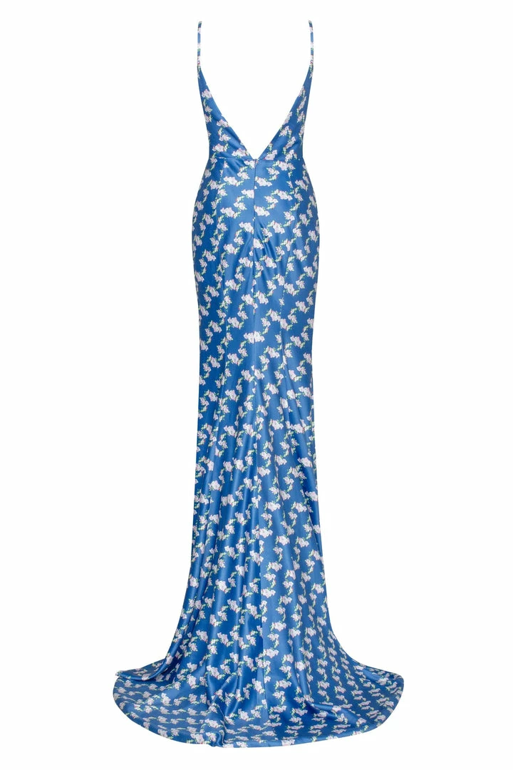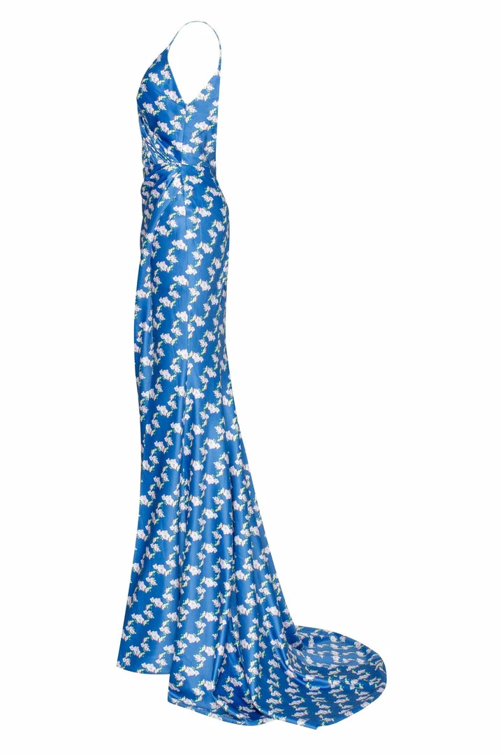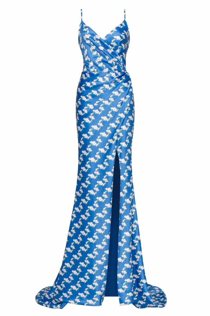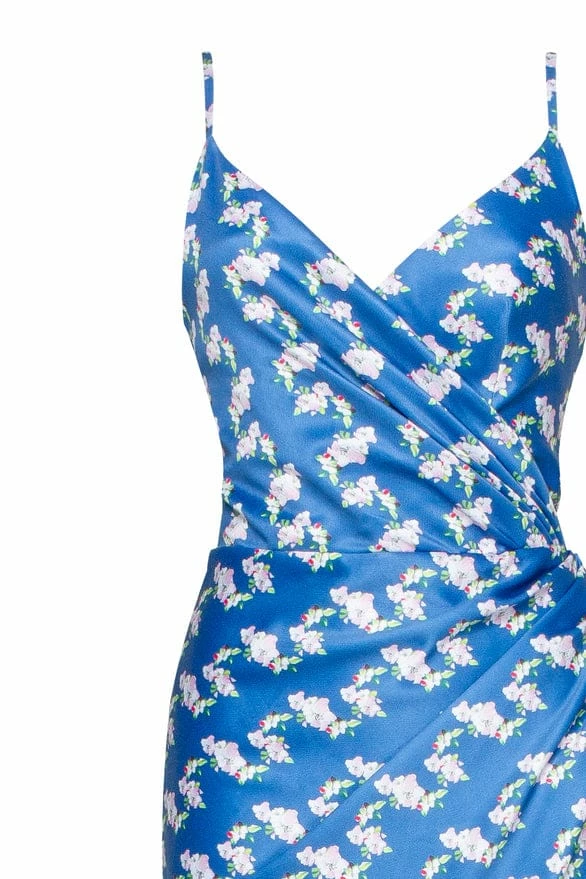 - Features tender floral pattern, a draped bodice, and a daring thigh slit