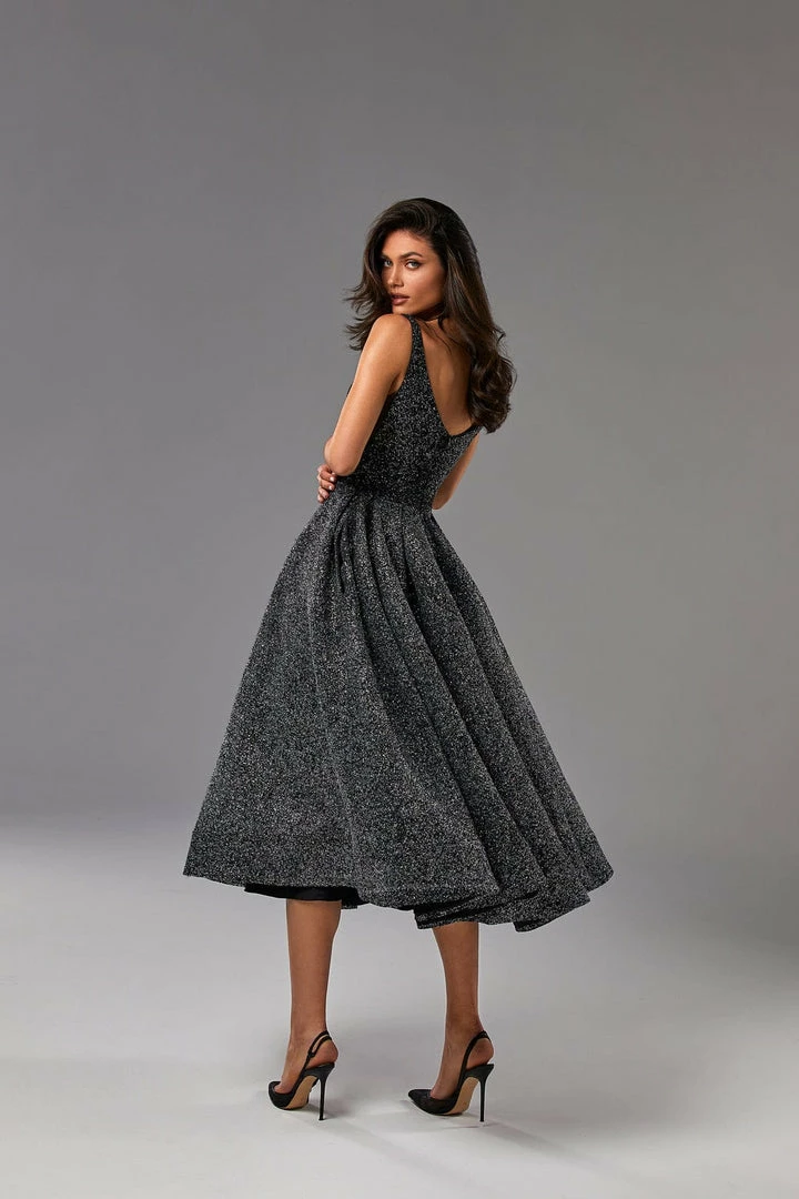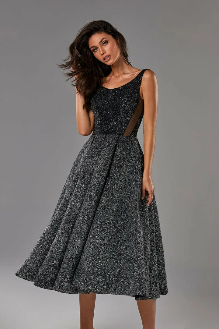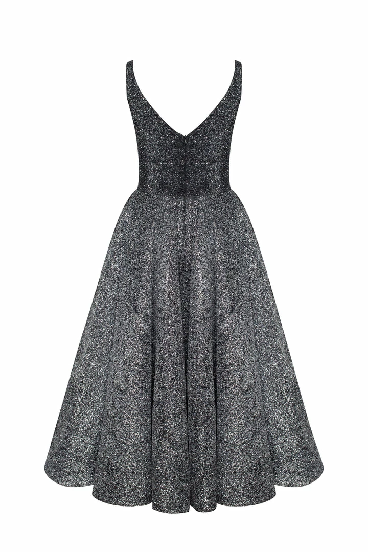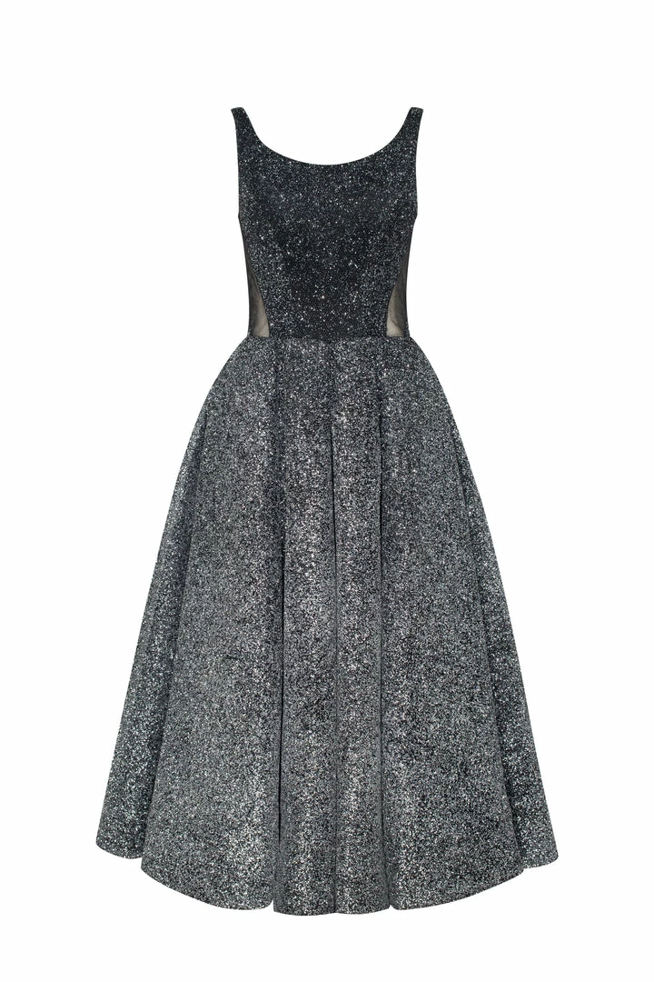 Glitter sleeveless cocktail dress in dark silver color with side cutouts and full circle midi skirt. Features sparkly fabric.