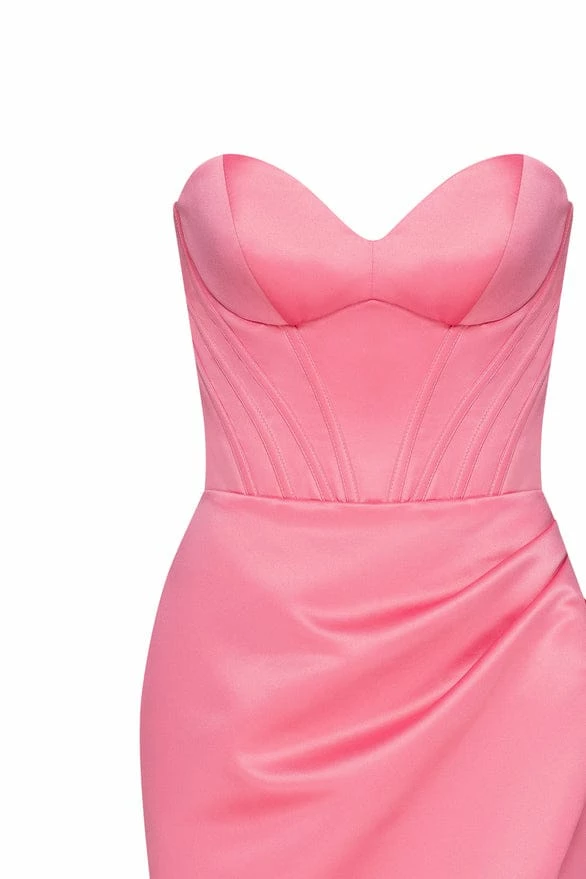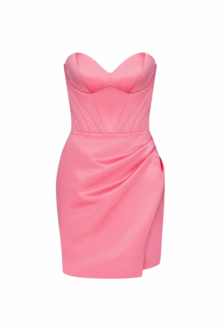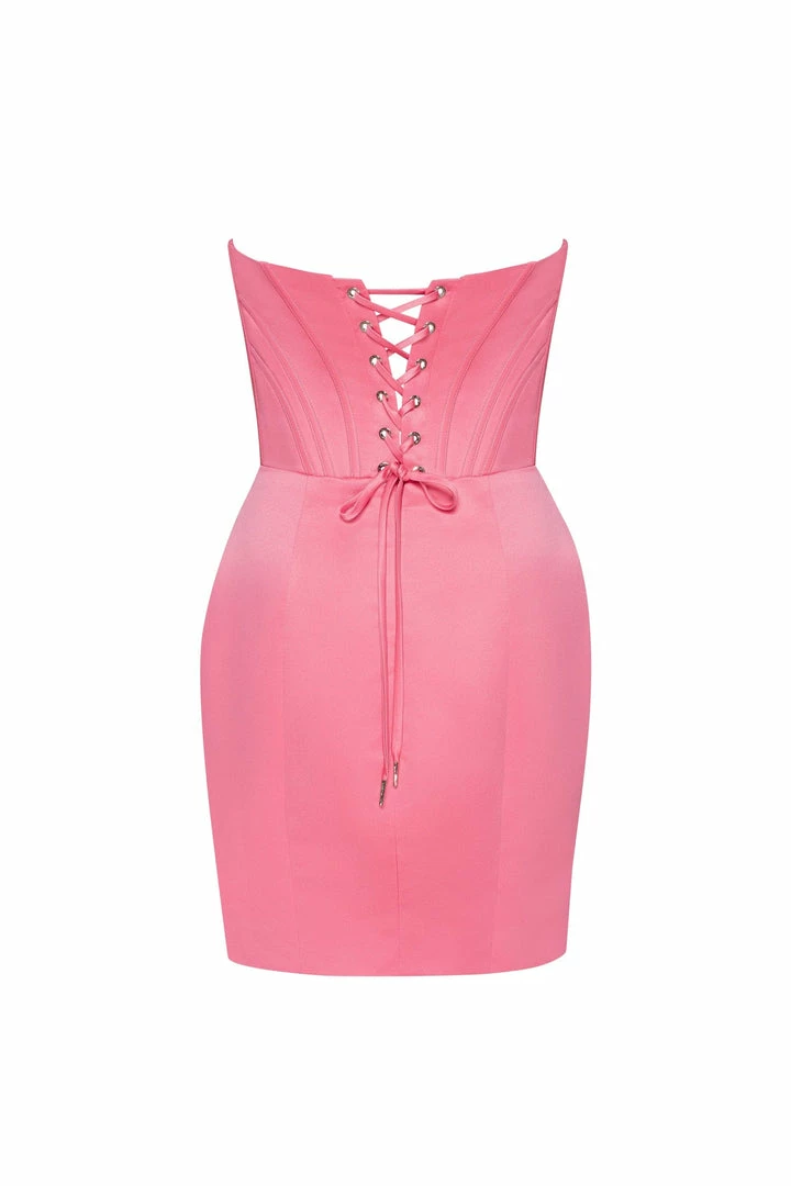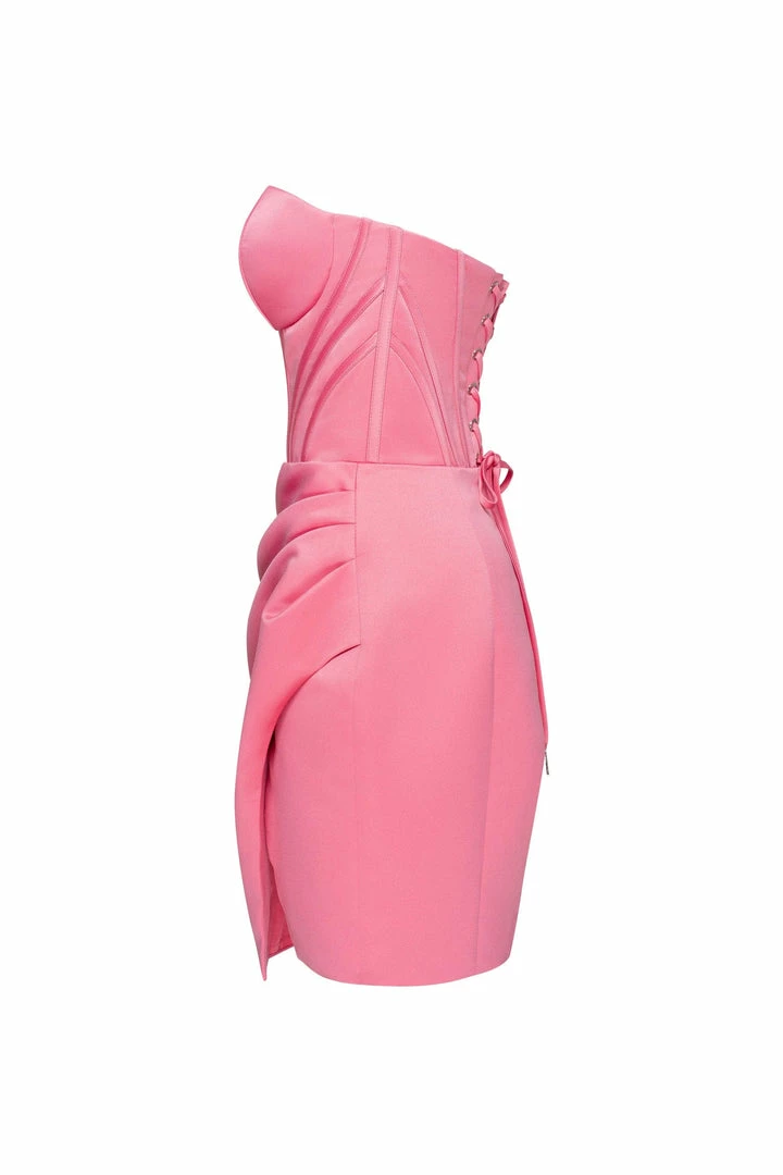 Adorable cocktail mini dress in jacquard fabric. Features a heart-shaped bodice, a lace-up closure on the back, and a draped skirt with a tiny elegant thigh slit that adds playfulness to the elegant look. Available in powdery pink color.