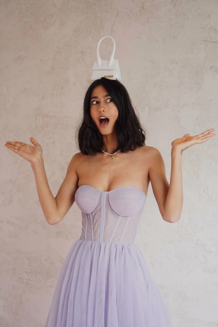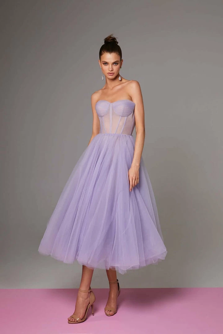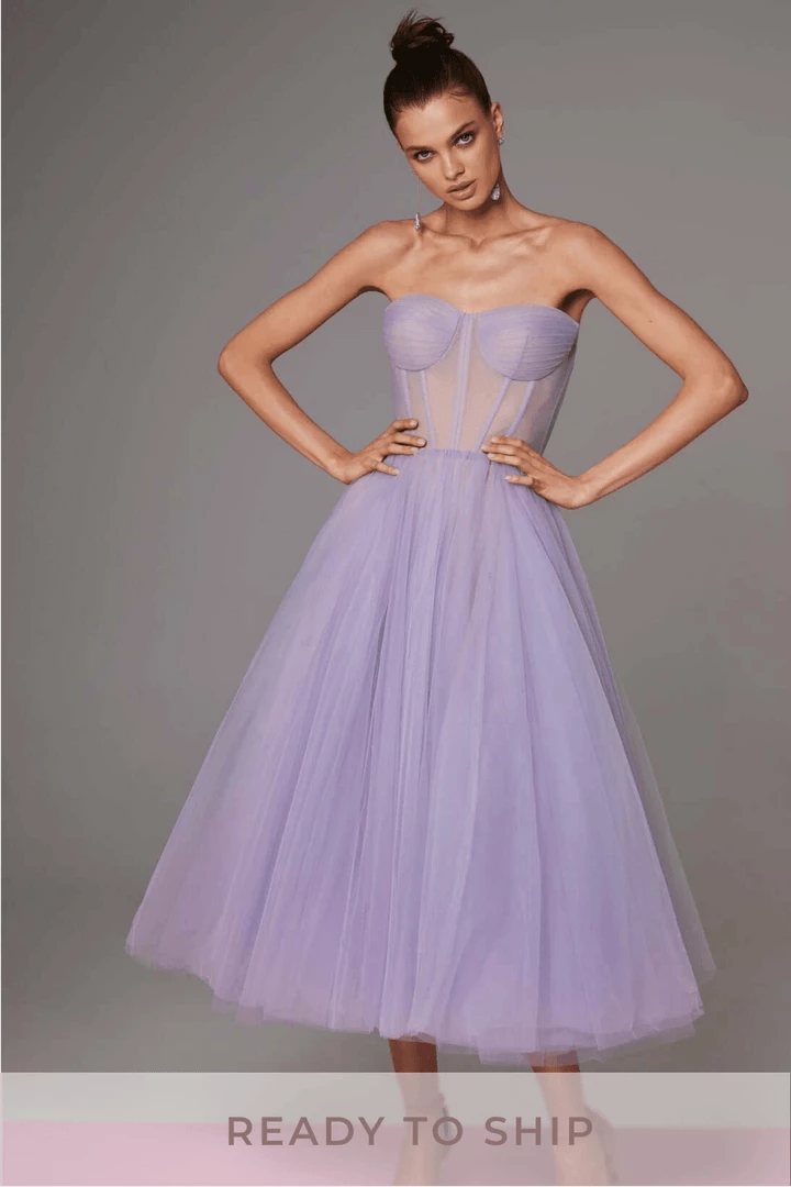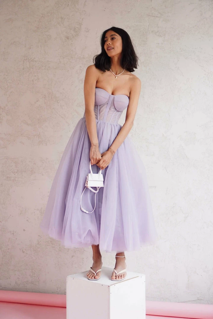 Dreamy combination tulle prom dress with a semi-transparent corset bustier and a puffy tulle midi skirt. This strapless midi dress is perfect for any occasion.