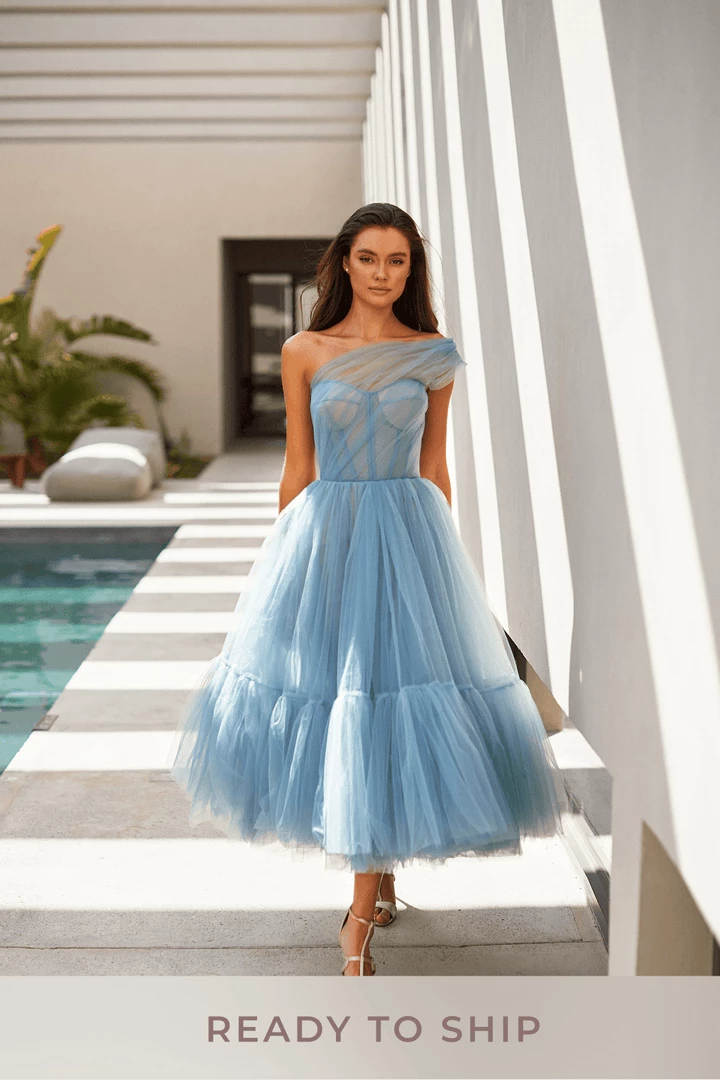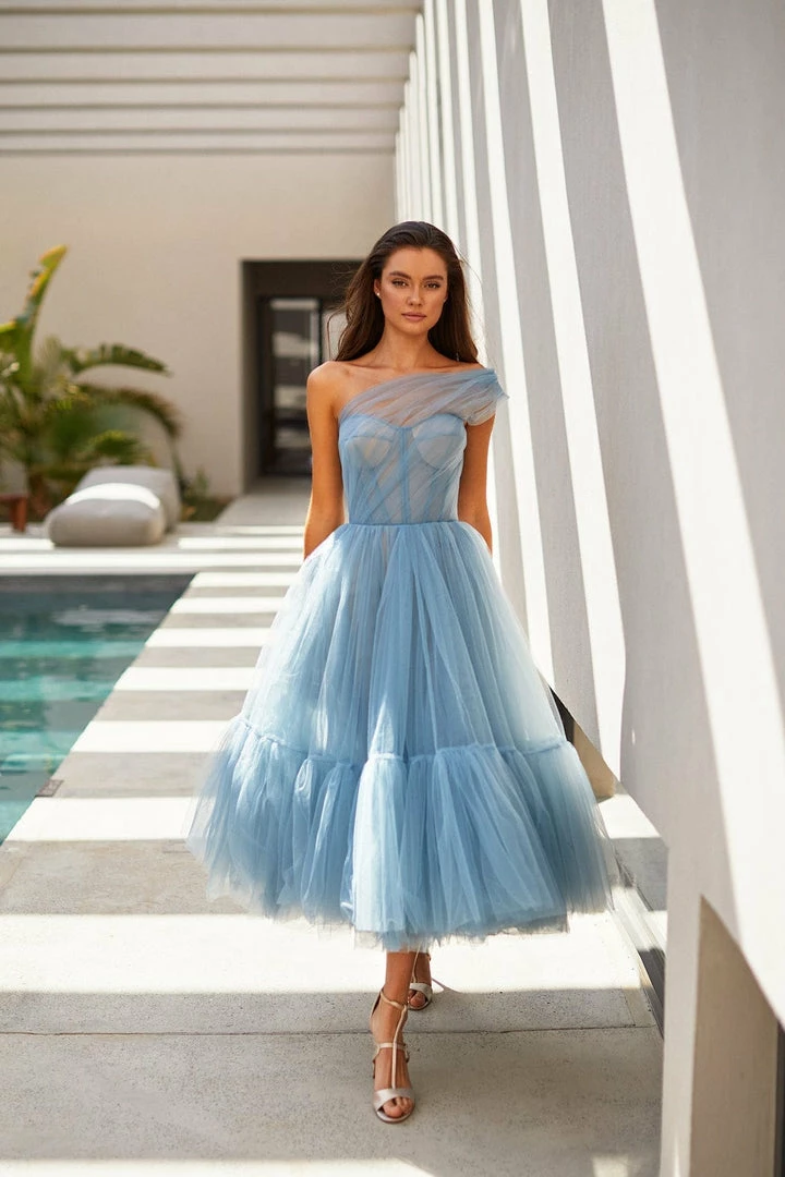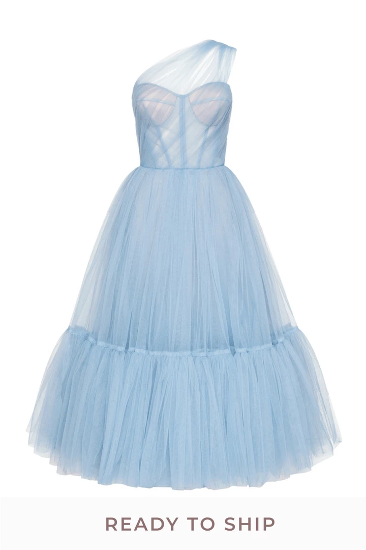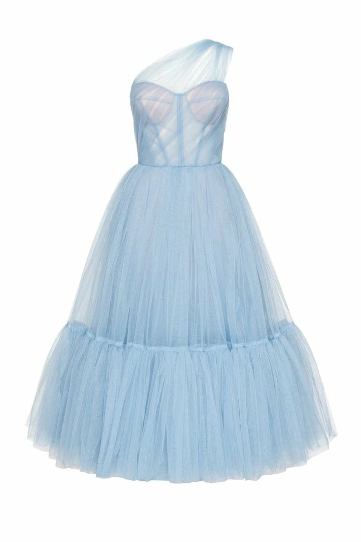 Feminine one-shoulder combination a-line midi dress with a semi-transparent corset bustier and tulle midi skirt.