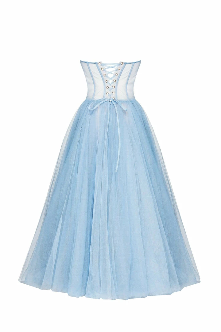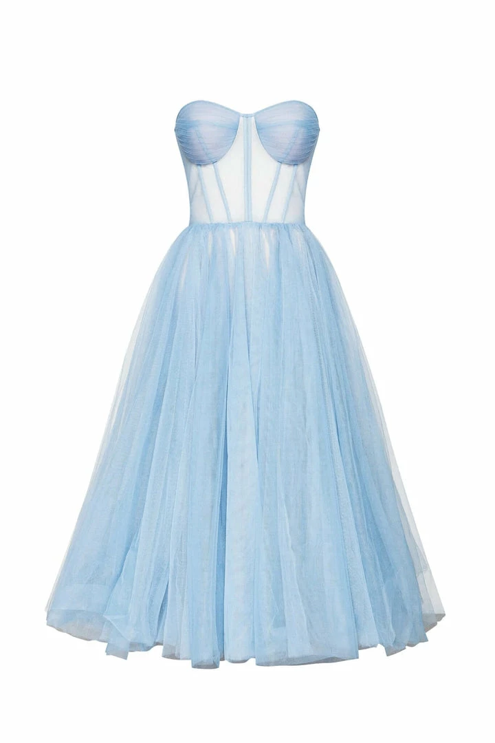 Dreamy combination tulle prom dress with a semi-transparent corset bustier and a puffy tulle midi skirt. This strapless midi dress is perfect for any occasion.