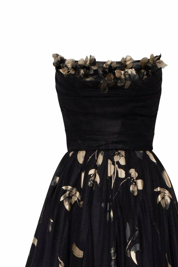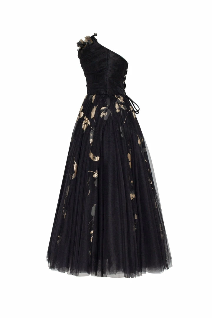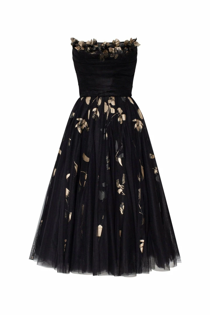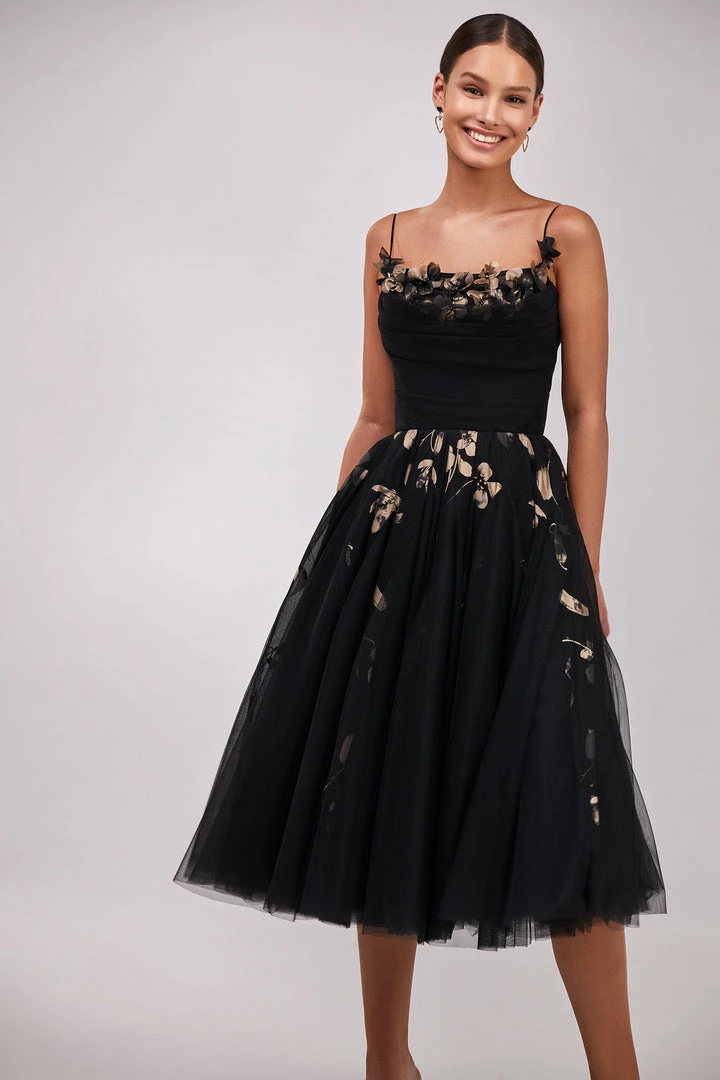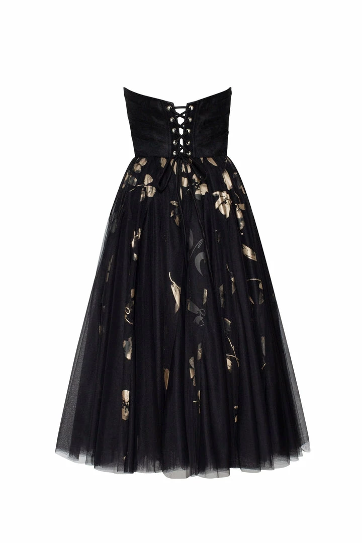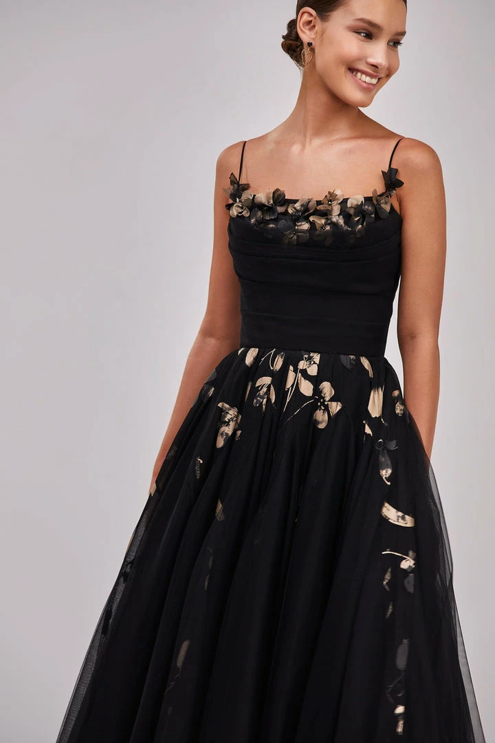 This classy midi black dress is our view on the iconic Coco Chanel “little black dress”. It is made of soft black tulle with golden floral patterns. The top of the dress is designed with spaghetti straps and a straight neckline decorated with tender floral appliqués. The fluffy knee-length skirt flatters all body types and creates an unforgettable hourglass look. Available in black.