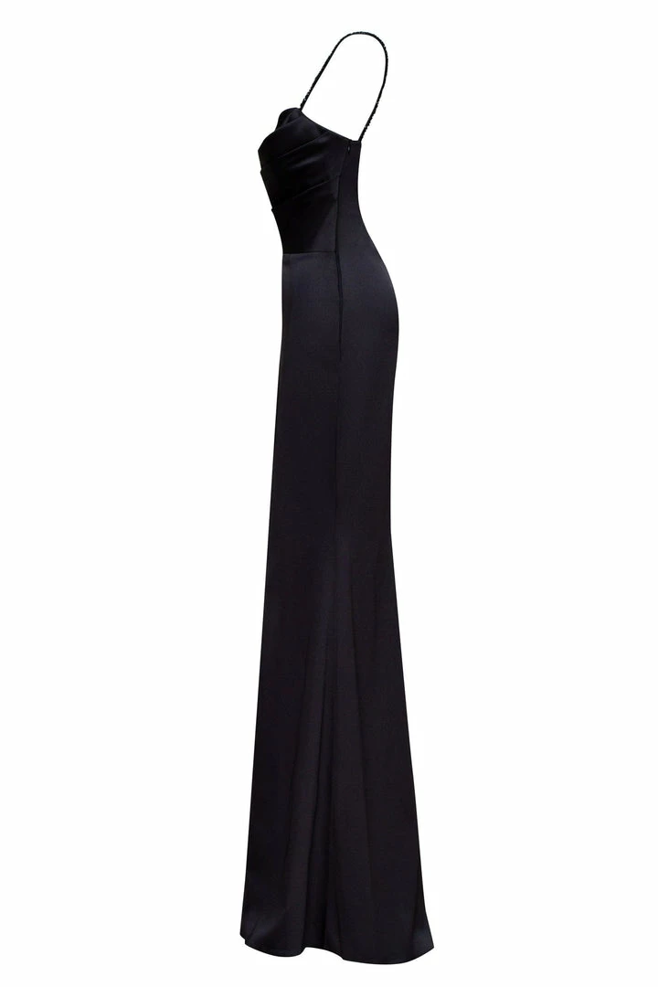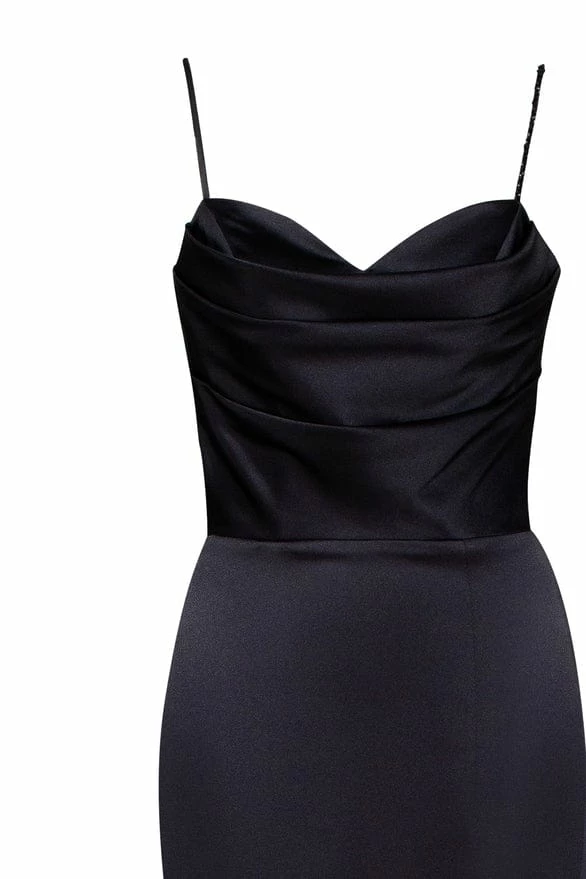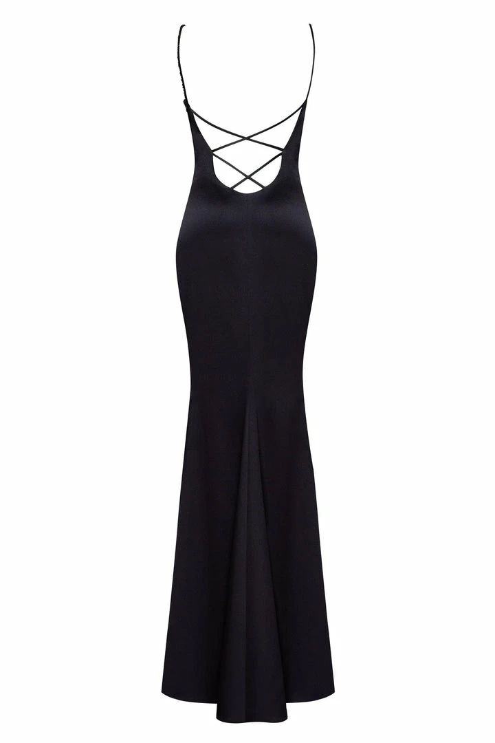 Elegant and classy evening dress gown in black. Features cross-open back and spaghetti strap neckline. Designed from the high-quality atlas with a gathered bodice at the front. Fits tight to the body. Has a high thigh slit at the front and a small train at the back.