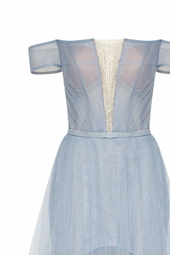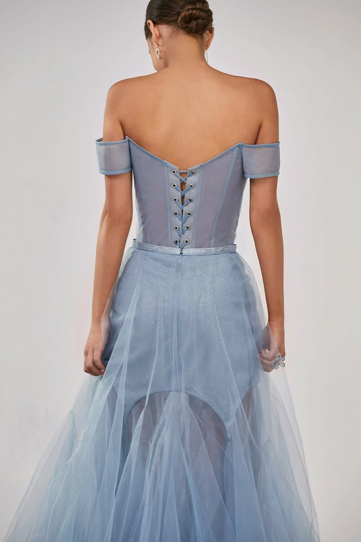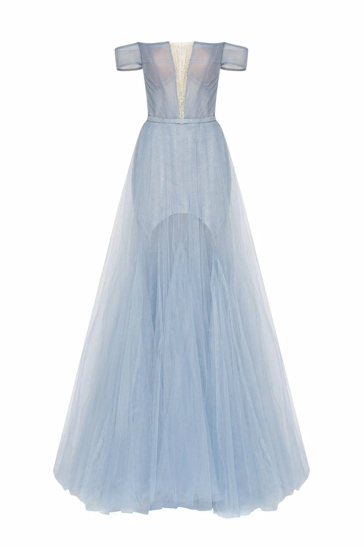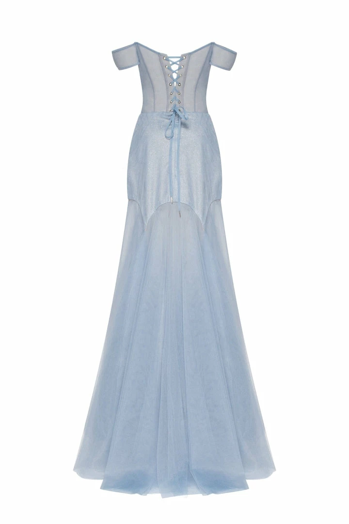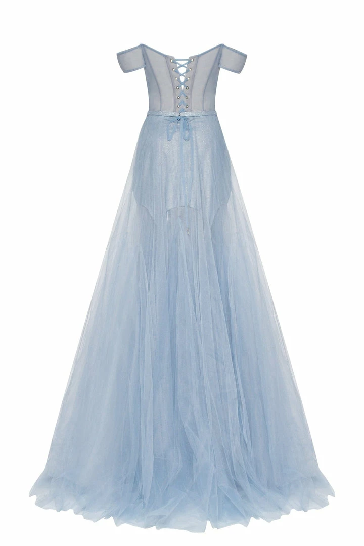 This elegant light blue evening gown is made of tender tulle fabric. It has an off-the-shoulder corset with built-in cups and lacing in the back. The plunging neckline is covered by the transparent tulle material which is decorated with sparkling shiny rhinestones. The lightweight maxi skirt has a mini underskirt. This gorgeous dress is able to make you look like a princess.