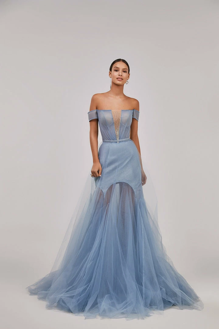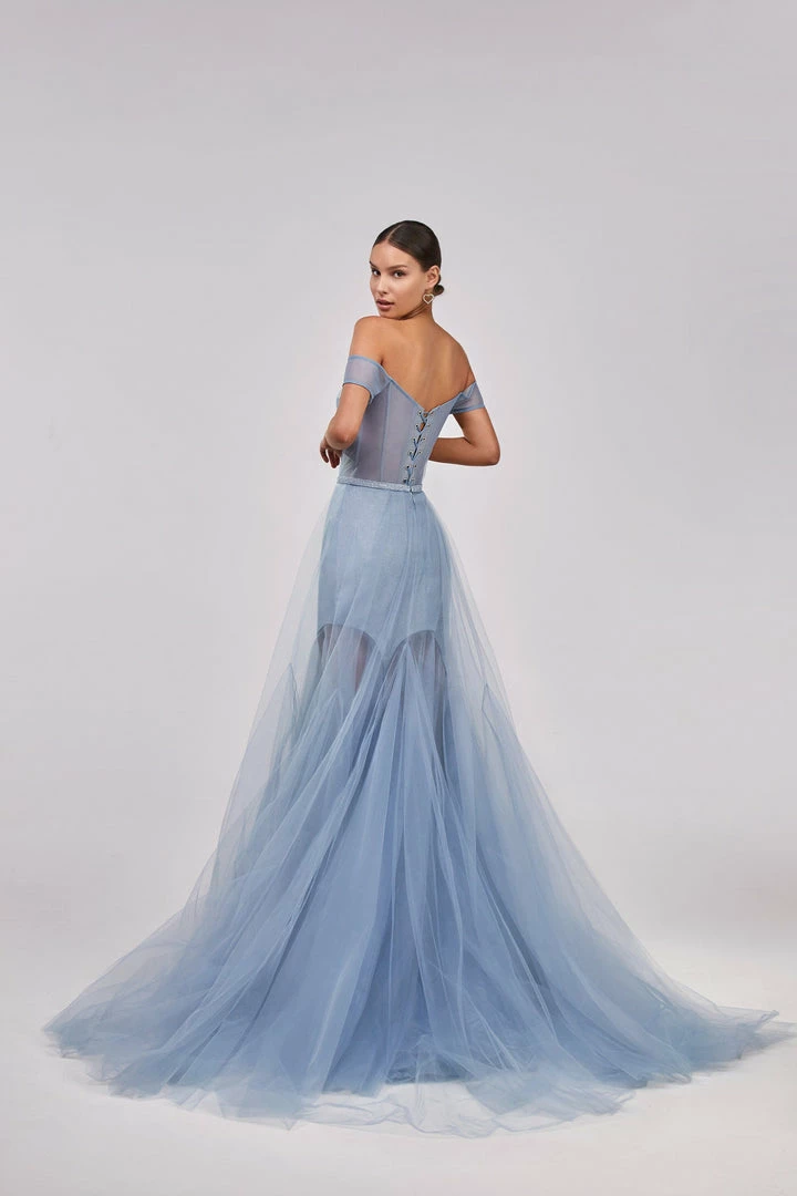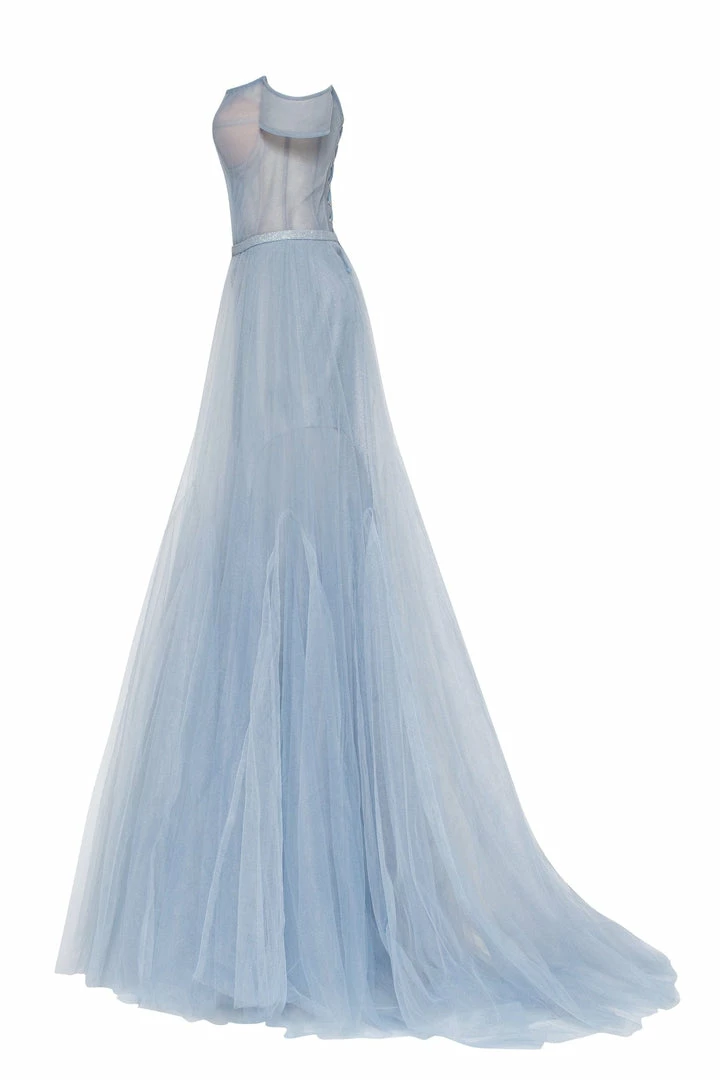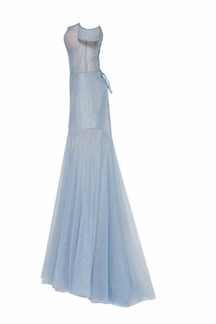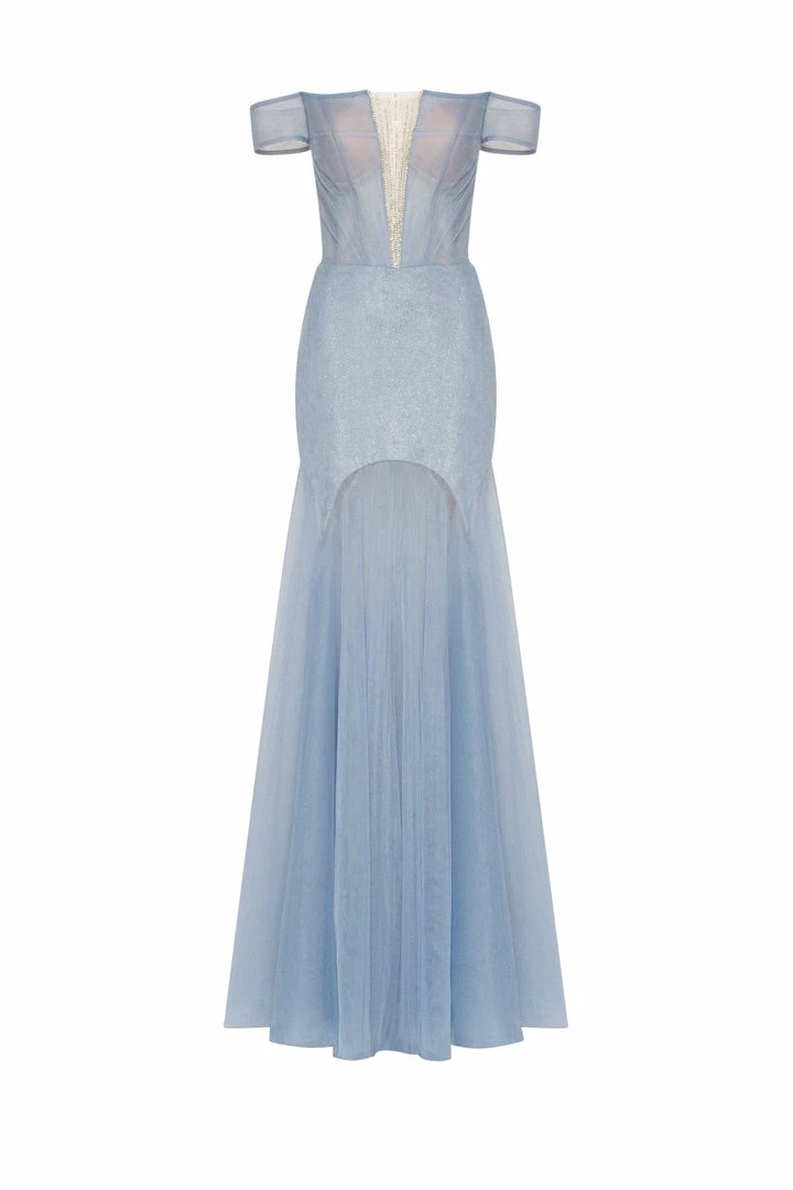 This elegant light blue evening gown is made of tender tulle fabric. It has an off-the-shoulder corset with built-in cups and lacing in the back. The plunging neckline is covered by the transparent tulle material which is decorated with sparkling shiny rhinestones. The lightweight maxi skirt has a mini underskirt. This gorgeous dress is able to make you look like a princess.