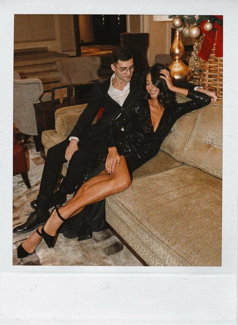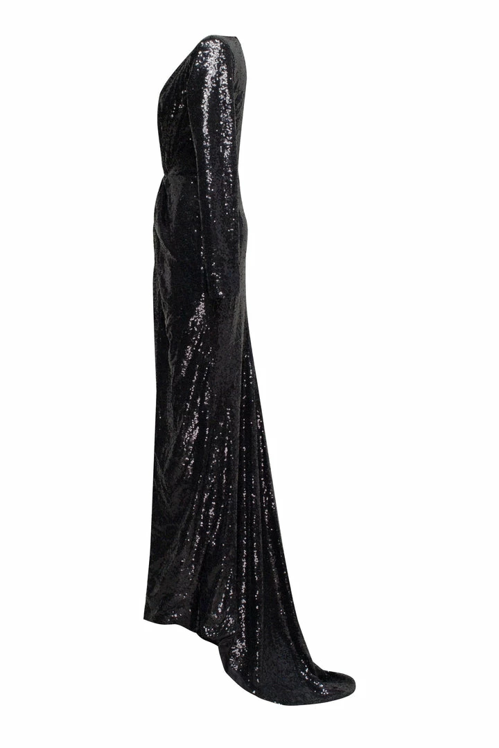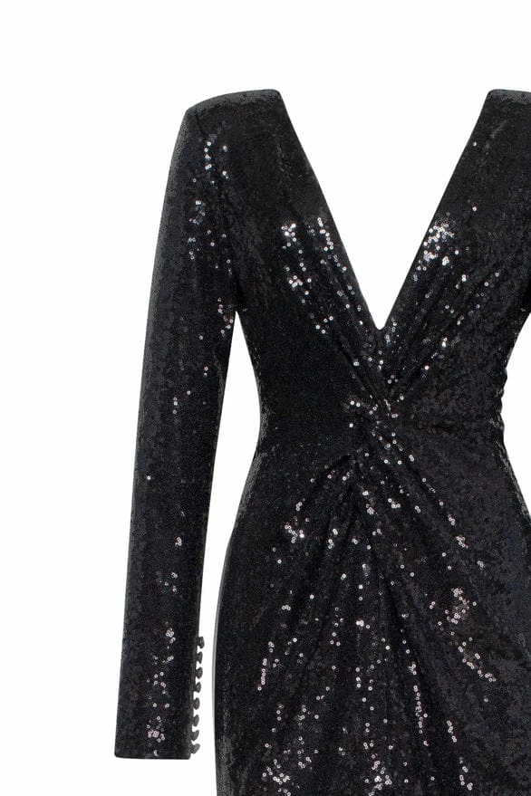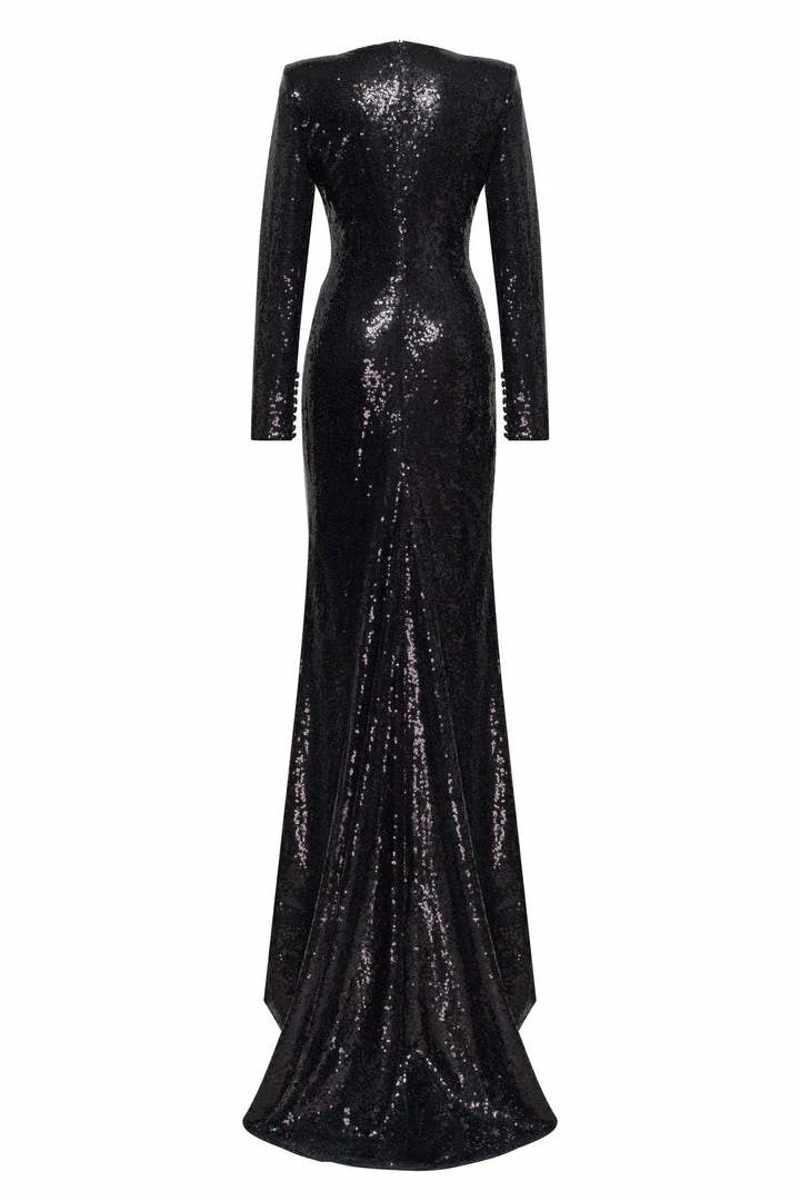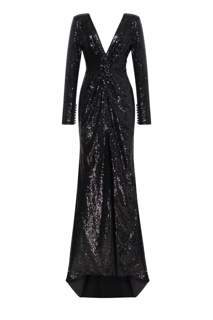 Long evening cut out maxi dress designed from sequins. Features closed-back, plunging neckline, and long sleeves. Fits the body perfectly and has a slit in the middle.