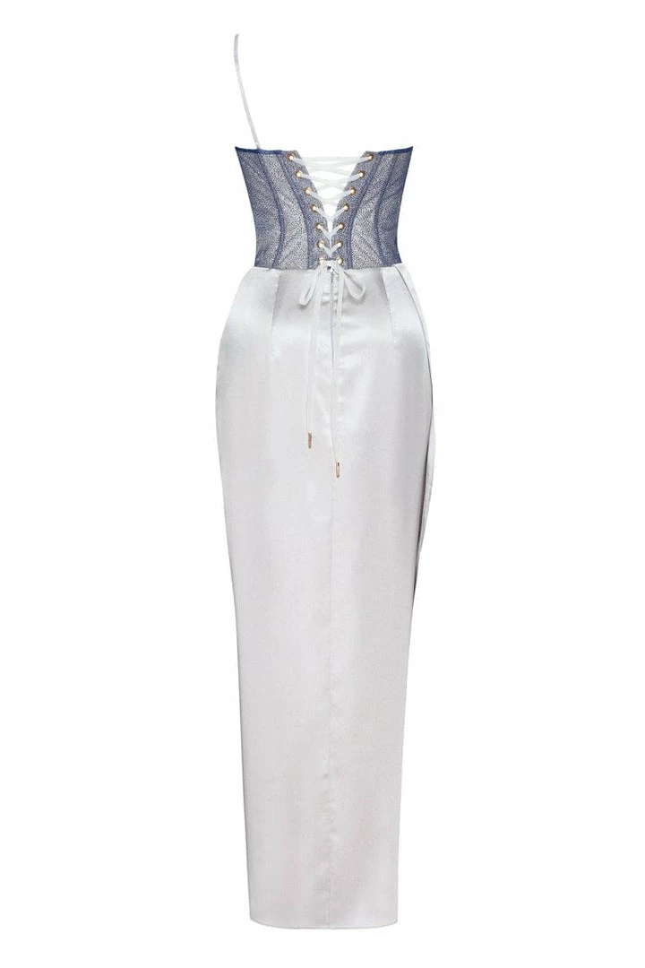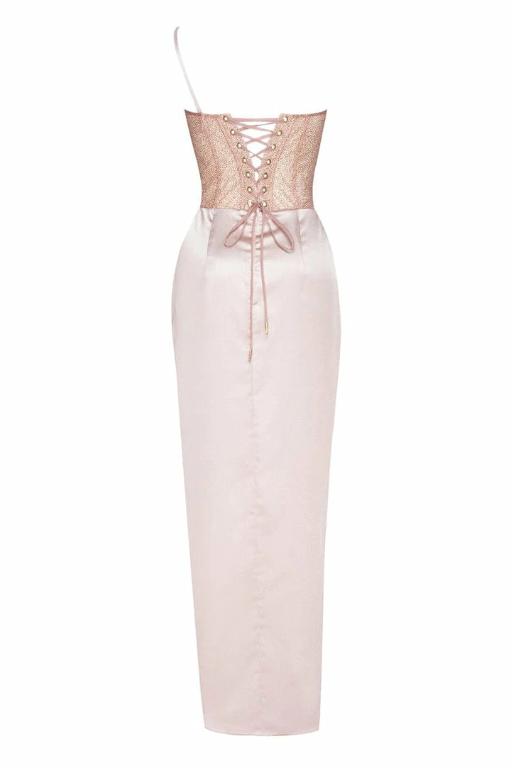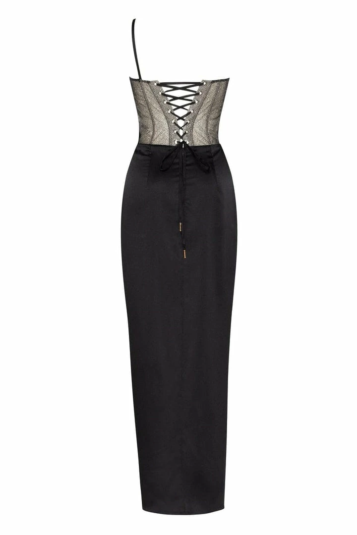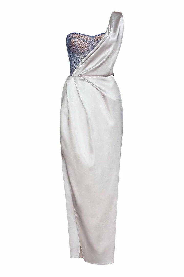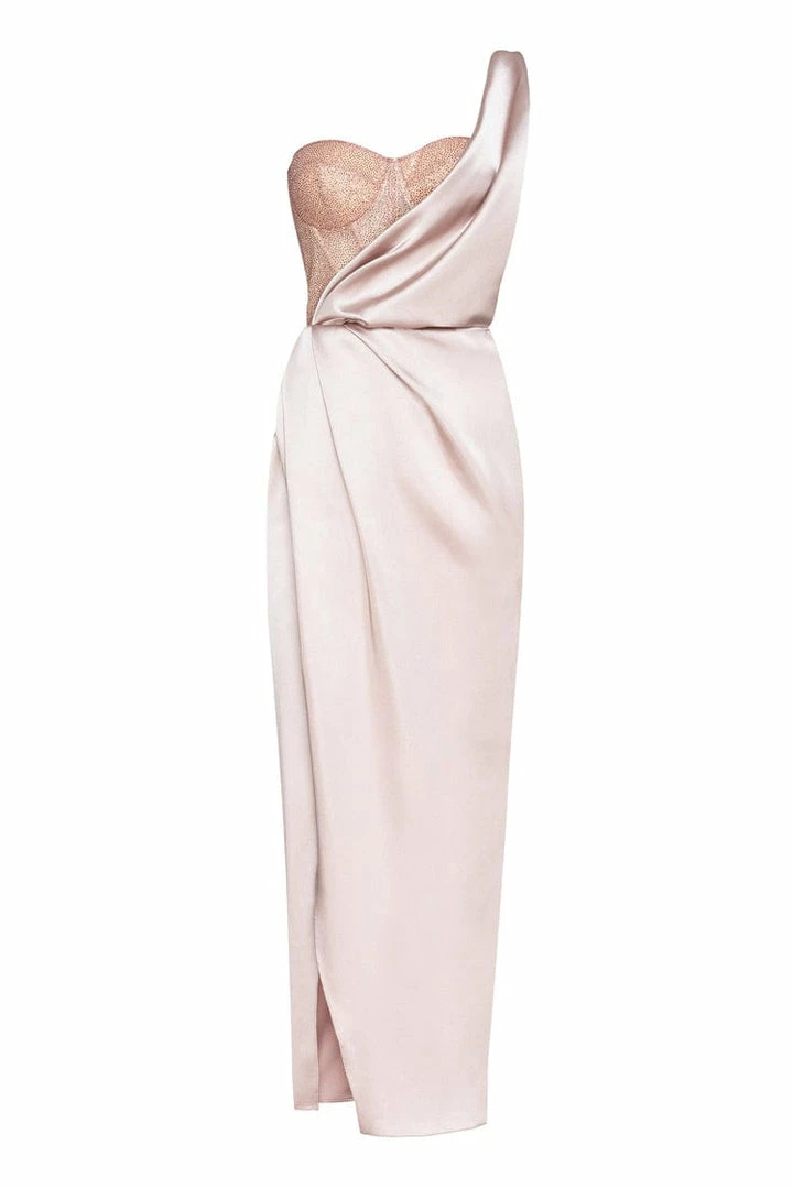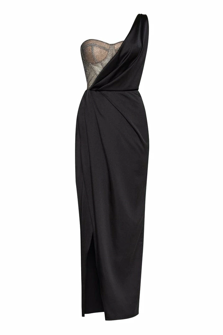 Chic one-shoulder party dress. Features a draped pencil skirt with a front slit and a sequin strapless corset bodice.