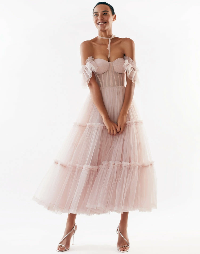 Combination off-the-shoulder cocktail tulle dress with a semi-transparent corset bustier and partially lined tulle midi skirt.