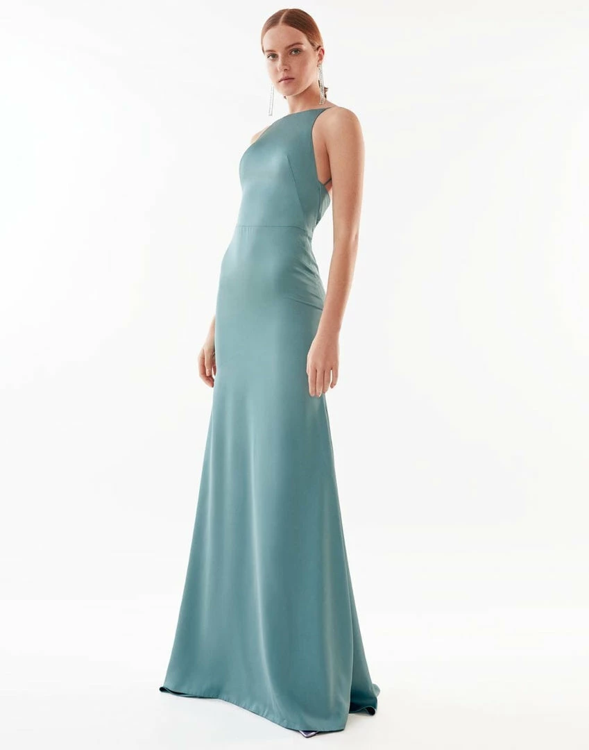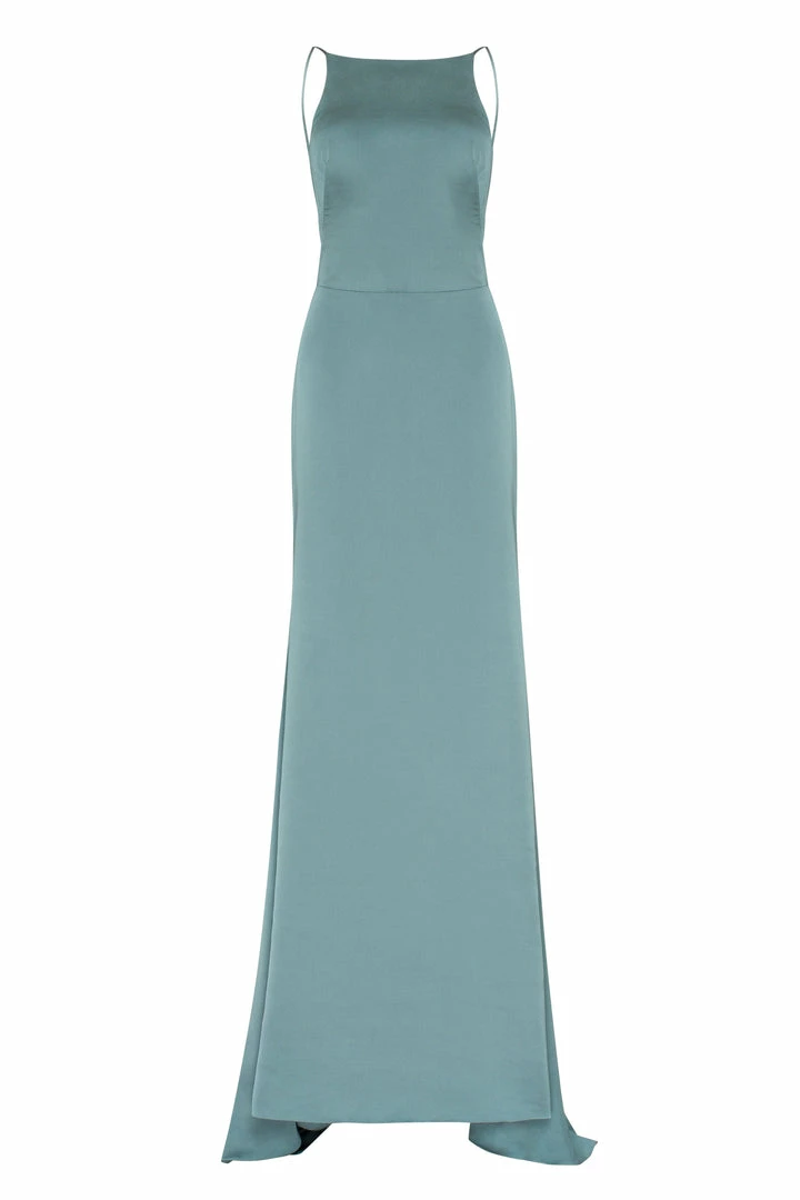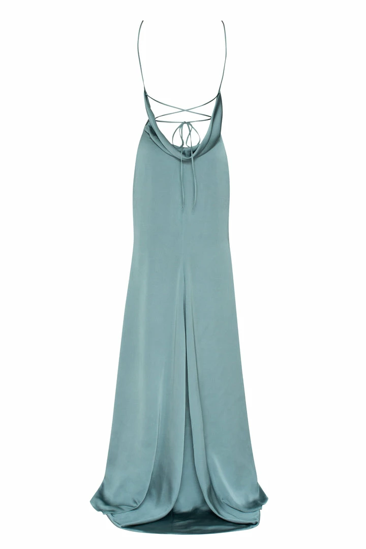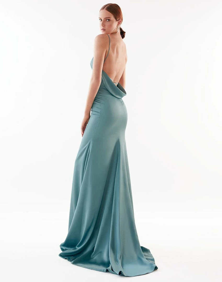 Mock neck sleeveless evening dress with a criss-cross open back and a maxi skirt with flaring mermaid hem.