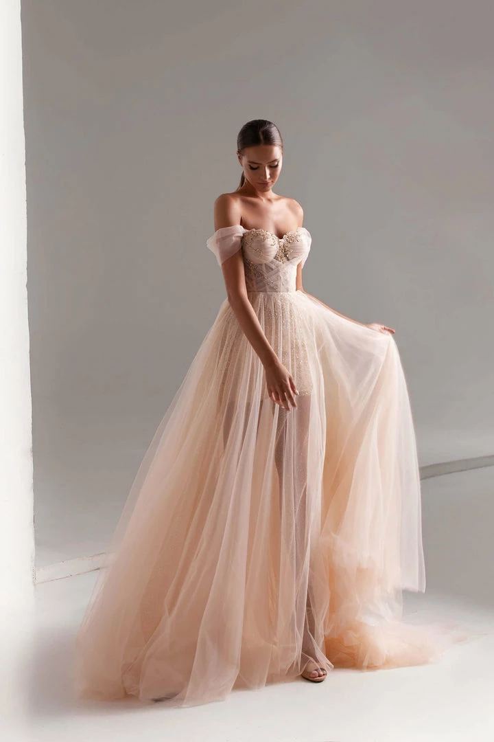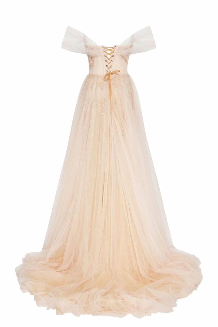Graceful off-the-shoulder evening tulle prom dress, embellished with sequins and beading. Features a full semi-transparent overlay skirt and a lace-up closure bodice.