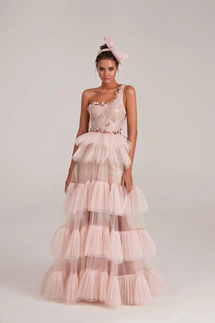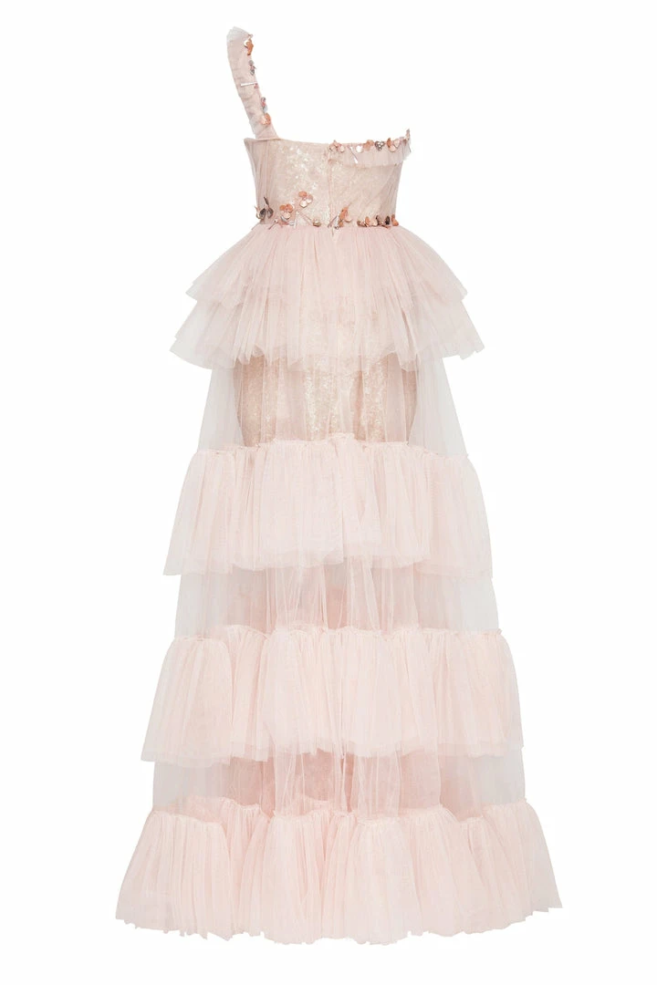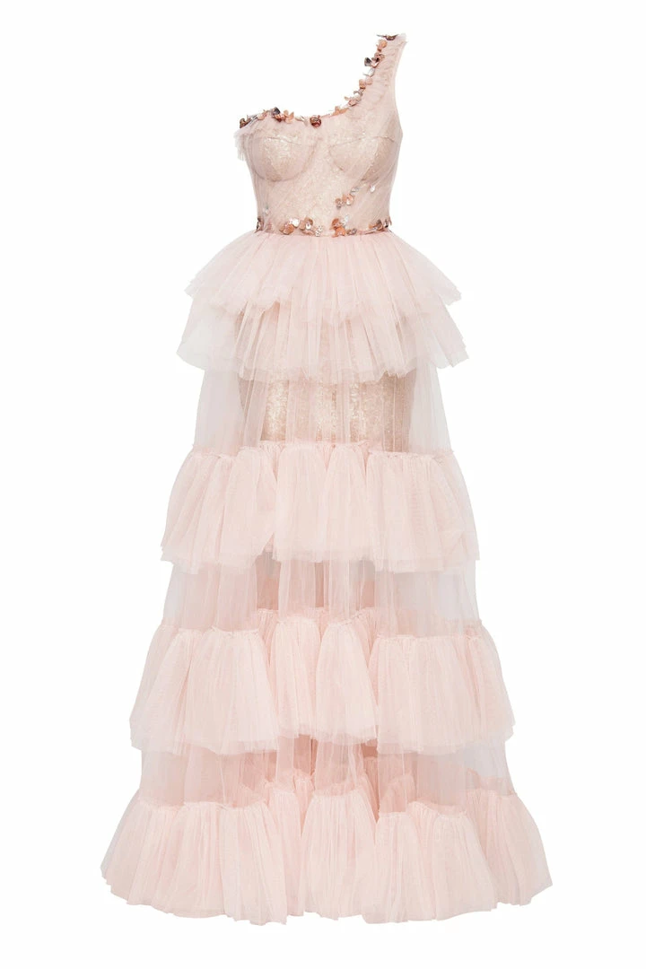 One-shoulder tulle dress with a corset bodice embellished with palettes and beading. Features a semi-transparent ruffled overlay skirt and a matching underskirt.