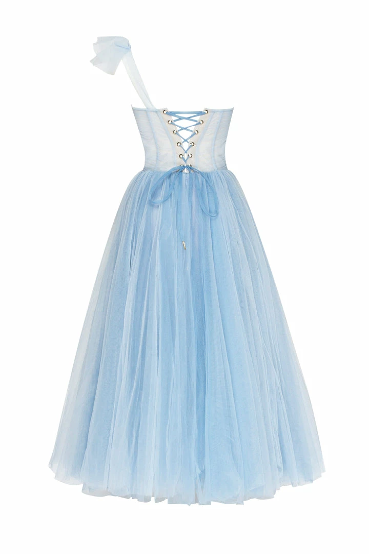 Combination one-shoulder cocktail tulle sky blue dress with a semi-transparent ruched corset bustier and ruffled midi skirt.