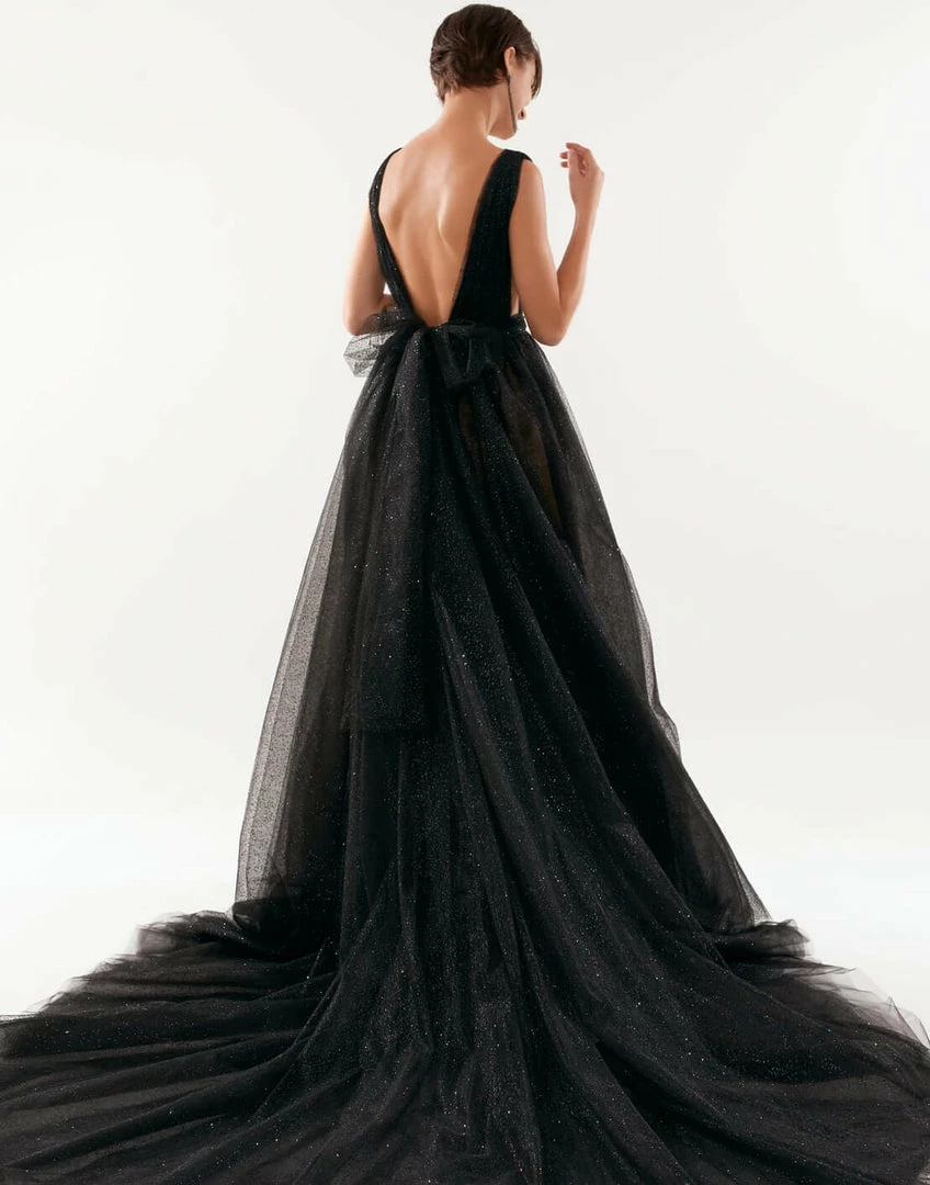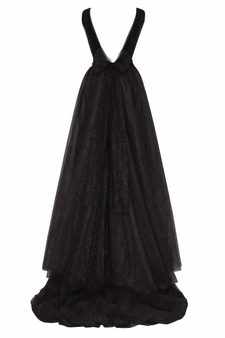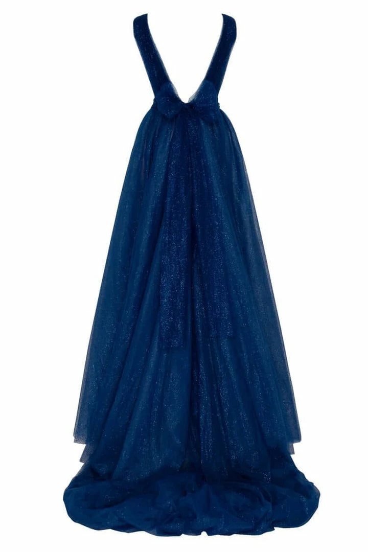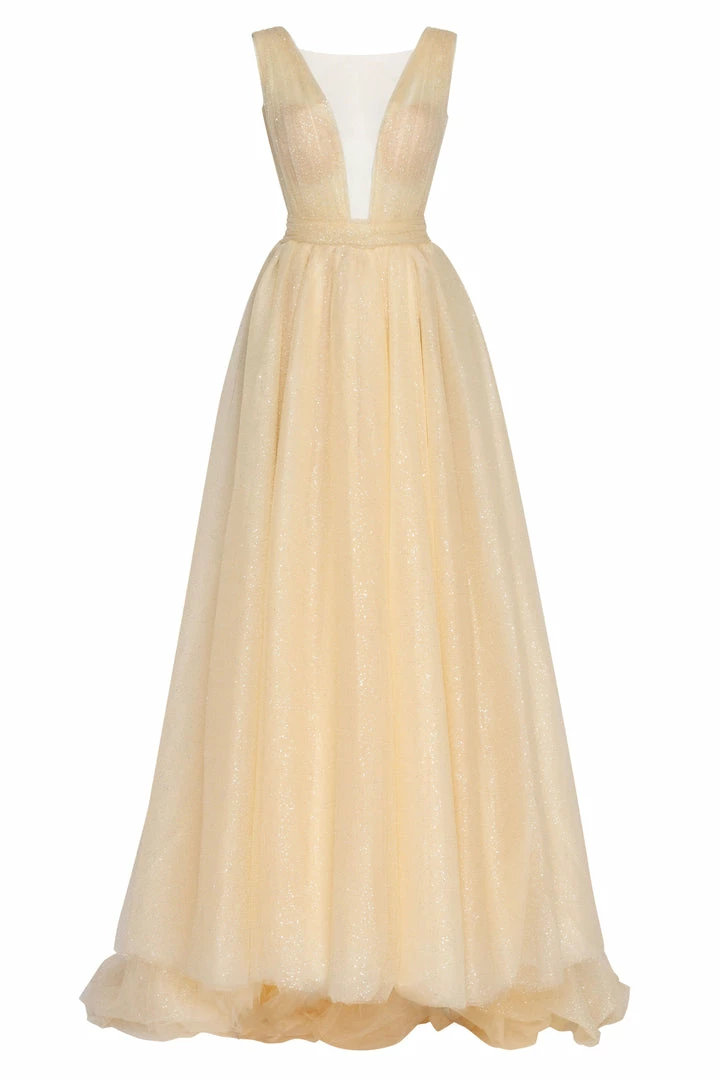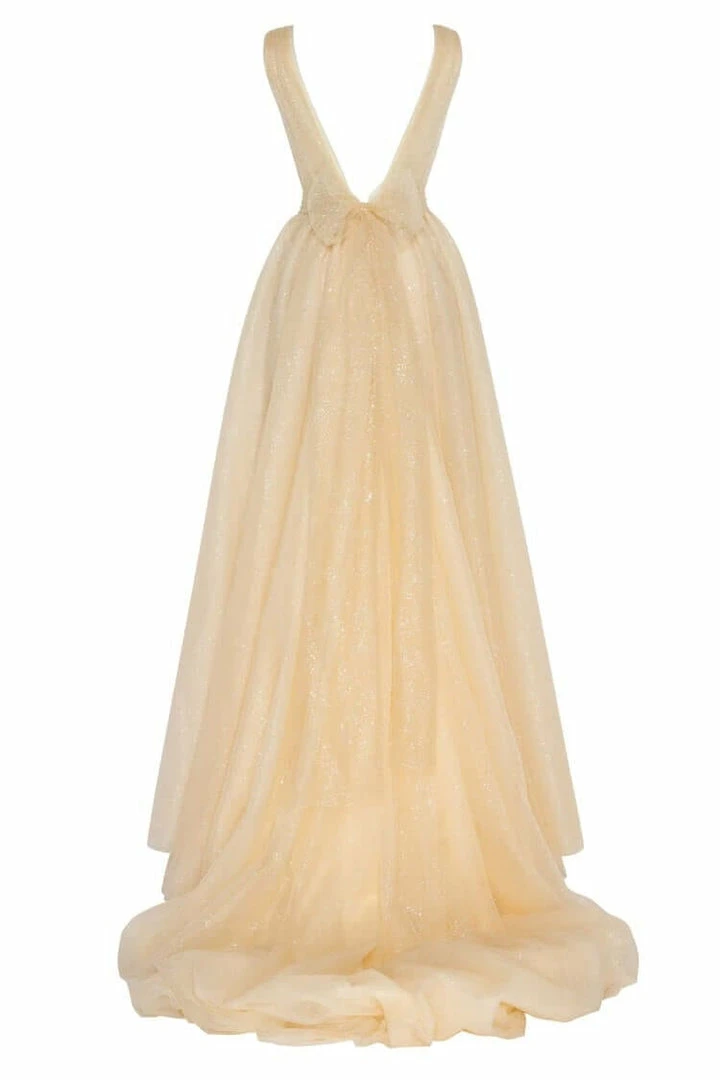 Chic sparkly maxi evening tulle dress. Features a glitter fabric, plunging neckline, an open back, a bow-back detail, and a long train. The gold dress is perfect to wear for New Year and Christmas parties.
