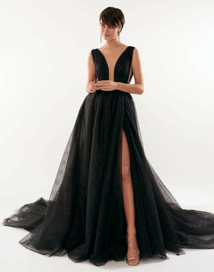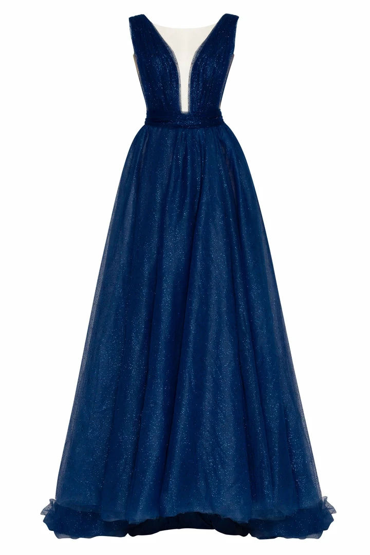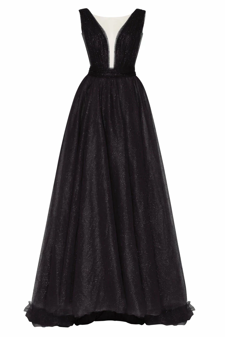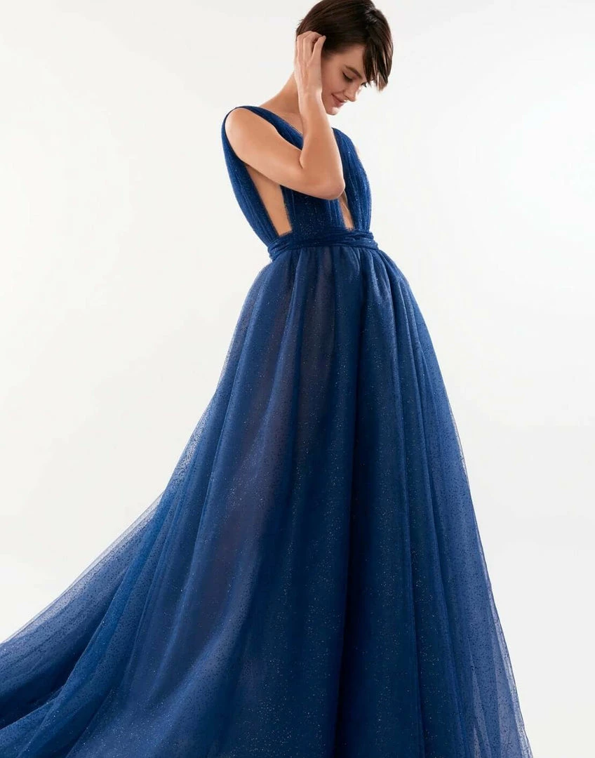 Chic sparkly maxi evening tulle dress. Features a glitter fabric, plunging neckline, an open back, a bow-back detail, and a long train. The gold dress is perfect to wear for New Year and Christmas parties.