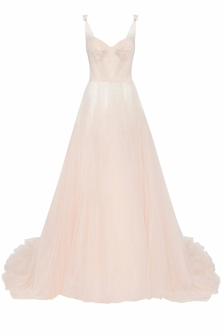 The delicate ball tulle dress is in peach color. Fitted at the bust, features an embellished lace-up corset and built-in cups; a semi-transparent overlay tulle skirt, and a matching short pink underskirt. The dress has a train in length of 200 cm from the waistline approximately.